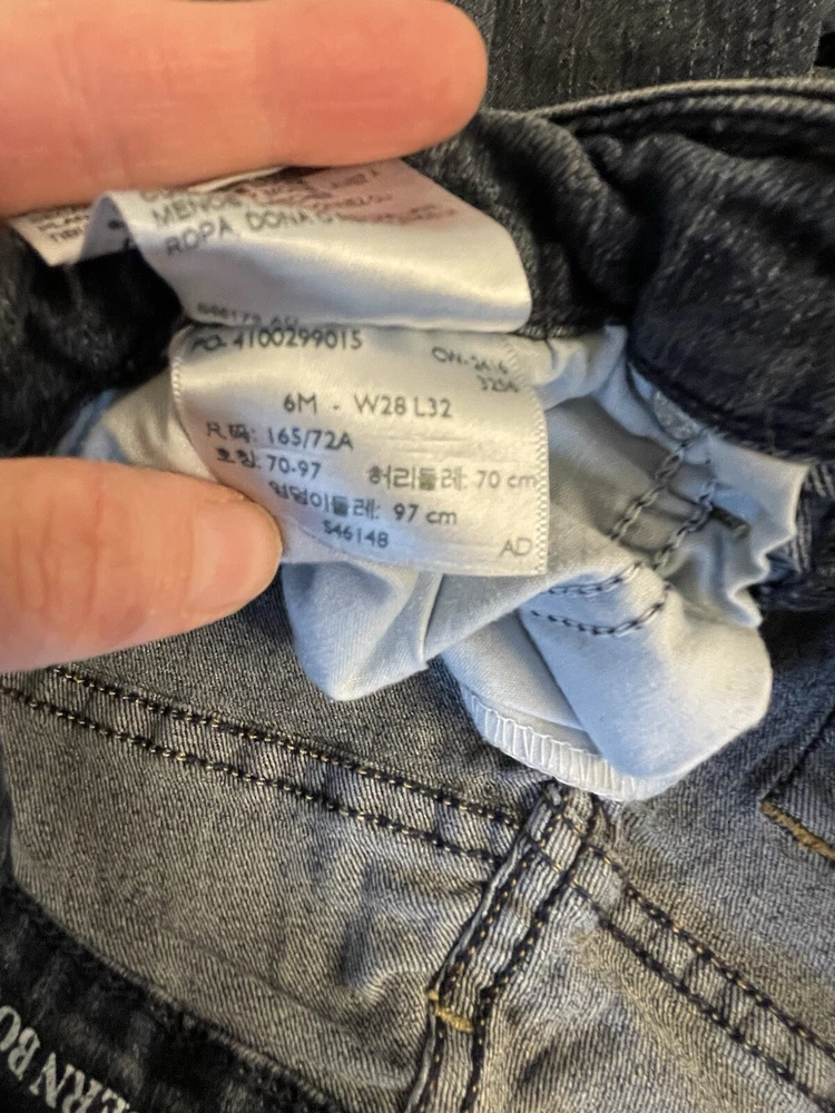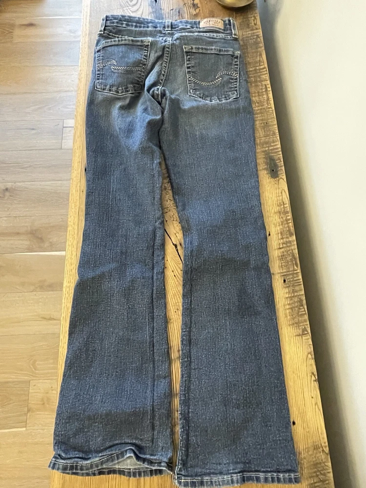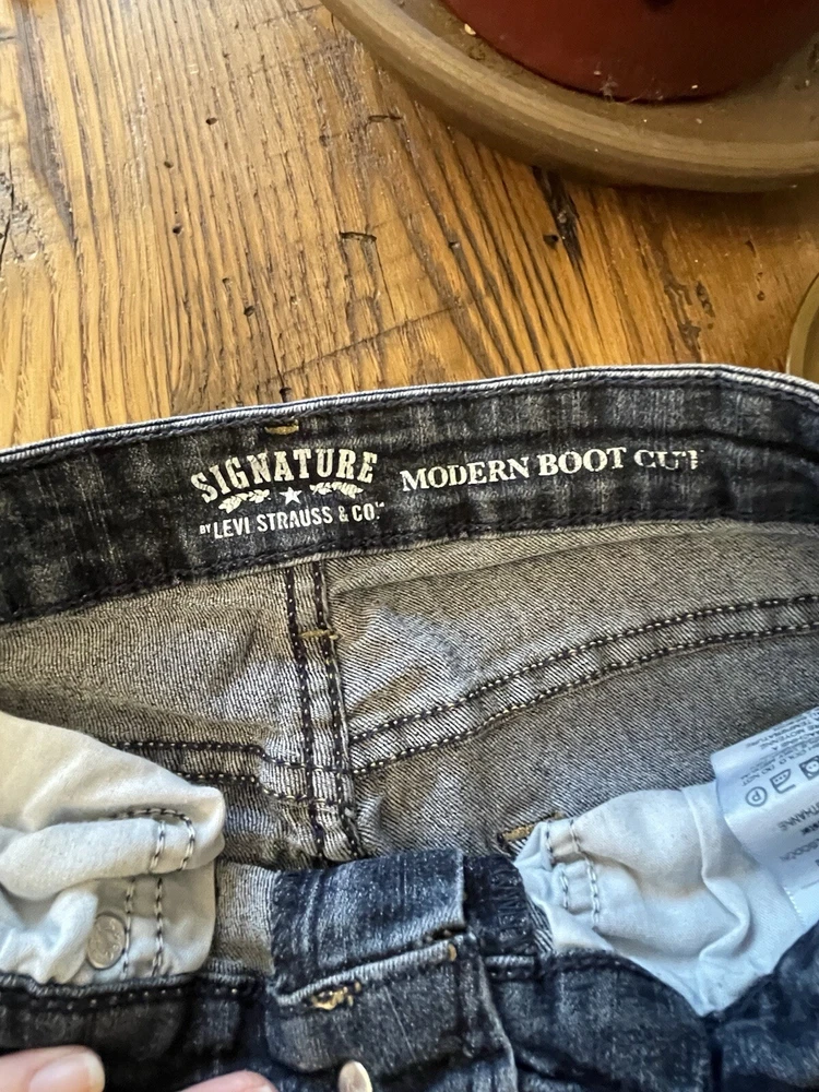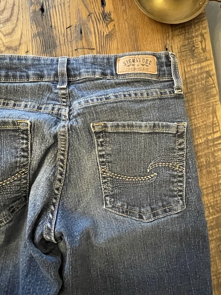 Pattern: Solid Inseam: 32 in Waist Size: 28 in Style: Boot Cut Jeans Features: Stretch Size Type: Regular Color: Blue UPC: Does Not Apply Material: Cotton Blend Country/Region of Manufacture: Pakistan gtin13: Does Not Apply Rise: Mid rise (8.5-10.5 in) Department: Women Size: 6 Fabric Type: Denim Type: Jeans Fabric Wash: Medium Brand: Signature by Levi Strauss & Co. Closure: Zipper