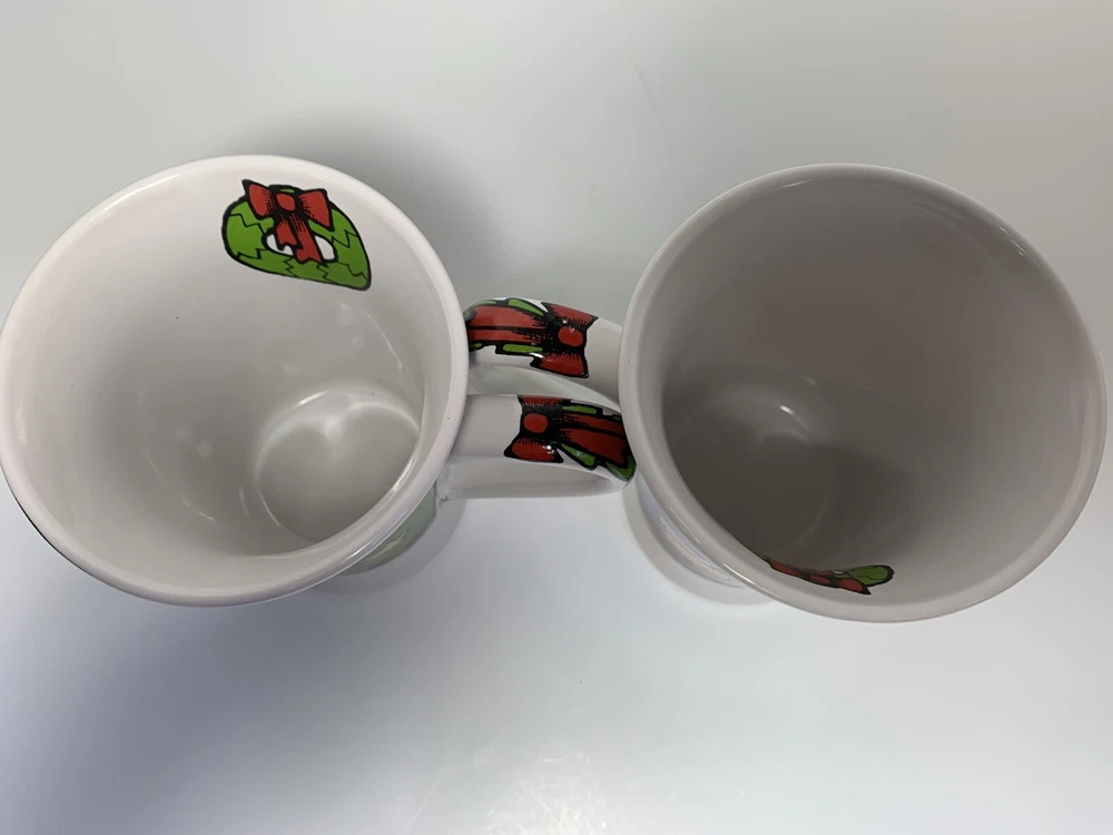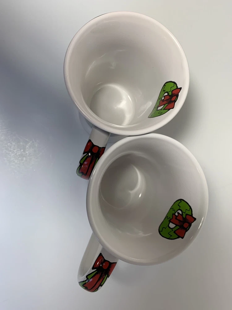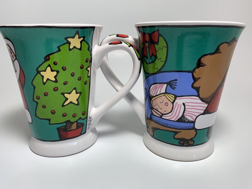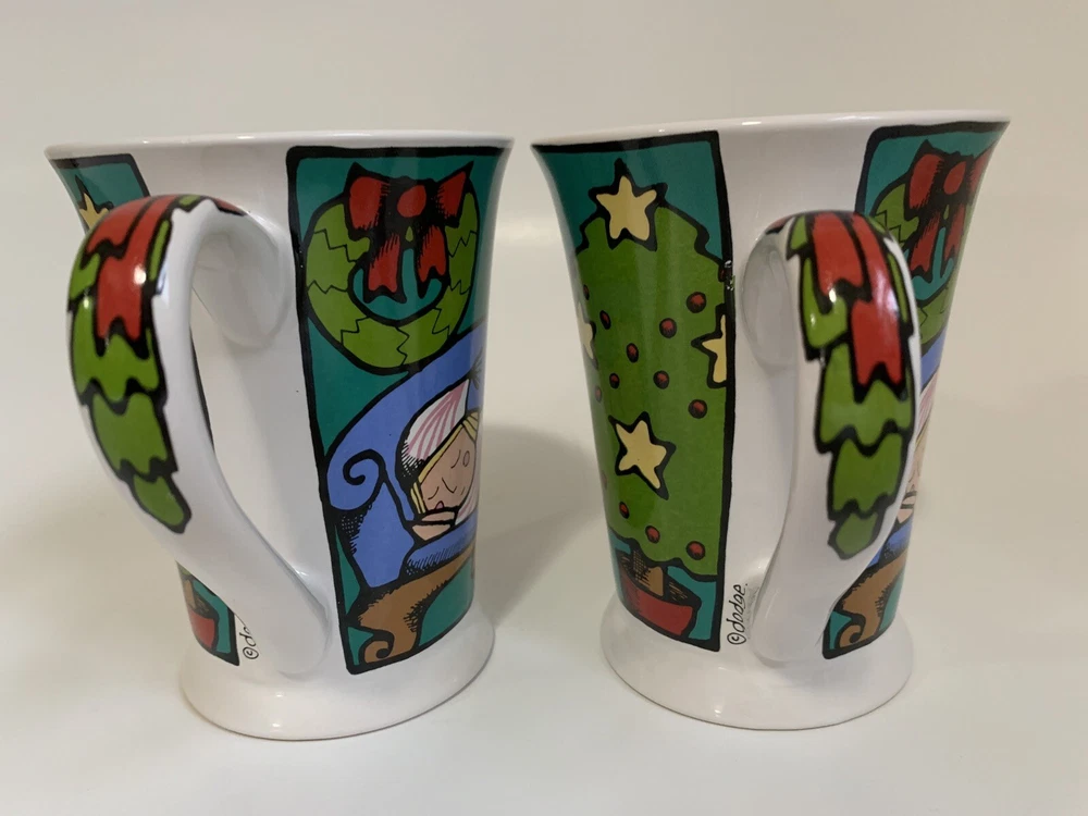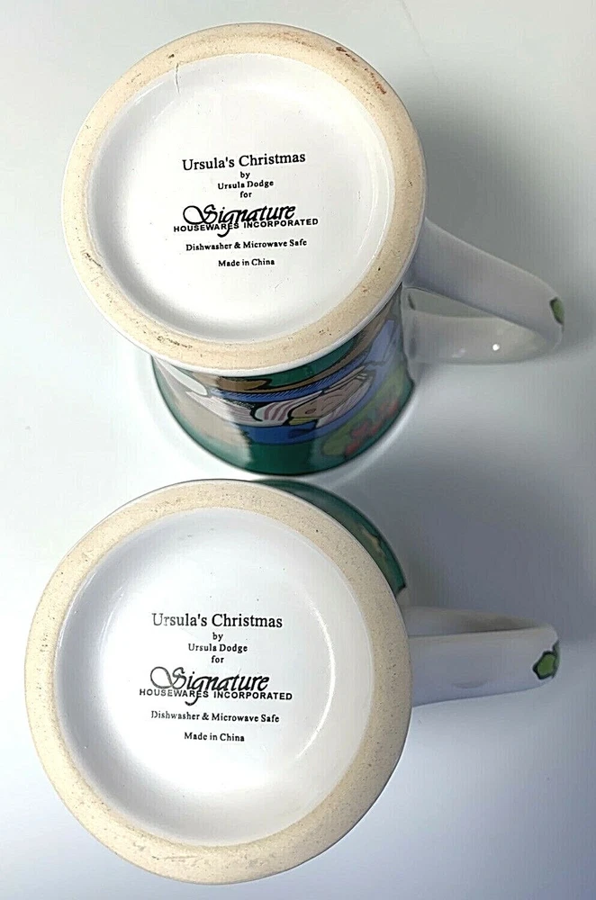 2 Collectible Christmas Mugs by Ursula's Christmas for Signature Housewares, Inc. Features Santa with sack, sleeping child, Christmas tree, Wreaths (outside and inside of mug & swag with ribbon on mug handle. Approximately 4 & 1/2" tall and 3 & 1/2" across top of mug (not including handle, with handle 5" across top of mug. Holds 10 ounces liquid poured all the way to top. If you have questions, please contact me.