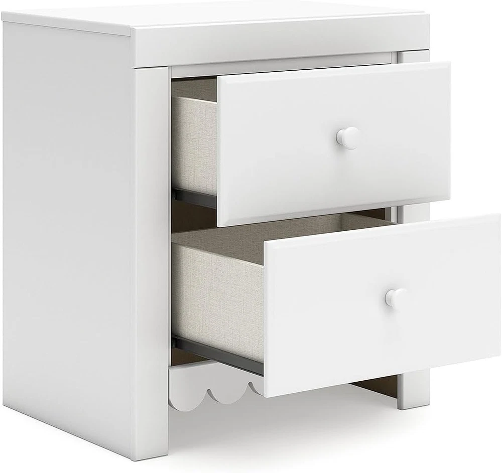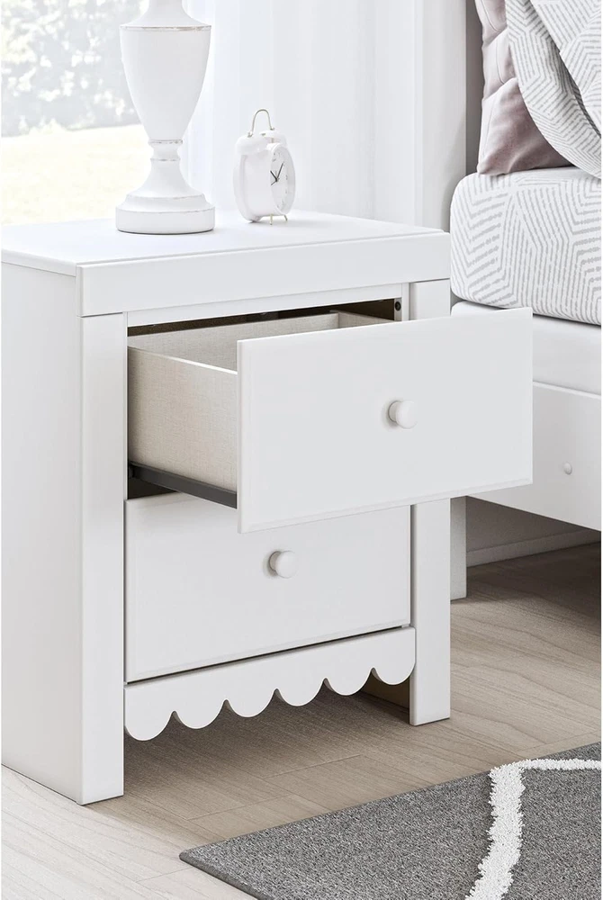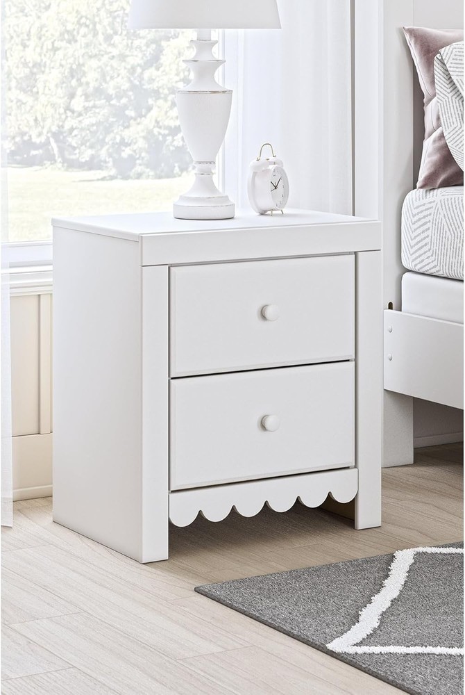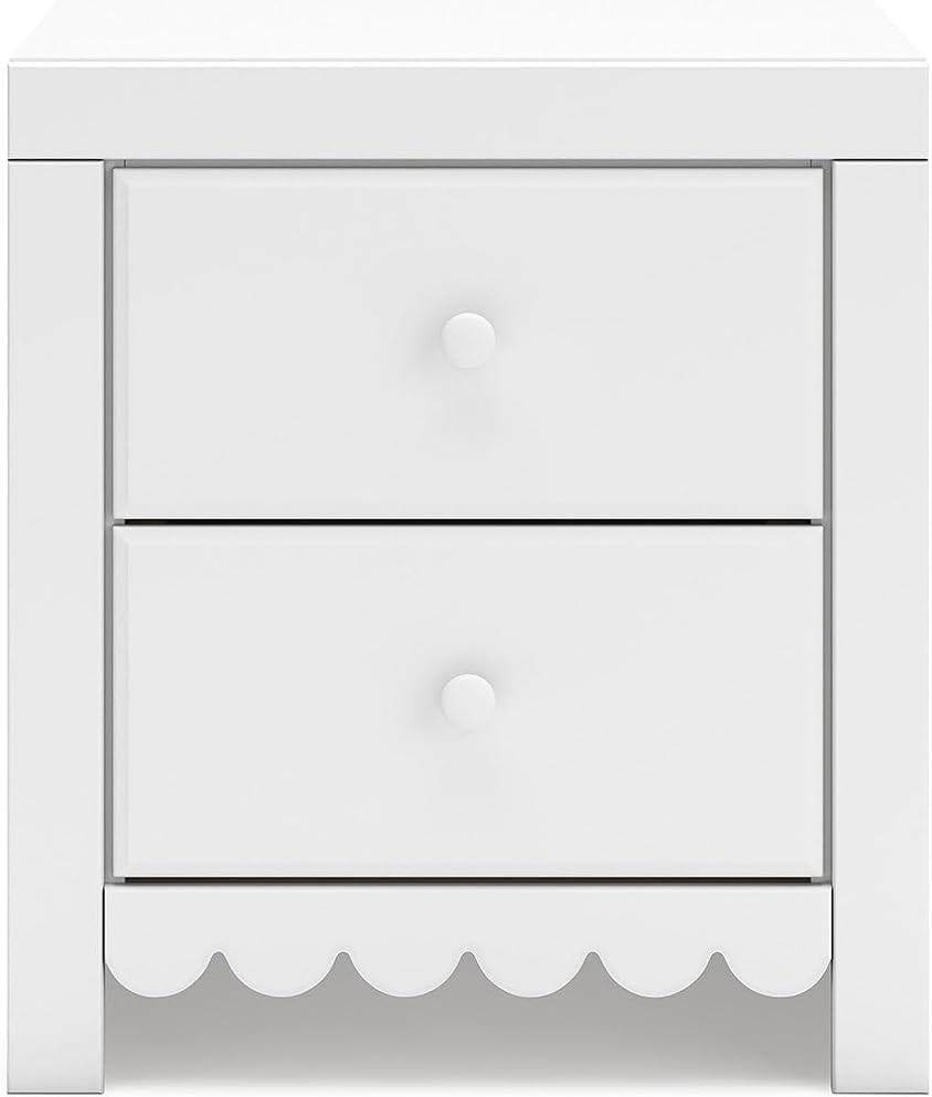 Signature Design by Ashley Mollviney Minimalist 2 Drawer White Scallop Product Details Brand: Signature Design by Ashley Product Dimensions: 15.31"D x 21.69"W x 24.25"H Color: White Scallop Product Care Instructions: Wipe with Dry Cloth, Wipe with Damp Cloth Recommended Uses For Product: Displaying Item WeightFrame Material: 38 PoundsEngineered Wood Top Material TypeShape: Engineered WoodRectangular 2-DRAWER NIGHTSTAND: Charmingly cute with its scalloped detailing and crisp white finish, this nightstand with USB charging appeals to both her sense of playful whimsy and your love for modern design WELL MADE: Engineered wood & decorative laminate. Matte white finish. White knobs. 2 smooth-gliding drawers; interiors are lined with a faux linen laminate for a clean, finished look. USB charging ASHLEY NIGHTSTANDS: A night stand is a bedside essential. Whether you’re looking for a white nightstand, black nightstand or a nightstand with drawers, Ashley meets your bed side needs DIMENSIONS: This item measures 21.69" W x 15.31" D x 24.25" H MINOR ASSEMBLY: Minor assembly required. Easy-to-follow instructions and hardware included Make waking up or bedtime that much more magical with this nightstand. Charmingly cute with its scalloped detailing, it appeals to both her sense of playful whimsy and your love for modern design. The nightstand's included USB charging keeps devices or nightlights powered up. And its crisp white finish gives you the versatility to pair it with existing decor.