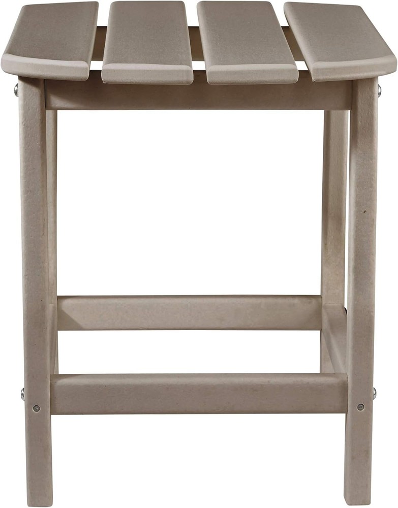 Signature Design by Ashley Sundown Treasure Outdoor Patio HDPE Weather Grey Product Details Brand: Signature Design by Ashley Product Dimensions: 15"D x 19"W x 18"H Color: Grey Product Care Instructions: Wipe with Dry Cloth Recommended Uses For Product: Outdoor storage and surface use Item WeightFrame Material: 9 PoundsPlastic Top Material TypeShape: Plastic/ResinSquare OUTDOOR END TABLE: Need a little extra storage outdoors? This end table is just the thing you need with a design that weathers all the seasons and a slatted top for extra style DURABLE DESIGN: Made of virgin high density polyethylene (hard plastic) material with a textured grain finish. Designed to shed rainwater easily TRENDY NEUTRAL: The textured grain in a grayish brown strikes such a stylish pose anywhere it's placed. Paired with your favorite decor accent or a pitcher of lemonade, this table's sure to please VERSATILE USE: Measuring 19" W x 15" D x 18" H, this side table is great set on any patio, deck or pool area ASSEMBLY REQUIRED: Easy-to-follow instructions, hardware and tools included DIRECT FROM THE MANUFACTURER: Ashley Furniture goes the extra mile to package, protect and deliver your purchase in a timely manner BUY WITH CONFIDENCE: Designed and manufactured by Ashley Furniture Industries. The trusted source for stylish furniture, lighting, rugs, accessories and mattresses. For every taste and budget Add cottage-quaint charm to your outdoor oasis with this outdoor end table in grayish brown. Made of MEGA TUFF™ high-density polyethylene material, it’s sure to weather the seasons beautifully. Designed to shed rainwater, the table’s slatted top with gently rounded corners provides exceptional form and function. With a variety of styles and materials, accent tables can provide storage in a living room or give guests a spot to rest their drinks. They can add subtle drama to your decor by presenting a place for artwork, a lamp or a plant. We have a wide selection of coffee tables, console tables and occasional tables, from rustic farmhouse designs to modern openwork styles. They come in a multitude of sizes, too, so you will find one that fits just where you need it.
