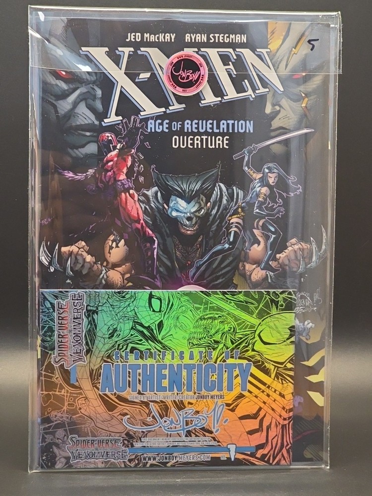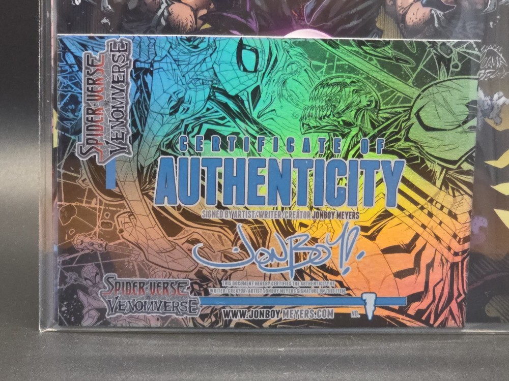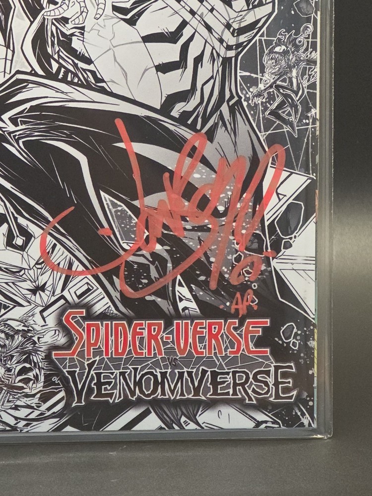 The product is a single black and white signed artist proof variant comic book titled "Year In Marvel '25 Spider-Verse Vs Venomverse" by artist Jonboy Meyers. This limited edition comic, featuring characters from the Marvel Universe, was released at New York Comic Con in 2025. The story explores the epic battle between the Spider-Verse and Venomverse superheroes, showcasing a unique black and white style that sets it apart from other comics in the genre. Signed by Jonboy Meyers, this collectible item is a must-have for any Marvel fan or comic book enthusiast.