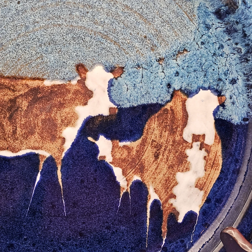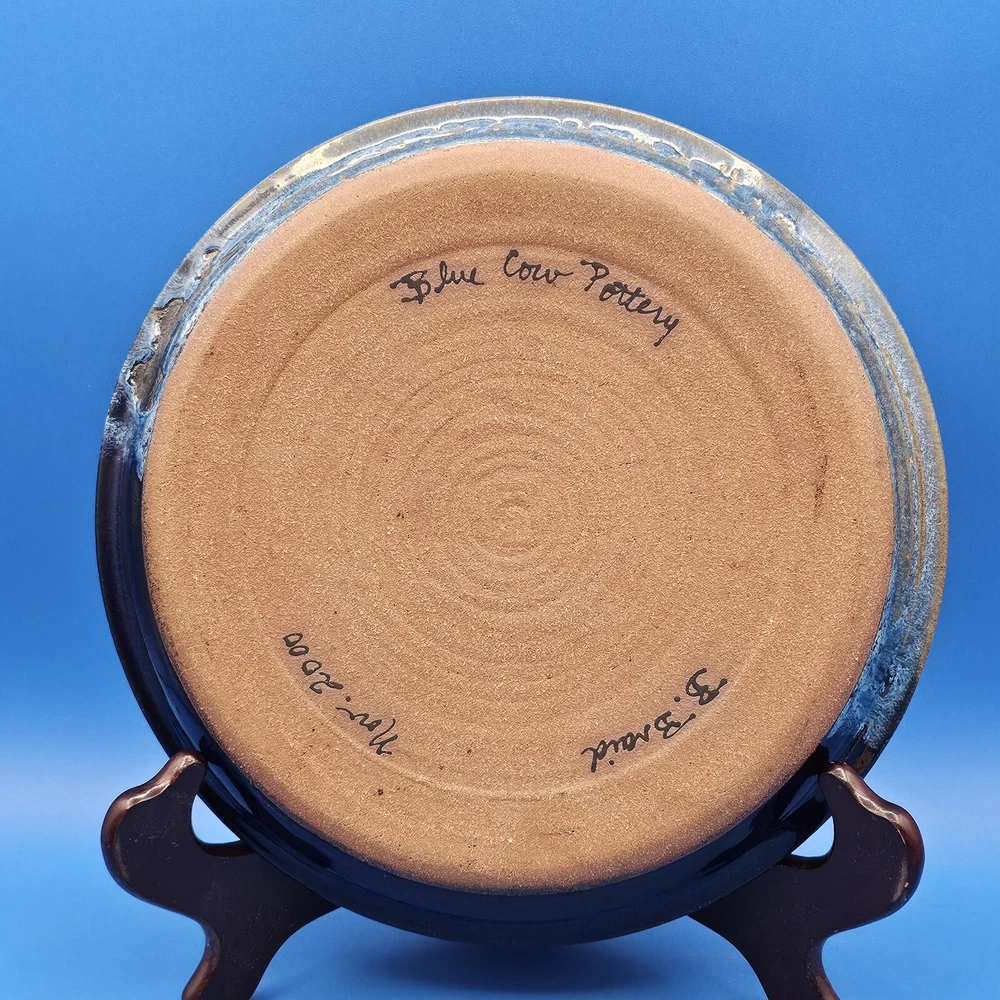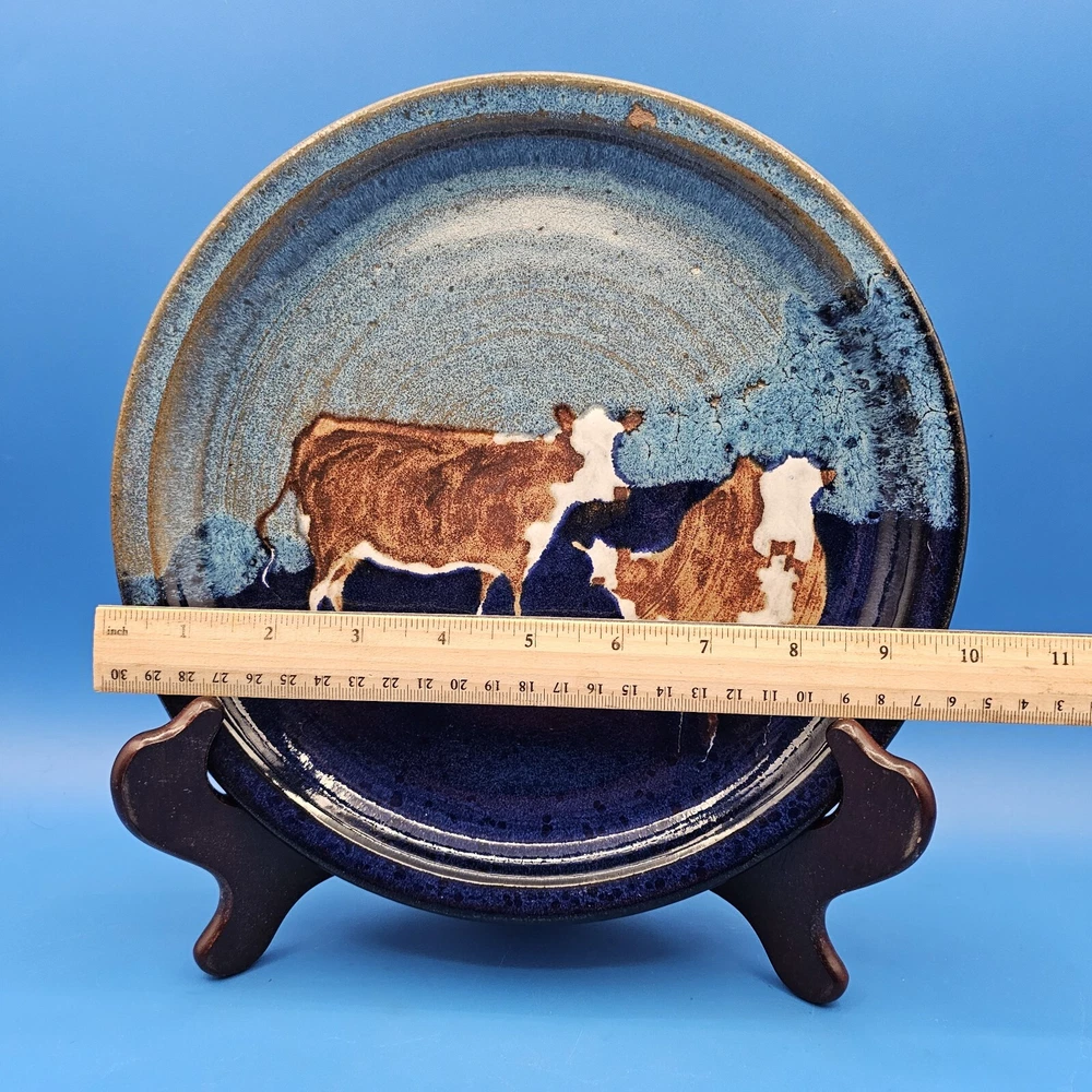 This beautiful 10-inch dinner plate from Blue Cow Pottery features a stunning drip glazed ceramic design with a cow pattern in blue color. The plate is handmade with clay material and has a glossy finish. It is a vintage item from the 2000s, but still in excellent condition. The plate is perfect for all occasions and adds a decorative touch to any table setting. Care instructions are included for hand washing only. This original, studio crafted plate is a one-piece set and weighs 1 lb 5 oz. It is a great addition to any collection and produced in the United States.