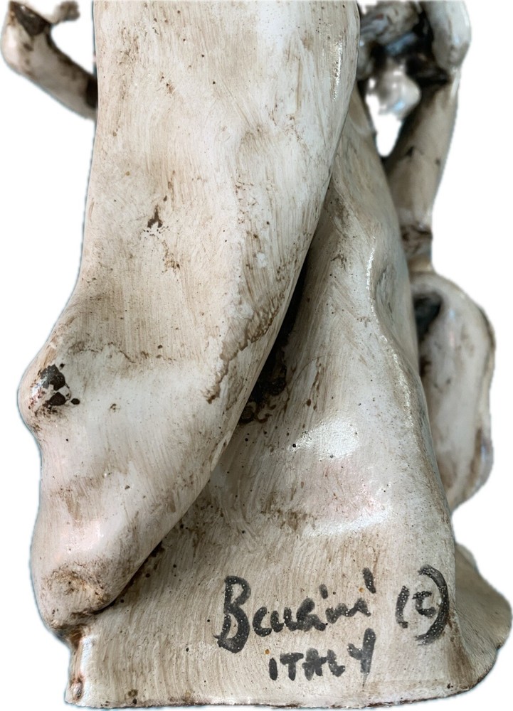 This exquisite sculpture by Dino Bencini depicts Moses holding the 10 Commandments in clay medium. The piece is signed by the artist and boasts an unknown style and production technique. The statue stands at 9.5 inches tall and 3.75 inches wide, making it a perfect addition to any collection. The sculpture is an original piece and is not a licensed reproduction. The item is located in Italy and is perfect for art collectors and enthusiasts alike. See pictures for condition of sculpture. There is cracking on the bottom of the right foot which does not affect the piece. This may have occurred during the sculpting process.