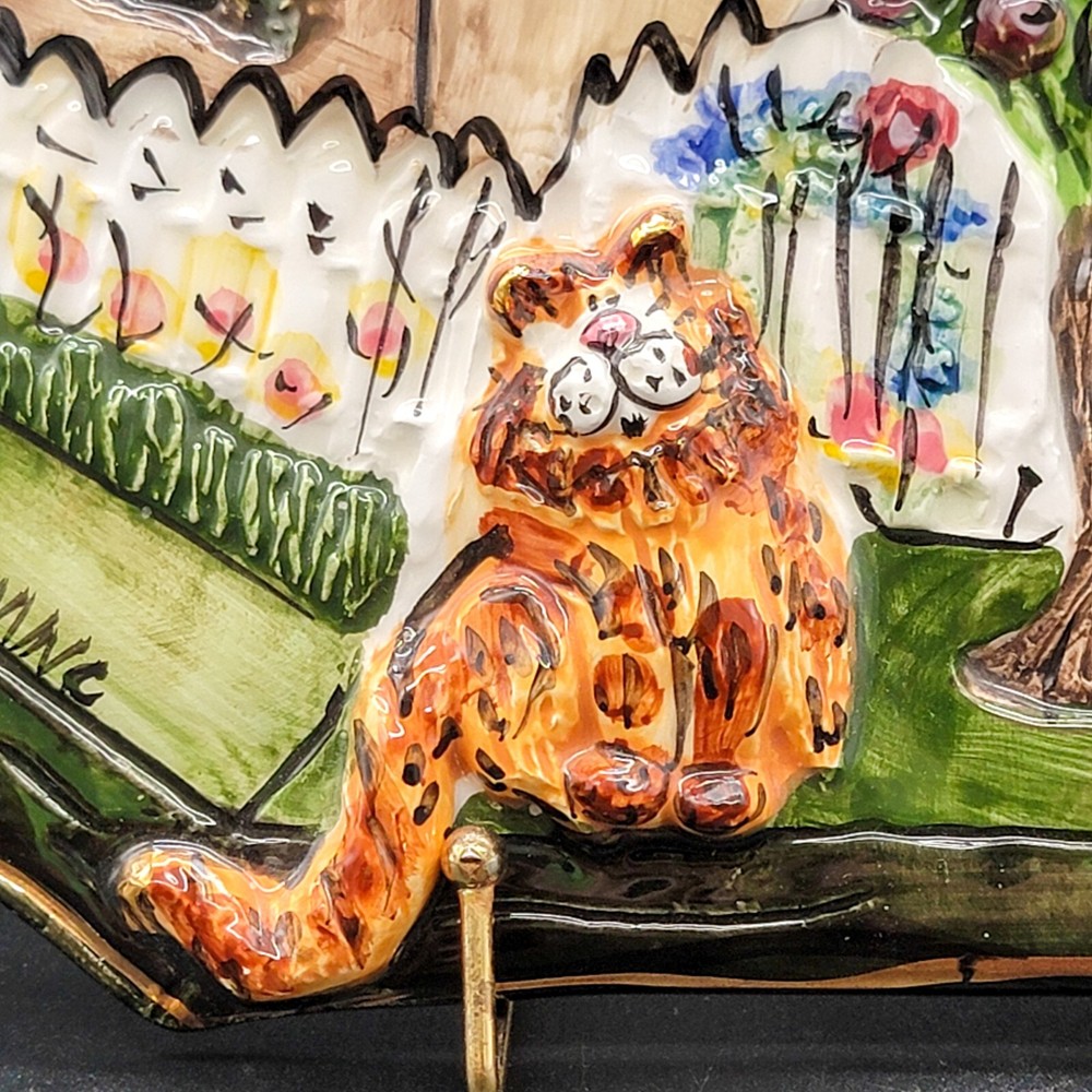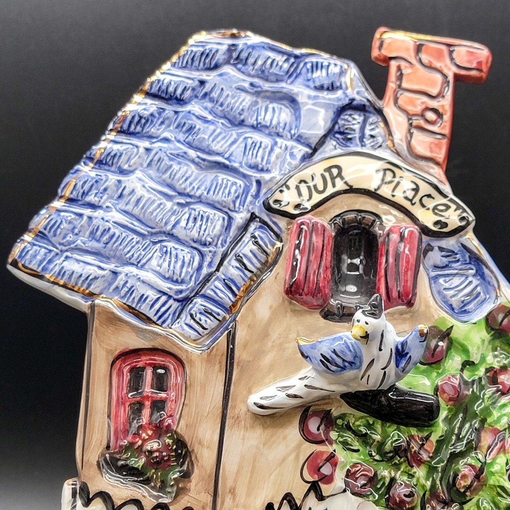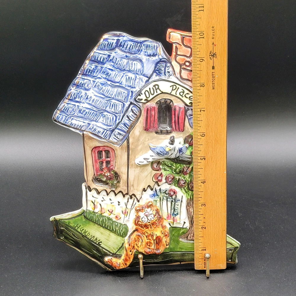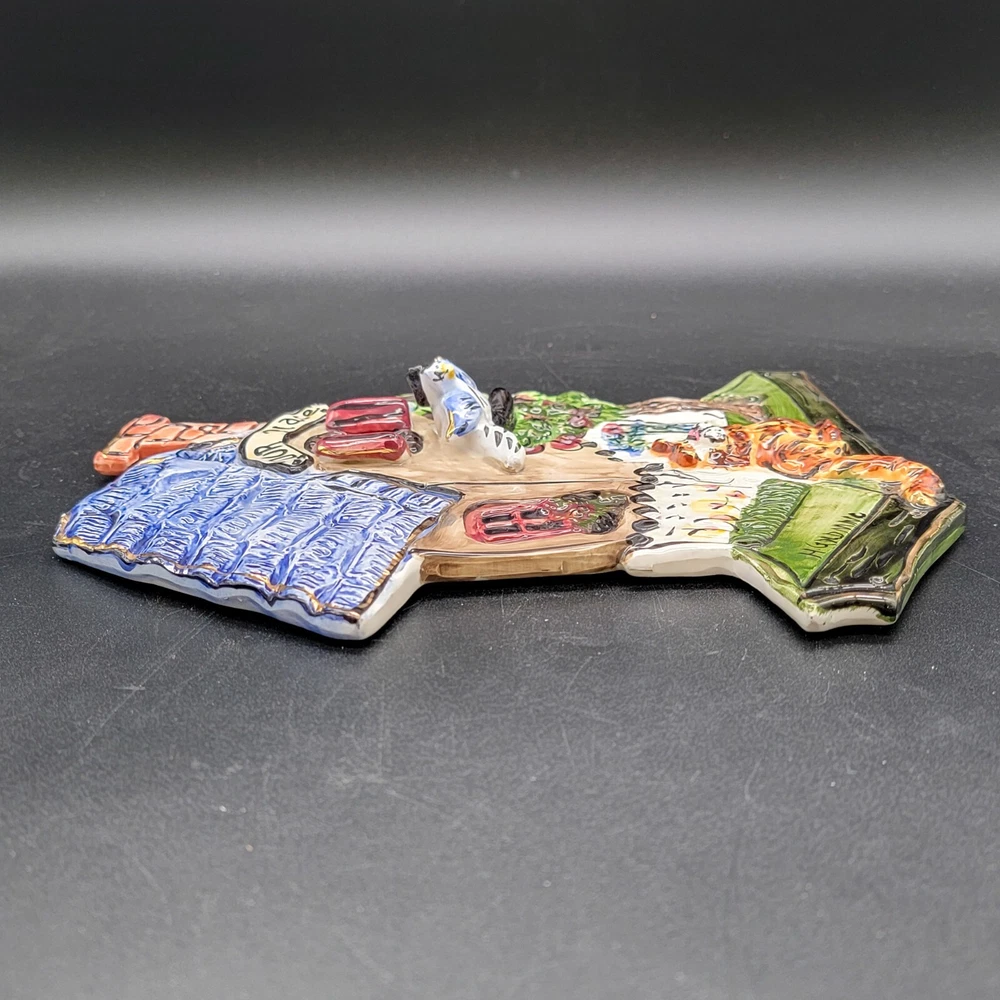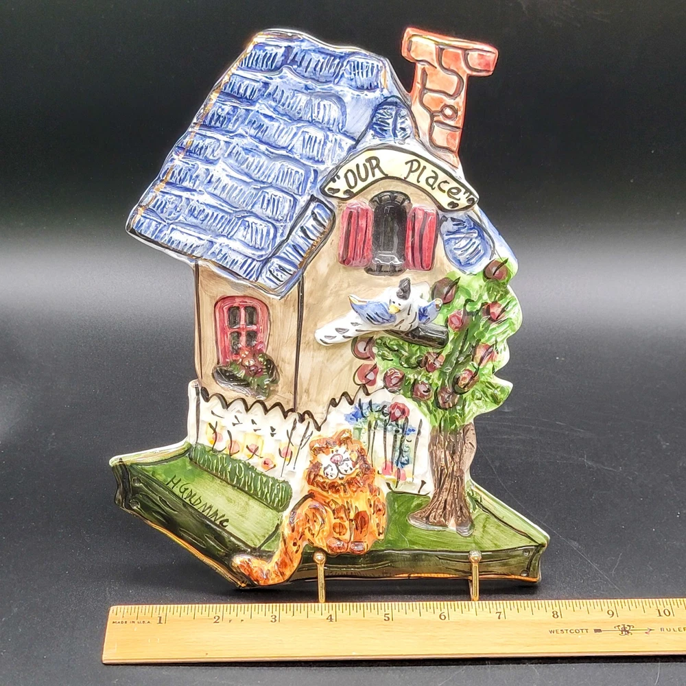 Add a touch of whimsy to your home with this charming 3D ceramic wall plaque featuring a playful cat and bird design. Perfect for adding character to any space, this piece makes a delightful gift for new home owners and animal lovers. (stand not included) • Ceramic material • Whimsical design • Cat and bird motif • Ideal for home decor • Perfect gift for new home owners and animal lovers Good used condition with some scuffs on the bird and edge of the roof. One minor chip on the back that isn't visible from the front. Please see photos for details.