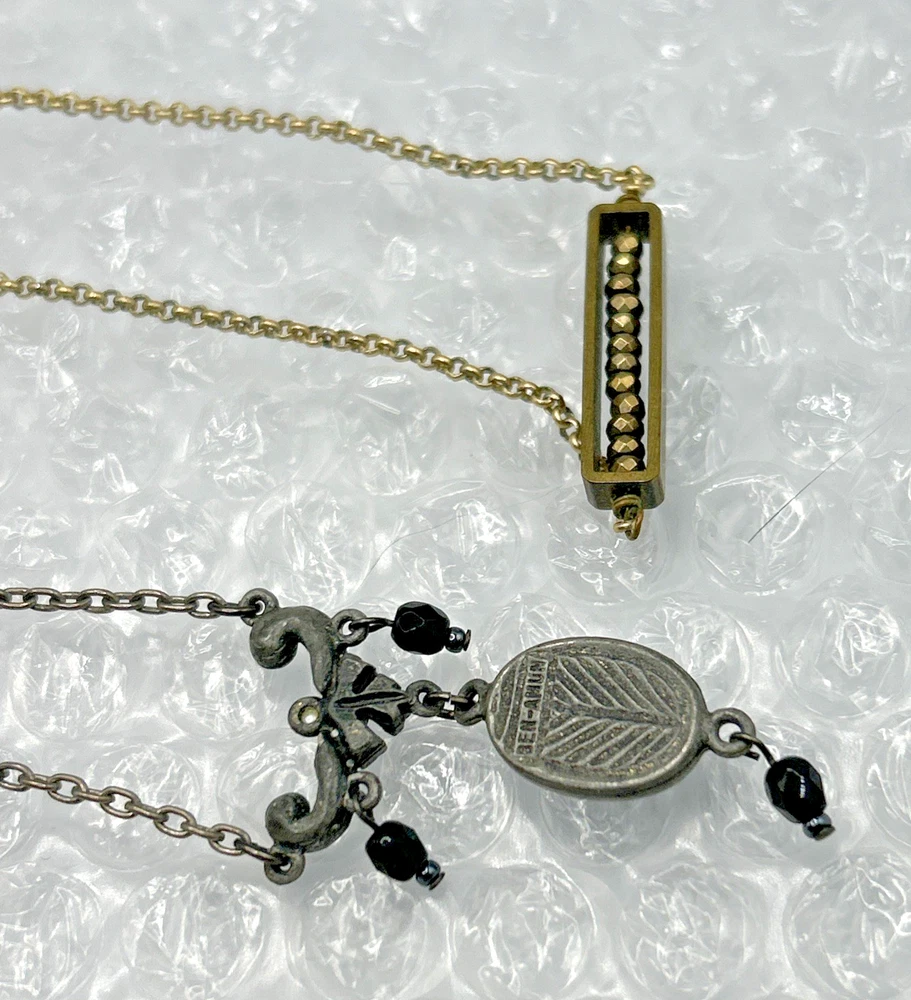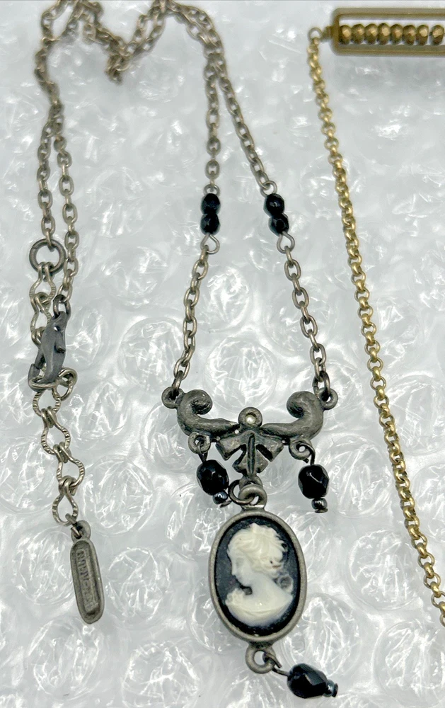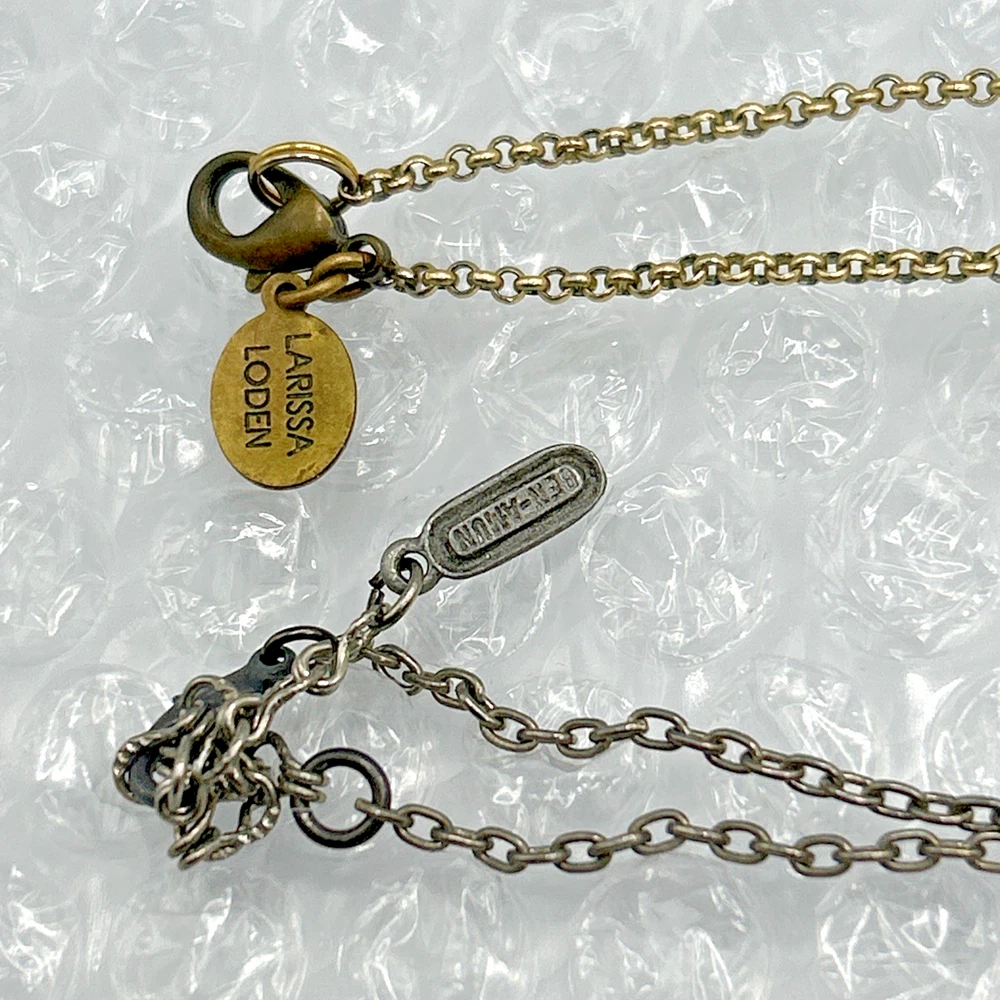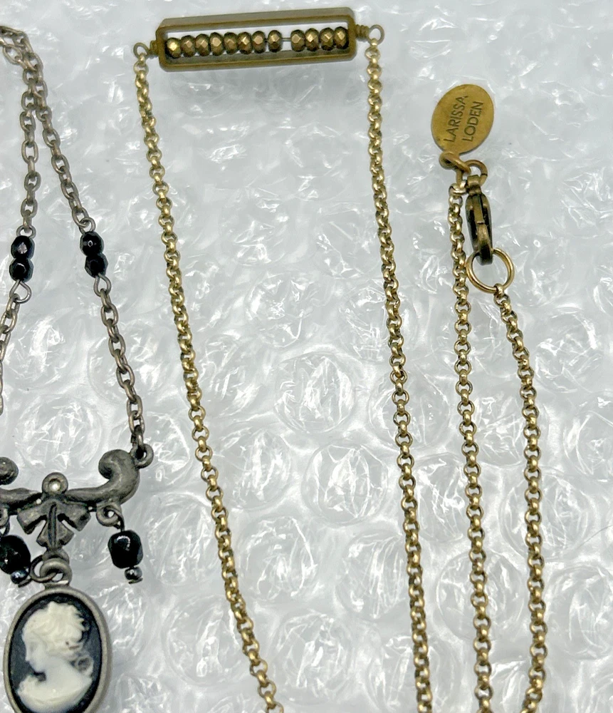 Signed Necklace Lot Ben Amun Silver Black Cameo + Larissa Loden Brass Abacus Pendant Necklace Two cute signed designer necklaces. Different looks, different styles. NOTE: in the picture above, the Ben-Amun necklace is facing backward so the faux pearls aren't visible until a later picture when it is turned around. Ben-Amun silver tone necklace with faux pearls, black crystal, and black cameo pendant. Larissa Loden Brass Necklace with rectangular abacus style pedant Thank you for supporting my small business. CozyVintageJewels offers charming vintage jewels from Pennsylvania, New Jersey, and New York estates (and beyond) at a reasonable price. I like to find special pieces that tell a story. Please save me to your list, and come see what's here tomorrow! I'm happy to offer competitive prices on multi-item purchases. Thanks for shopping, Jen Cozy Vintage Jewels