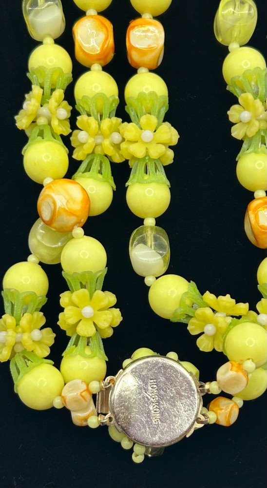 This vintage double strand fruit salad necklace from Hongkong features yellow plastic beads in a beaded style. Signed from the 1960s, this 20-inch necklace is a unique and original piece of fashion jewelry for women. The colorful and eye-catching design makes it a standout accessory for any outfit, perfect for those who appreciate vintage and antique jewelry pieces with a touch of nostalgia.