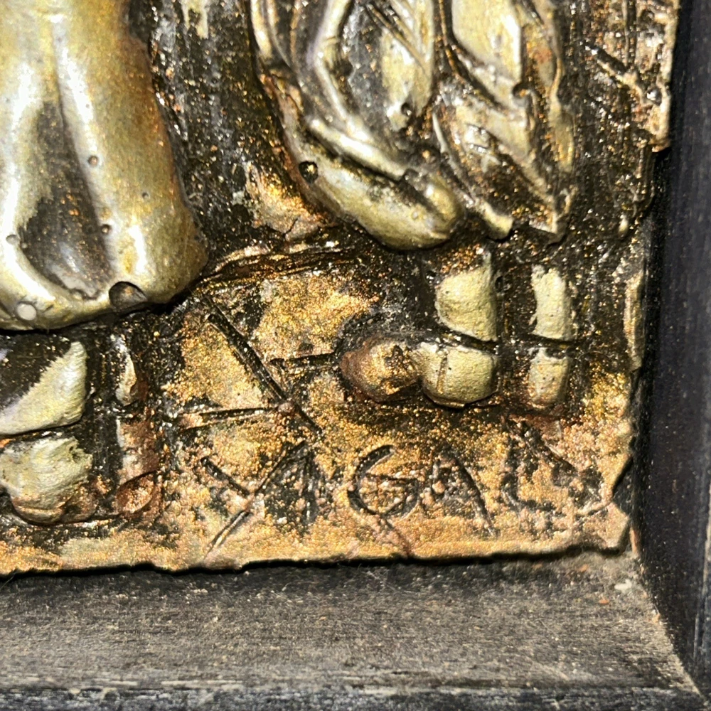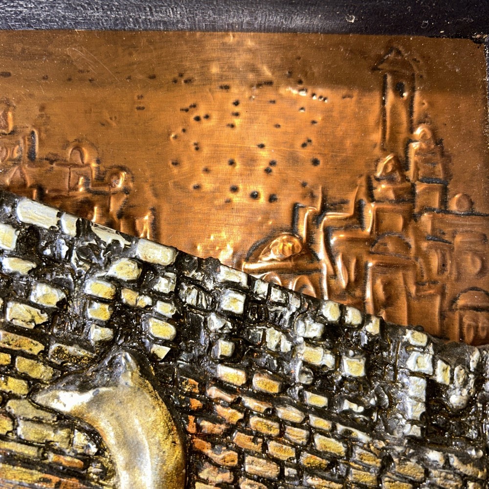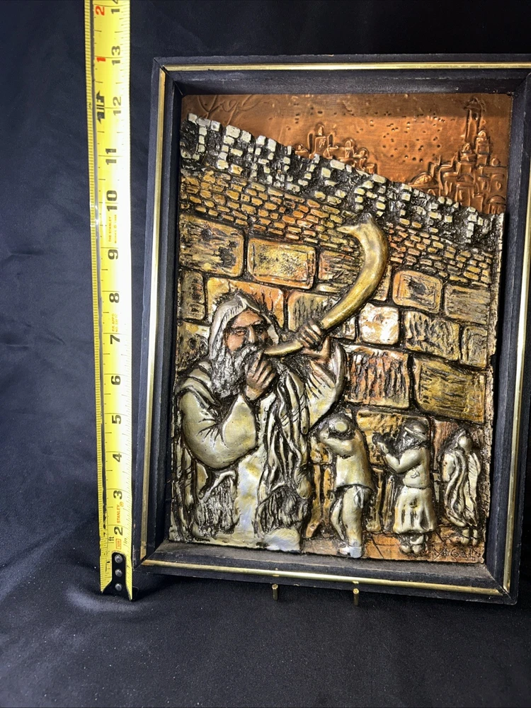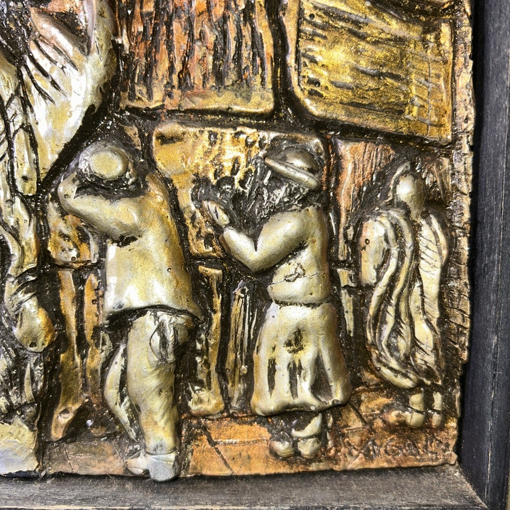 Resin on copper repousse. Signed bottom right corner. Subject depicts a man blowing a horn near the western wall where Jews pray for forgiveness for their sins on Yom Kippur. Framed in wooden frame with gilt accent. Frame measures approx. 9.75 W x 13.5 H in. Window measures approx. 8.5 W x 12.75 H in. Not viewed outside of frame. Separations in gilt accents at frame corners. Wear consistent with age. Relief sculptures, high relief sculptures, framed sculptures, copper repousse, repousse, framed repousse, Jewish art, Yom Kippur, signed art, signed artwork, artist signature, home decor, interior decor, Yigal Yom Kippur Western Wall High Relief. 9 artwall