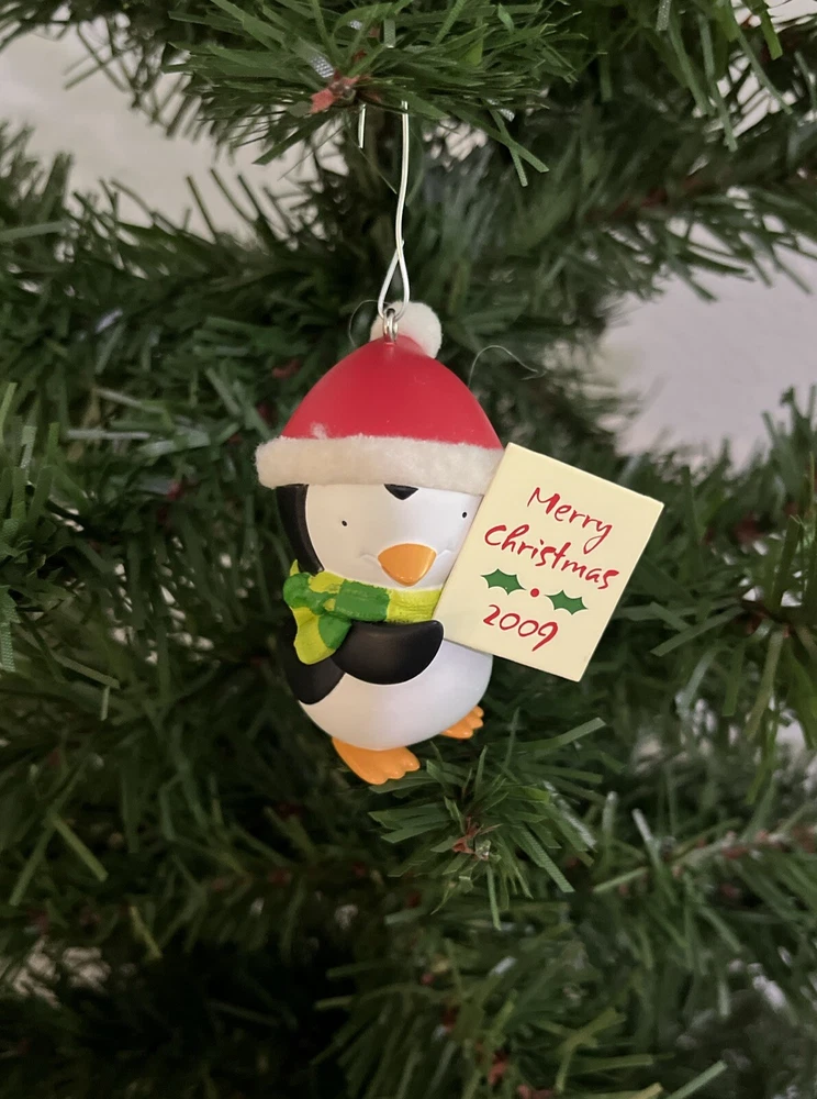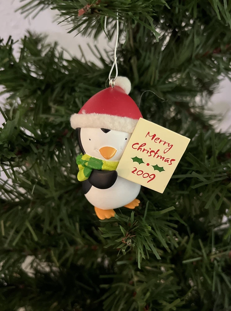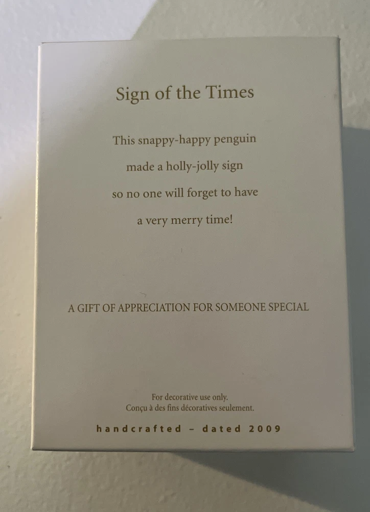 This adorable Christmas ornament features a cute penguin holding a sign that reads "Signs of the Times" from 2009. The ornament is made of durable plastic and is an original licensed reproduction from the Hallmark brand. It's perfect for any collector or fan of animals and holiday decorations. The ornament comes with a set that includes one item and is signed by the artist. Add this unique piece to your collection today! Box with minimal wear