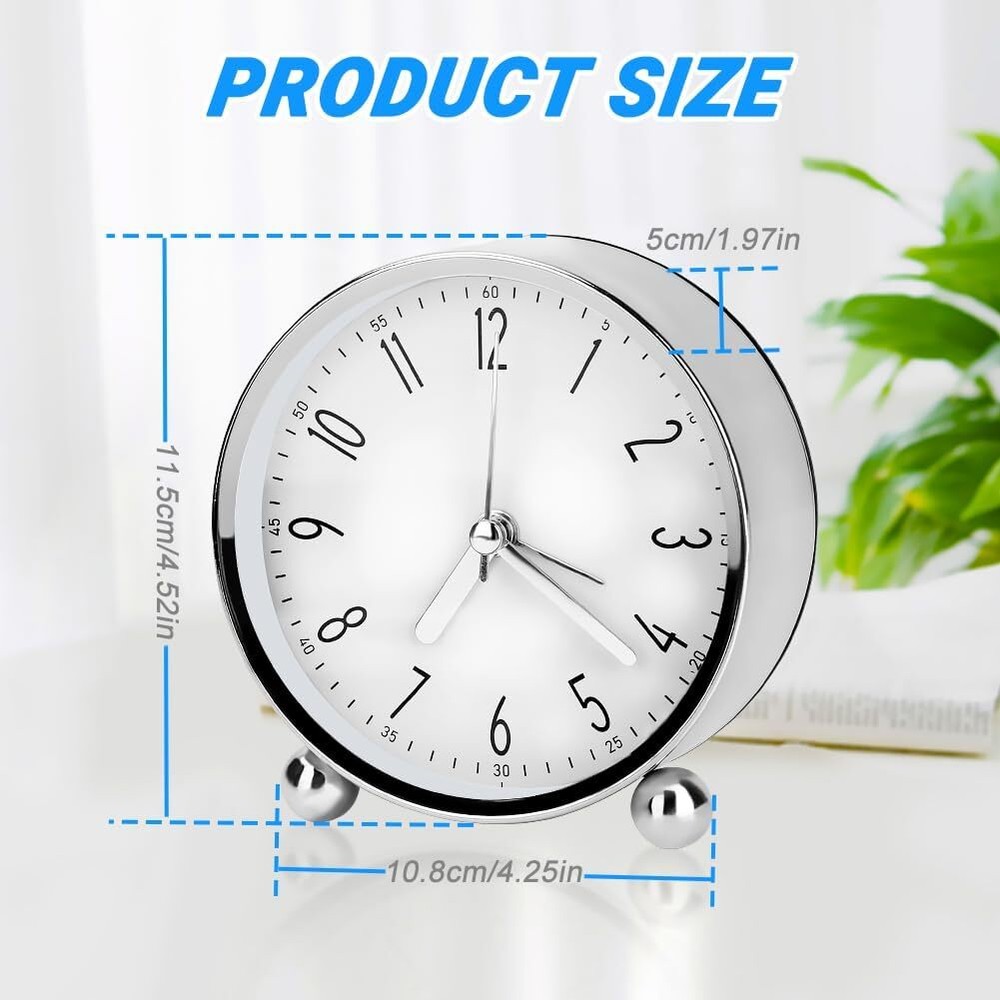 【High Quality & Simple Design】 --- Made of of high quality metal casing and glass mirror, small analog alarm clock is durable and smooth to touch, will not easy to break. Simple design makes your room looks soft and refreshing. 【Super Silent Non Ticking】 --- Uses silent non-ticking mechanism with sweeping movement, the round alarm clock can provide you with a peaceful environment to sleep, learn and work. Precise quartz movements guarantee accurate time. 【Easy to Read & Gentle Wake】 --- Clock diameter: 11.5cm/4.52in, Thickness: 5cm/1.97in. Clear large Arabic numerals make you easy to read, alarm clock designed with gentle wake volume but loud enough to wake you up, good beside wake up alarm clock for children, teens and seniors. 【Easy to Use】 --- The mini analog alarm clock is operated by 1 AA battery (not included). Turn knobs to set the clock time and alarm time, ON/OFF button can help you turn on/off the alarm easily. Pressing LIGHT/SNOOZE button, the light is on and alarm is off, after 4 minutes, it will alarm again. 【Perfect for Many Places】 --- The small clock is perfect for for living room, bedroom, bedside, desk, the exquisite appearance can decorate your bedroom, ideal gift for your family and friends.
