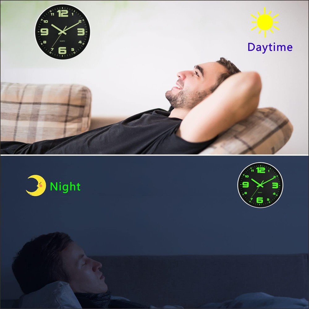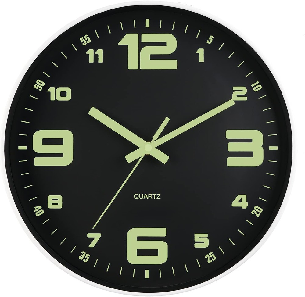 Luminous Wall Clock, Silent Non-Ticking 12'' Night Light Clocks White Product Details Brand: DIYZON Color: White Display Type: Analog Style: Minimalist Special Feature: Silent Clock, Illuminated, Luminous Product Dimensions: 12"W x 12"H Power Source: Battery Powered Age Range (Description): Adult Room Type: Kitchen, Bedroom, Living Room Shape: Round Indoor/Outdoor Usage: Indoor Material: Acrylonitrile Butadiene Styrene (ABS) Theme: Modern Frame Material: Wood Are Batteries Included: No Mounting Type: Wall Mount Item Weight: 1.5 Pounds Alarm Clock: No Watch Movement: Quartz Number of Items: 1 Operation Mode: Electrical Dial Color: White Manufacturer: HomzonDirect Item Weight: 1.54 pounds Country of Origin: China Item model number: DIY-BL-01 Simple Design: The wall clock can absorb light energy during the day, and the large luminous numbers can be easily read at night without turning on the lights. The surface is covered with glass to keep out dust and water vapor for long-lasting quality and durability. Quiet Environment: The high-quality quartz movement has no annoying ticking sound, providing a quiet environment for your sleep and work at any time. Easy to Hang: Come with a hook can be easily installed through the slot on the back of the clock. powered by 1 AA battery (not included). Modern Minimalist Wall Clock: The perfect wall clock for an office, living room, bedroom and any room in your home, also can be used as a gift for grandma, girlfriend or Thanksgiving, Christmas. Customer Service: If you have any problems or questions about this product, please feel free to contact us. Providing high-quality products is our belief that we always adhere to.