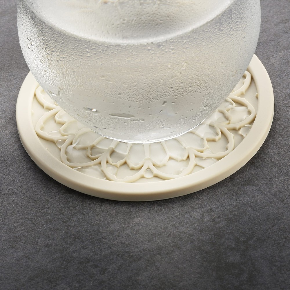 Silicone Coasters for Drinks - 6 Pack 4" Drink Aesthetic Cream Description Features: [GOTHIC DECOR FOR HOME & KITCHEN] Inspired from mid century art, this silicone drink coaster set will blend in perfectly with your gothic room decor. A complementary to your coffee cup for the coffee table and gothic kitchen accessories for your kitchen decor. The gothic rose window pattern will give a medieval look to your home decor and these cute coasters will be ideal wine accessories for your dining table set. [4“ COASTER DESIGN WITH PRECISION DETAILS] 4" diameter enables these cool coasters to fit your beer, whiskey, wine, champaign and cocktail glasses, coffee mugs, tea cups, tumblers and flasks. Ceaseless pattern design makes the coasters sturdy, yet light weight. Precision details and the soft touch finish of premium silicone material add to the quality. Ideal kitchen gifts for the kitchen table in your new home decor. [NO WATER RINGS AND SCRATCHES ON YOUR FURNITURE] Raised pattern design with edge rim provides room to catch condensation and spills from your cold drinks, keeping moisture and water rings off the table. Protection against scratches for your furniture, thanks to soft silicone material and smooth backside surface. Keep your wood, granite, glass, soapstone, sandstone, marble, stone and stainless steel table tops secure with Coasterfield. [SLIP RESISTANT AND SURFACE FRIENDLY SILICONE MATERIAL] Slip resistant backside ensures a nice grip, ensuring these coasters stay firmly in place on any surface, keeping your drinks from sliding around on your office desk. They hold your glasses securely in place, while they won't stick to them. These unique coasters also protect your wooden desk and night stands against heat from your hot tea cup or coffee mug. [MULTI PURPOSE USE AND EASY CLEANING] Solution for stuck jar lids or bottle caps, as anti skid mat for your cutting board or mixing bowl, heat resistant grips for holding hot pans and pots, spoon holder, table pad or to place any utensils on, placemat, trivet or even as key holder to protect surfaces from scratches. Cleaning is so easy, just wash them under the sink or throw into the dishwasher. These wine coasters will be a stylish addition to your wine glass set for gothic home decor clearance and will match your cool room accessories. Cute home décor accents for kitchen desk, dining room table, patio table and also a stylish addition to restaurant, pub or bar decor. Ideal goth items for office decor and perfect choice to go with tea accessories. Product Details: Handling We will ship all orders within 3 business day of payment. Delivery We Do Not Ship Outside of the Continental US. Return Policy All items qualify for returns within 30 days of receipt. Buyer is responsible for return shipping on any item that is not damaged. Feedback We take our reputation seriously, we buy and sell online, so we understand the value of trust. If you are unsatisfied with your order, please contact us and we will work with you to resolve it to your satisfaction.