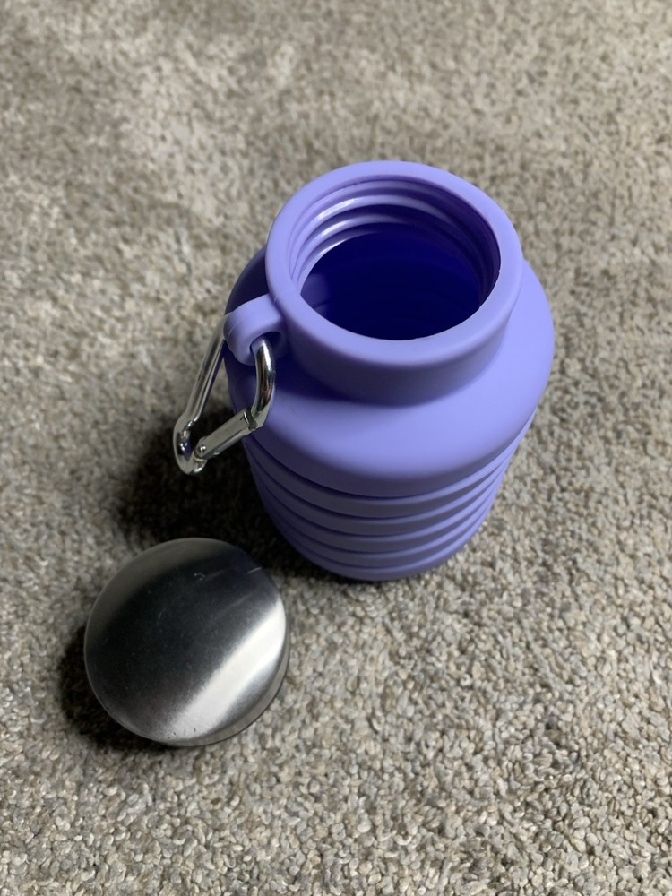 The Silicone Collapsible Water Bottle is a 16oz (500ml) portable water bottle made of silicone, featuring a screw-on lid for easy access.