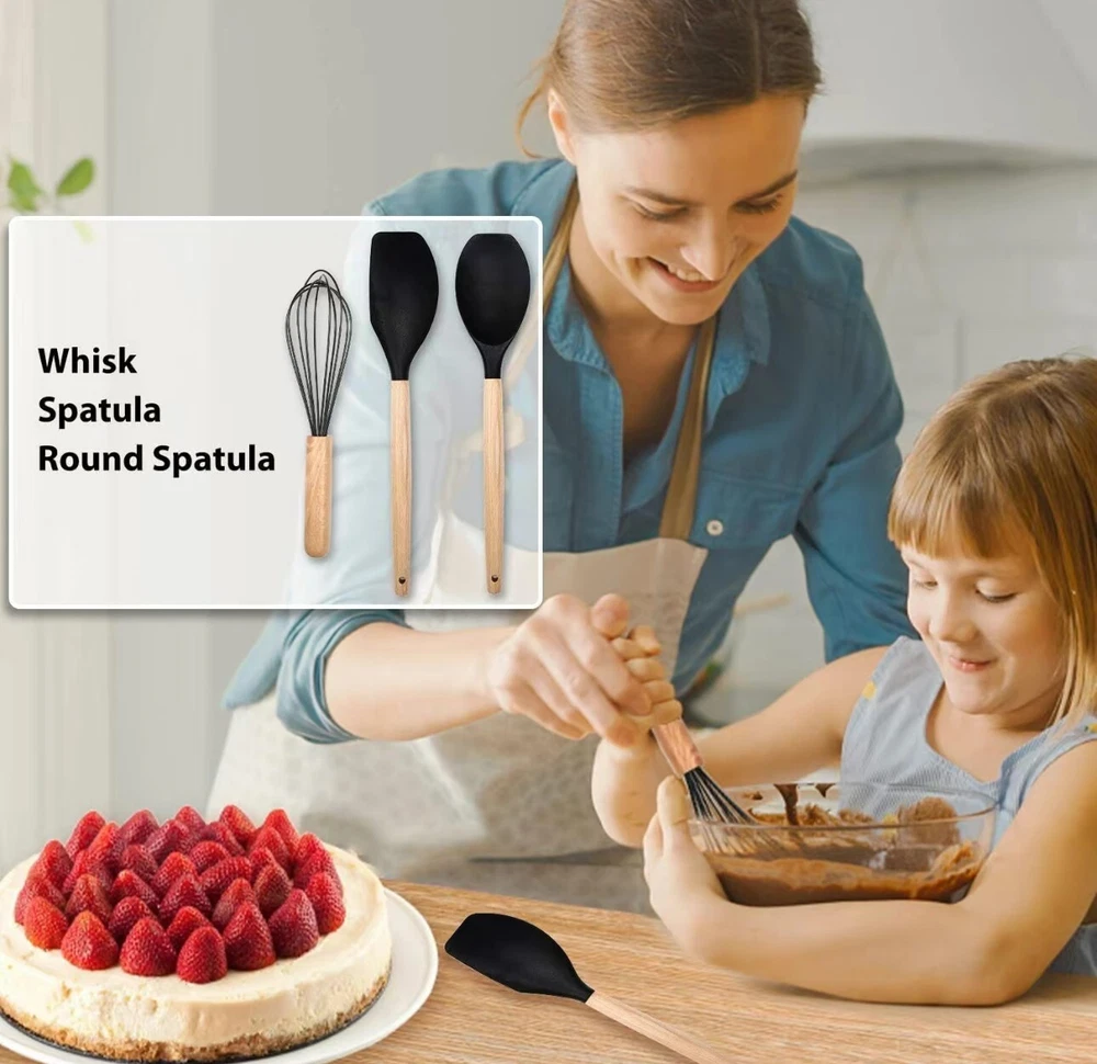 -Brand New - Never Used - Questions: Feel free to ask any Questions - BOX: Never Opened - DESCRIPTION: Protective Design Our kitchen utensils feature anti-scalding wooden handles, ensuring your hands stay safe. The professional silicone set includes all essentials: Pasta Server, Serving Spoon, Turner, and more. Avoid prolonged soaking and dishwashing for longevity. * Safe & Non-ToxicMade from BPA-free, food-grade silicone, these utensils are odorless and safe for high-temperature cooking. Soak for 30 minutes before first use to eliminate any initial smell. * Heat-Resistant & DurableWithstand heat up to 446°F without melting or warping. The soft silicone heads protect your non-stick cookware from scratches. * Sturdy Wooden HandlesDesigned for strength and durability, our wooden handles resist bending and breaking. Contact our customer service for any issues. * * Perfect GiftThis complete set is ideal for cooking enthusiasts and makes a great housewarming or wedding gift, keeping kitchens organized and stylish! - OFFERS: Reasonable offers are considered, LOWBALLERS, Best price and Lowest askers will be ignored - all sales final/no refunds/ no exchanges/ no returns - Disclaimer: I do not own the brand's trademarks, logos, pictures, or products posted. I do not intend to infringe on copyright. I find such content available on the internet. Contents are considered fair use. - Silicone Cooking Utensils 22pcs Kitchen Utensil Set, Wooden Handle Nontoxic BPA Free Silicone Spoon Spatula Turner Tongs Kitchen Gadgets Utensil Set for Nonstick Cookware with Holder and 10 S Hooks Best Christmas Gifts for Your Mom, Friends, or Lover