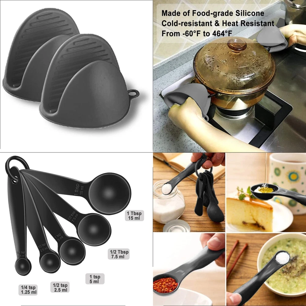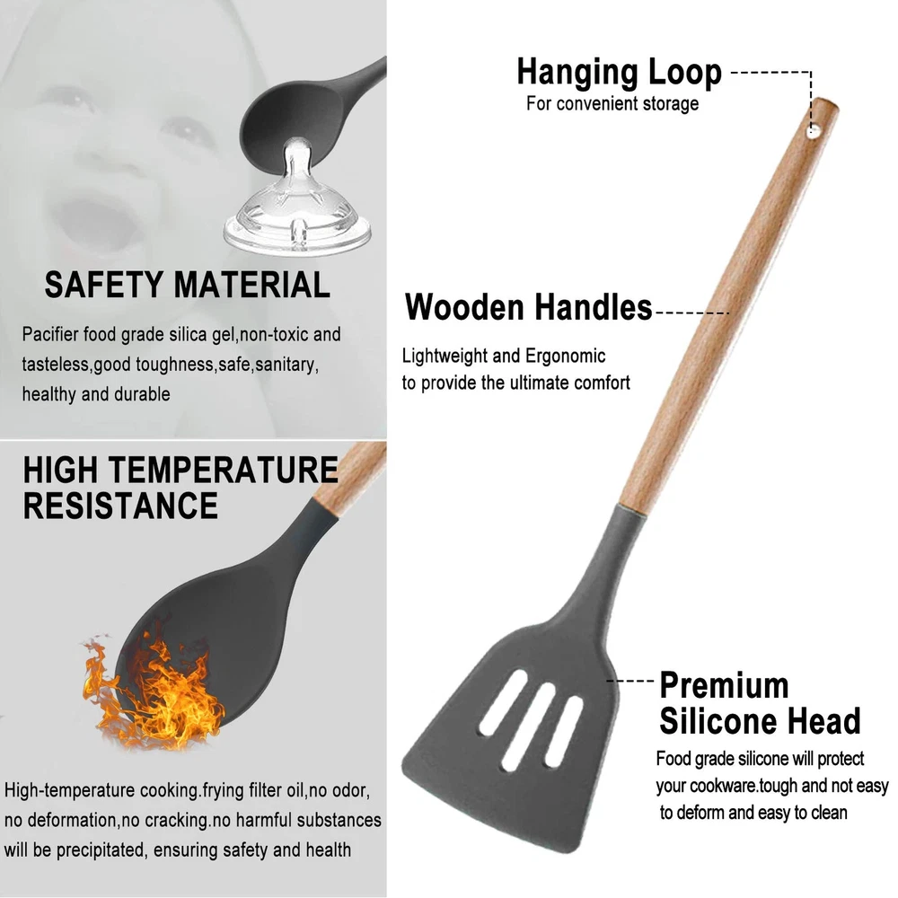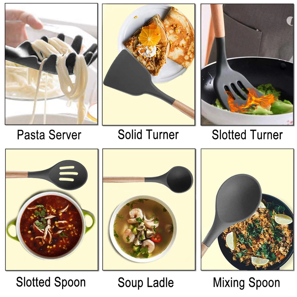 19pcs Organic Silicone Kitchen Utensils: Silicone kitchen utensils set includes 12pcs cooking tools that will suit all your cooking and baking needs. Our silicone kitchen utensil set includes: Tong, Whisk, Basting Brush, Slotted Spoon, Slotted Turner, Pasta Server, Spoon, Spatula, Round Spatula, Solid Turner, Soup Ladle. Also come with the gift of 5pcs small Measuring Spoons of different sizes black color and 2pcs Silicone Mini Gloves. Heat-resistant & Non-stick & Non-: Our silicone kitchen utensils set use food silicone which are super up to 464°F/240°C.The high heat tolerance of the silicone heads prevents the utensil from melting when exposed to heat. Kitchen utensils are also non-stick and non-,easy to use and . Only the basting brush silicone head and wooden handle are designed to be detachable, it can be put back at any time without affecting the use and easy to clean. Safe Cooking Utensils for Kitchen: All kitchen tools are made of high quality thermoplastic silicone heads designed to protect the surface of precious non-stick cookware. silicone is safe to use for any type of food .The kitchen utensil set does not react with food or beverages, or produce any hazardous fumes. Solid Wooden Handle to Prevent Burns: This cooking utensils set combination of silicone head and wooden handle, the wooden cookware handle is ergonomically designed for comfortable grip, does not transfer heat to protect your hands and provide protection against rust. Easy Storage with Holder: Our silicone kitchen utensils set comes with a plastic holder for convenient storage organization. Each wooden handle has a practical hanging hole for wall hanging using hooks. Provide Customer Support: silicone kitchen utensils set for cooking with holder are under strict quality standards so you can use it with confidence. If you are not completely satisfied for any reason, please feel free to us via , we will reply you as soon as possible within 12 hours.