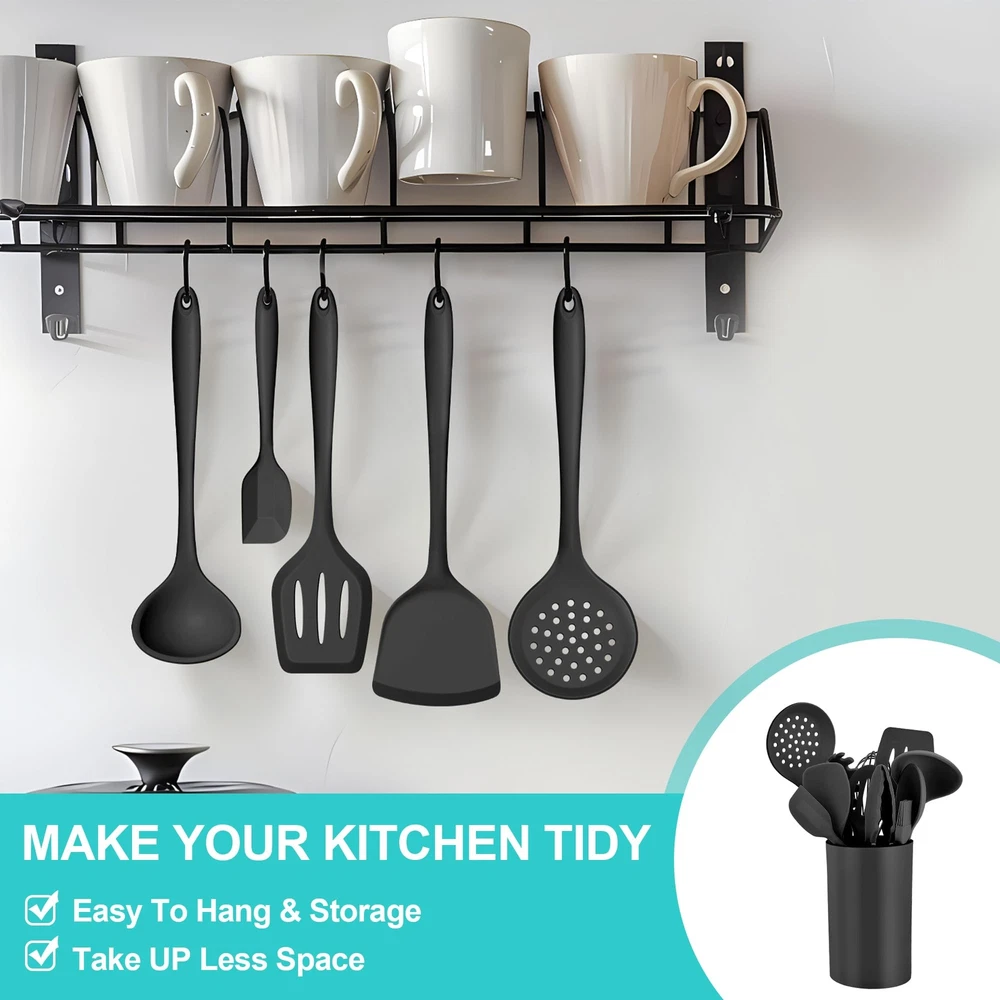 cooking utensils set is made of food grade silicone, which is heat resistant and nonstick, withstand a maximum temperature of 446°F. Flexible silicone material, no need to worry about scratching the bottom of your cookware. Equipped with Spatula Turner, Slotted Turner, Soup Ladle, Pasta Server, Slotted Spoon, Solid Spoon, Spoon Spatula, Skimmer, Brush, Tong, Whisk, Small Spatula, Jar Spatula, Egg Separator, Measuring Cups and Measuring Spoons, fully satisfy your cooking needs, making it a perfect companion for kitchen. SPECIFICATION: Quantity: 25 Piece Material: Silicone Color: Black Features: Food Grade, Heat Resistant, Nonstick, Non Toxic, Scratch Resistant, Flexible, Durable TIPS AND MAINTENANCE: 1. When used for the first time, kitchen utensils can be washed with dish soap for dust and production residue. 2. After using, use sponge cloth to remove the stain. Recommend washing by hand to extend the service life. 3. After drying, store them in the holder or hang them on the shelf in the kitchen. FOOD GRADE & SCRATCH RESISTANT: Made of food-grade silicone free from harmful chemicals, No worry about toxic materials into your food, Flexible silicone head won’t scratch your nonstick cookware unlike metal kitchen utensils, Ensuring your pots and pans stay in tip-top shape while you create culinary masterpieces HEAT RESISTANT & DURABLE: Premium quality silicone are heat resistant up to 446°F, Won't melt or release flavors at high temperatures, Sturdy metal cores provide stability and durability for long-term use while retaining a handy flexibility at the edges, Easy to use for a wide range of cooking tasks, Mix, serve, stir, flip, blend, scramble, and more ANTI-SLIP & ONE-PIECE DESIGN: Ergonomically designed handles feature smooth, blemish-free texture, Anti-slip and comfortable to grip, One-piece molding without any gaps to capture food, Easier to clean than other put-together handles, Non-stick silicone surface makes food less likely to stick, Easy to clean by hand and dishwasher safe EASY TO STORE: Each piece has a hanging loop attached to the handle for easy hanging and convenient storage, Equipped with a plastic holder with drainage holes at the bottom to help dry tools quickly, You have the option to hang them on the wall or put them in the holder when not use, Save space and make kitchen countertop clean and tidy ALL-IN-ONE VALUE SET: Contains Spatula Turner, Slotted Turner, Soup Ladle, Pasta Server, Slotted Spoon, Solid Spoon, Spoon Spatula, Skimmer, Brush, Tong, Whisk, Small Spatula, Jar Spatula, Egg Separator, Measuring Cups and Measuring Spoons, A variety of kitchen tools satisfy all your cooking and baking needs, Will be great companions in your kitchen
