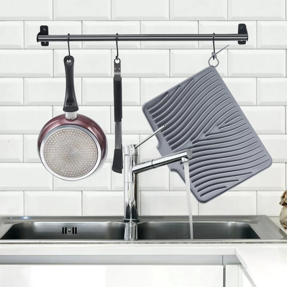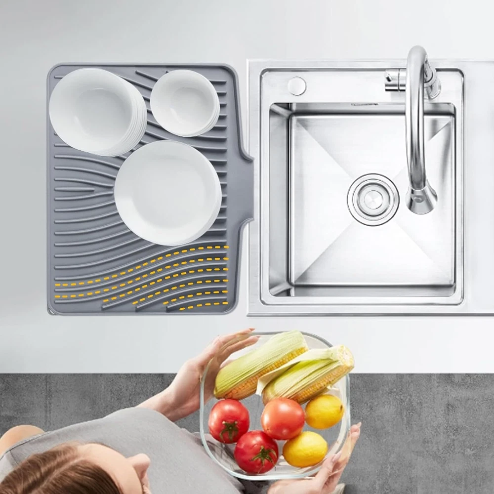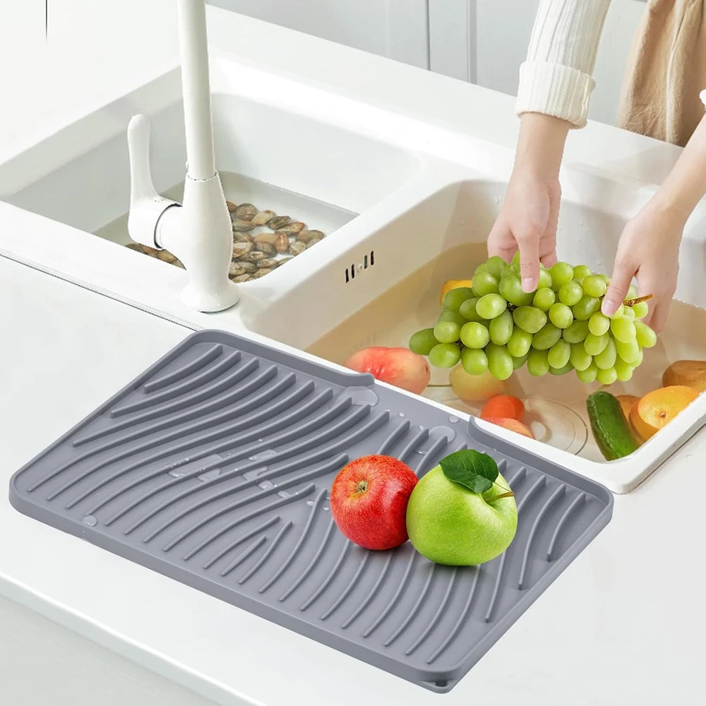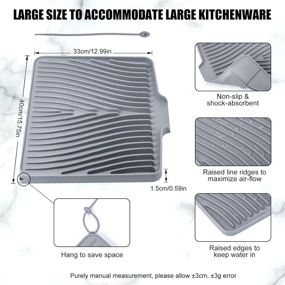 Silicone Dish Drying Mat for Kitchen Counter, 15.8" x 13", Grey Product Details Brand: TIKNIK Size: 15.8" x 13" Material: Silicone Item Weight: 0.5 Kilograms Color: Grey Indoor/Outdoor Usage: Indoor Is Stain Resistant: Yes Product Care Instructions: Hand Wash,Dishwasher Pattern: Solid Shape: Rectangular Product Dimensions: 15.8"L x 13"W Number of Pieces: 1 Water Resistance Level: Water Resistant Is Autographed: No Model Name: Grey-1pc-L Item Weight: 1.1 pounds Manufacturer: TIKNIK Country of Origin: China Item model number: Grey 1pc Quick Drying Mat: TIKNIK dish drying mat measures 15.8" x 13", where washed dishes can be placed for air drying. The folding, raised and innovative design of the quick dry dish mat allows air to circulate under the dishes,and features unique diagonal ridges to easily remove moisture, and a specially designed rim that lets water drain directly into the sink. This keeps your countertops dry and clean, and says goodbye to wet countertops. Anti-slip & heat-resistant: TIKNIK non-slip easy clean sink mat has an anti-slip effect, which prevents tableware, vegetables, fruits and glassware from sliding off. It is also an excellent heat-resistant silicone dish drying mat that protects it from high temperatures up to 450°F/230°C, while protecting countertops and tables from hot pots or electrical appliances. Food-grade silicone material: TIKNIK silicone drain mat is made of environmentally friendly food-grade silicone, does not contain BPA, is durable, soft, heat-resistant, non-slip, foldable and not easy to deform, so you have clean and healthy tableware. Enjoy the peace of mind of a cleaner and more hygienic kitchen space every time you use it. Multifunctional mat: TIKNIK multi usage drain pad can not only dry dishes on the kitchen countertop or beside the sink, but also can be used as a dish rack mat, refrigerator liner, heat-resistant mat, baking mat, non-slip mat for cutting boards, coffee pot mat, heat-resistant tripod for hot pots and pans, etc., so that you can have a different wonderful experience in different scenes. Easy to clean and store: TIKNIK silicone drying pad can be directly rinsed or brushed with water. There may be some water stains during use, just rinse with water or wipe with a damp cloth, and it will be as good as new. TIKNIK silicone mat is very soft and is designed with a hanging hole, so it can be rolled up or folded very convenient , or hung directly on the wall for storage, which is easy to save storage space.