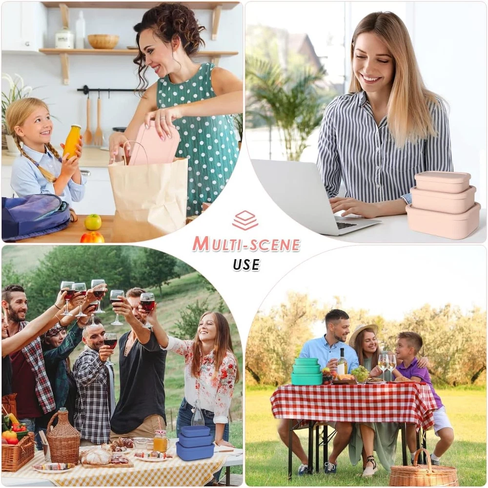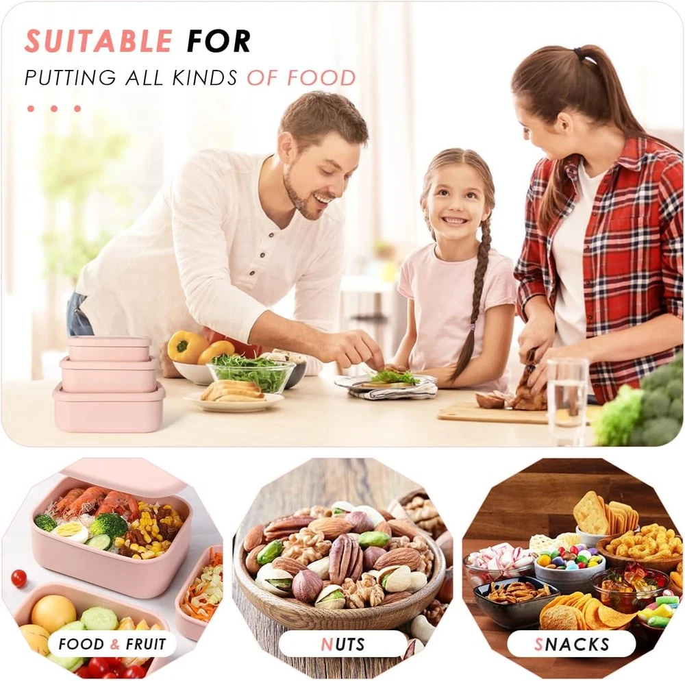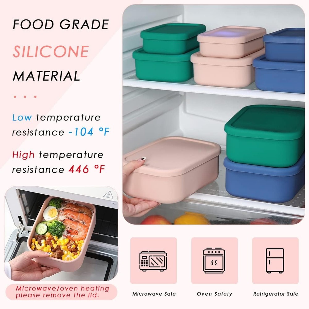 About this item Save Space: Our silicone food containers are designed to be stackable and nestable to reduce waste and save space. They are freezer-safe to help you store leftovers and other foods, and it's easy to stack them in the fridge for a neat and space-saving experience. They can be conveniently nested with each other to facilitate storage and carrying when not in use Size and Large Capacity: This silicone food container set includes 3 different sizes: 5.9" x 3.9" x 1.6" ( 10.2 oz ); 6.9" x 4.9" x 2.2" ( 23.6 oz ); 7.9" x 5.9" x 2.8" ( 44 oz ). Different capacity to meet your different needs, stackable design, more space-saving, as elegant and neat. Each container comes with a sturdy and easy-to-clean lid Sealed and Leak-Proof Design: The Silicone lunch box with sealing ring design on the lids and thick container to block light, provide an airtight, leak-proof seal to maintain freshness and prevent food leaks and spills. They are perfect for work, picnics, camping, etc Durable Food Grade Silicone: These silicone containers are made of premium food-grade silicone, BPA-free, strong and soft, non-deforming, reusable, easy to clean, and convenient for you to use. It can withstand the temperature ( - 104 ° F - 446 ° F ) / - 40 ℃ - 230 ℃, and is safe for freezing, microwave, oven and dishwasher Multi-purpose: These food containers are designed with liquid volume marks inside, which can be used for leftovers or as Meal Prep preparation containers. These silicone lunch box containers are very suitable for storing nuts, fruit, soup, snacks, sandwiches, salads, pizza, and are ideal for preparing lunch and meals! Stackable design and unique appearance, suitable for storage at home and carrying out Color: Pink Material: Silicone Material Feature: Food Grade, Freezer Safe, Microwave Safe, Reusable Capacity: 2.8 Pounds