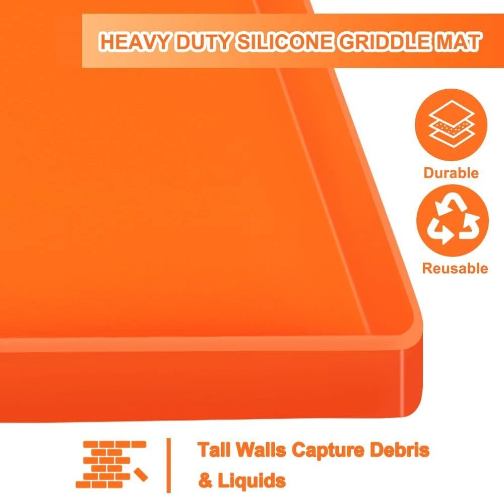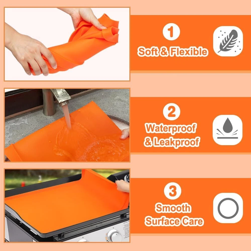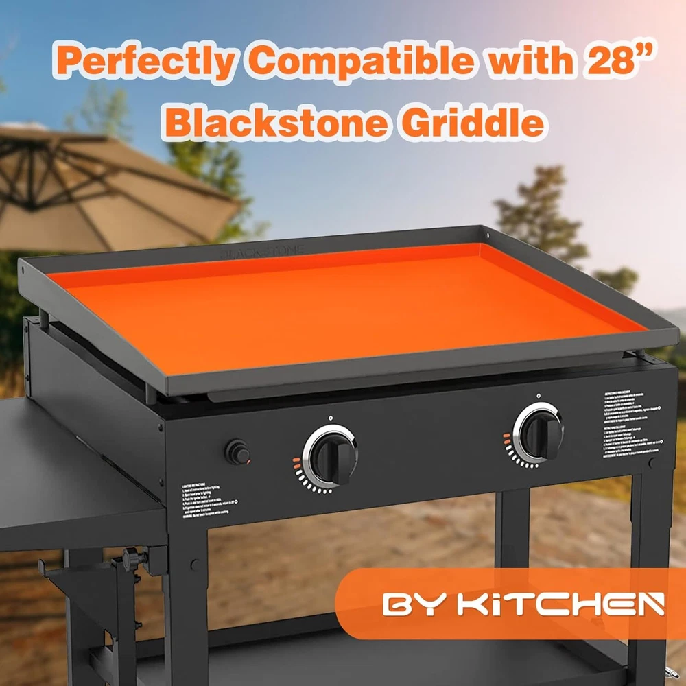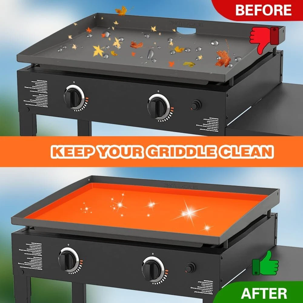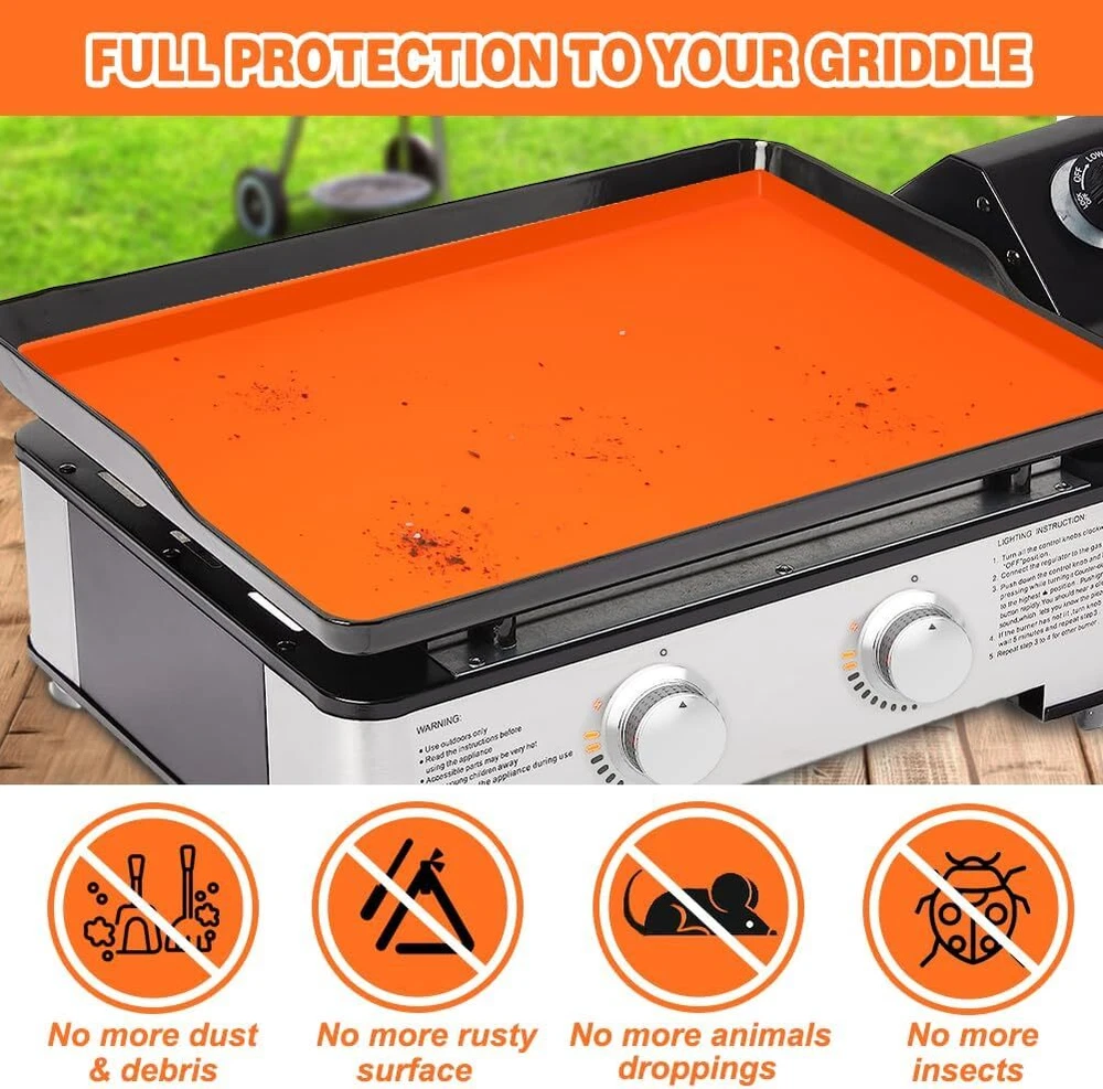 Silicone Griddle Cover for Blackstone 28 Inch Mat for Tabletop Grill Accessories US Warehouse - FREE & FAST Shipping in USA DESCRIPTION ALL-SEASON PROTECTION TO YOUR GRIDDLE: This silicone griddle cover protect your grill from dust, leaves, debris, insects, animal droppings and more, ensuring your griddle remains clean and in perfect condition year-round. EXTEND THE LIFE OF YOUR GRILL: Our silicone grill cover surface seal can effectively prevents moisture, rust and oxidation after cooking, and extend the lifespan of your griddle. PERFECT FIT FOR 28 INCH BLACKSTONE GRIDDLE: Specifically comptible with the Blackstone 28 inch griddle, ensuring a snug fit and perfect protection. PREMIUM FOOD GRADE SILICONE: Made of premium quality food grade silicone, safe for your health, reliable, durable, flexible, waterproof, leakproof and easy to store. REUSABLE & EASY TO CLEAN: The non-stick and smooth surface care of our silicone griddle mat makes cleaning quick and effortless, and easy to clean with soap and water by hand or in the dishwasher. SHIPPING Garantía de Satisfacción 100% Garantía de devolución y reembolso de 30 días Envío rápido y gratuito en EE. UU., almacén de EE. UU. Ofrecemos envío gratuito a los 48 estados inferiores y enviamos dentro de los 3-5 días hábiles, generalmente antes. No aceptamos P.O. Cajas. Proporcione una dirección física. 100% Satisfaction Guarantee 30 Days Return and Refund Guarantee Free and Fast Shipping in USA, US Warehouse We offer free shipping to the lower 48 states and ship within 3-5 business days, usually sooner. We do not accept P.O. Boxes. Please provide a physical address. FEEDBACK 1. Cualquier pregunta sobre su pedido, contáctenos a tiempo, le responderemos dentro de las 24 horas y le daremos una respuesta satisfactoria. 2. Si está satisfecho con nuestros productos y servicios, esperamos tomar su valioso tiempo para dejar comentarios sobre nuestros productos. ¡Gracias! 3. Tu satisfacción es nuestro esfuerzo. ¡Bienvenido a ordenar de nuevo! ¡Qué tengas un lindo día! 1.Any question for your order, please contact us in time, we will reply to you within 24 hours and give you a satisfactory answer. 2.If you are satisfied with our products and services, hope to take up your a little precious time to leave feedback reviews for our products.Thanks! 3.Your satisfaction is our effort. Welcome to order again! Have a great day!