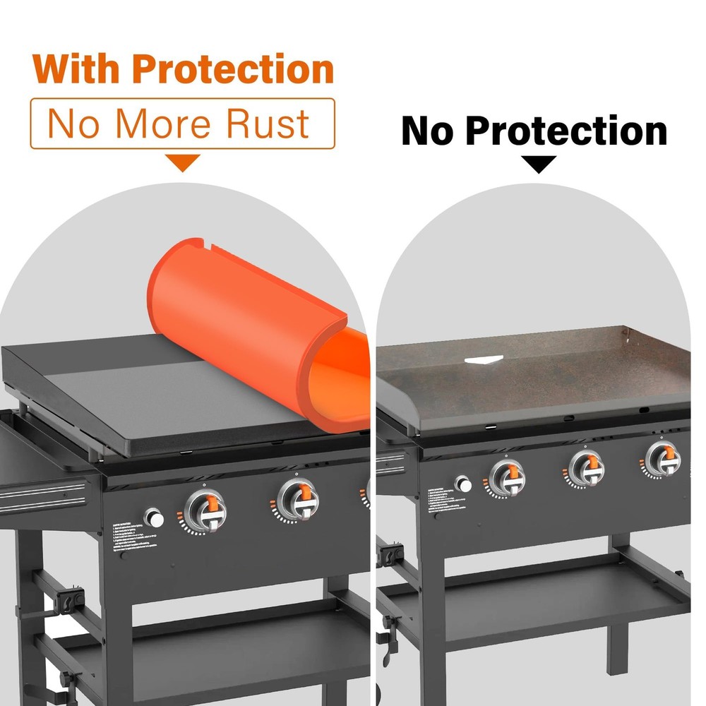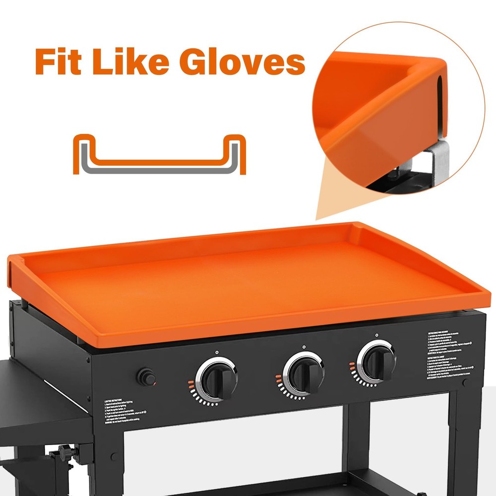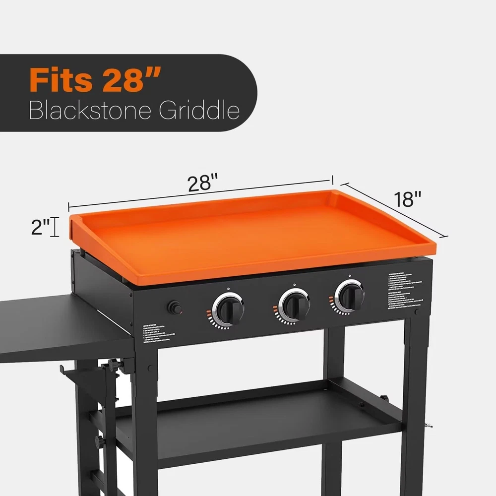 Full Coverage Silicone Griddle Cover for Blackstone Griddles. No one wants their Blackstone grill rusting or getting dirty. Use a silicone protective mat cover to protect the surface and be ready to grill and barbecue anytime. Protection for All Seasons Our silicone bbq grill cover for blackstone covers the cooking surface and wide walls. Effectively keeps out moisture, dirt, bugs and rodents. Thick & Durable Silicone Surface Protector Our outdoor silicone sheet is made of food-grade silicone, waterproof, heat resistant up to 400℉; food safe, foldable. Perfect Fit: Our 28 inch griddle mat measures 28.75 x 18 x 2 inches / 73x45.7x5.2cm, Fits 28” Blackstone griddles, All season protection; Note: Measure your griddle before purchasing – especially if it’s a non-Blackstone brand Full Coverage: Our protective silicone mat fully covers the griddle surface and side walls, protects the griddle surface from rust, dust, dirt, debris, critters, bugs and more Heavy Duty & Food-Grade Silicone Mat: Our griddle protector is made of 100% food-grade silicone, thick, durable; heat resistant up to 400℉, DO NOT try to cook food on the griddle cover mat Must Have Griddle Accessory: Silicone toppers for griddle keeps the surface ready to cook and extend your griddle’s service life; no cleaning and prepping the surface after a long storage period Easy to Clean: Our griddle top mat has a smooth surface and is easy to wash by hand or in the dishwasher; super easy to wipe clean; dries quickly