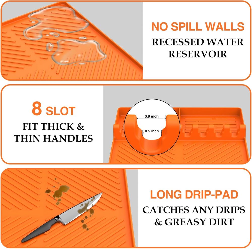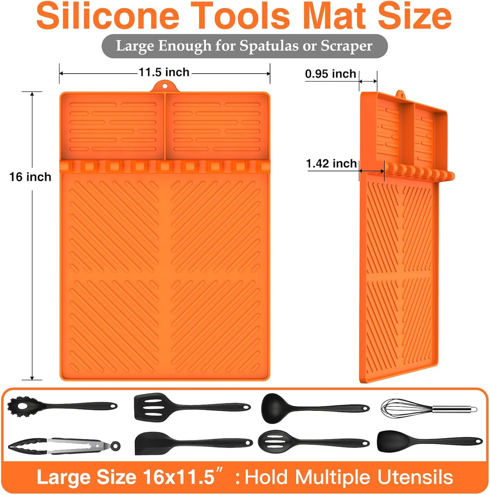 【Large Size Grill Side Shelf Mat】Package includes 1 x large size 16x11.5" silicone spatula mat with drip pad. is perfect for your grilling needs. Use it as a grill BBQ caddy seasoning jars holder or to keep multiple utensils like ladles and spoons organized on your barbecue grill side shelf. Keep your kitchen, cooking area, and countertop clean and tidy effortlessly.(NOT FIT FOR 22“ griddle.) 【Easy to Clean and Resistant】- Our silicone mat stands the test of time with its non-deforming design, ensuring longevity and ease of use. Cleaning is a breeze - just use soap and water, hand wash, or toss it in the dishwasher. Its heat-resistant nature makes it a reliable companion, even in high-temperature environments. 【Non-Slip and Anti-Scratch】During the grilling process, the silicone spatula mat prevents scratching the surface of the grill and protects its coating from damage. The non-slip texture of the silicone griddle tools mat for Blackstone side shelf ensures your utensils to stay firmly in place, reduces the risk of accidents and messes. This silicone grill tools mat is pefect for Blackstone side shelf. 【Food-Grade Silicone Griddle Mat】The grill mat is made of high quality silicone material to ensure that it can withstand high temperatures up to 450℉. Griddle tools mat can be placed near the stove or countertop to keep the heat out and help dissipate heat from grills, pots and pans. 【Your Kitchen's Best Friend】- Say goodbye to countertop chaos with this silicone spatula mat. Its easy-to-clean, heat-resistant, and versatile design makes it the perfect companion for every kitchen enthusiast. Unleash the full potential of your Blackstone side shelf with this essential addition. Product Description