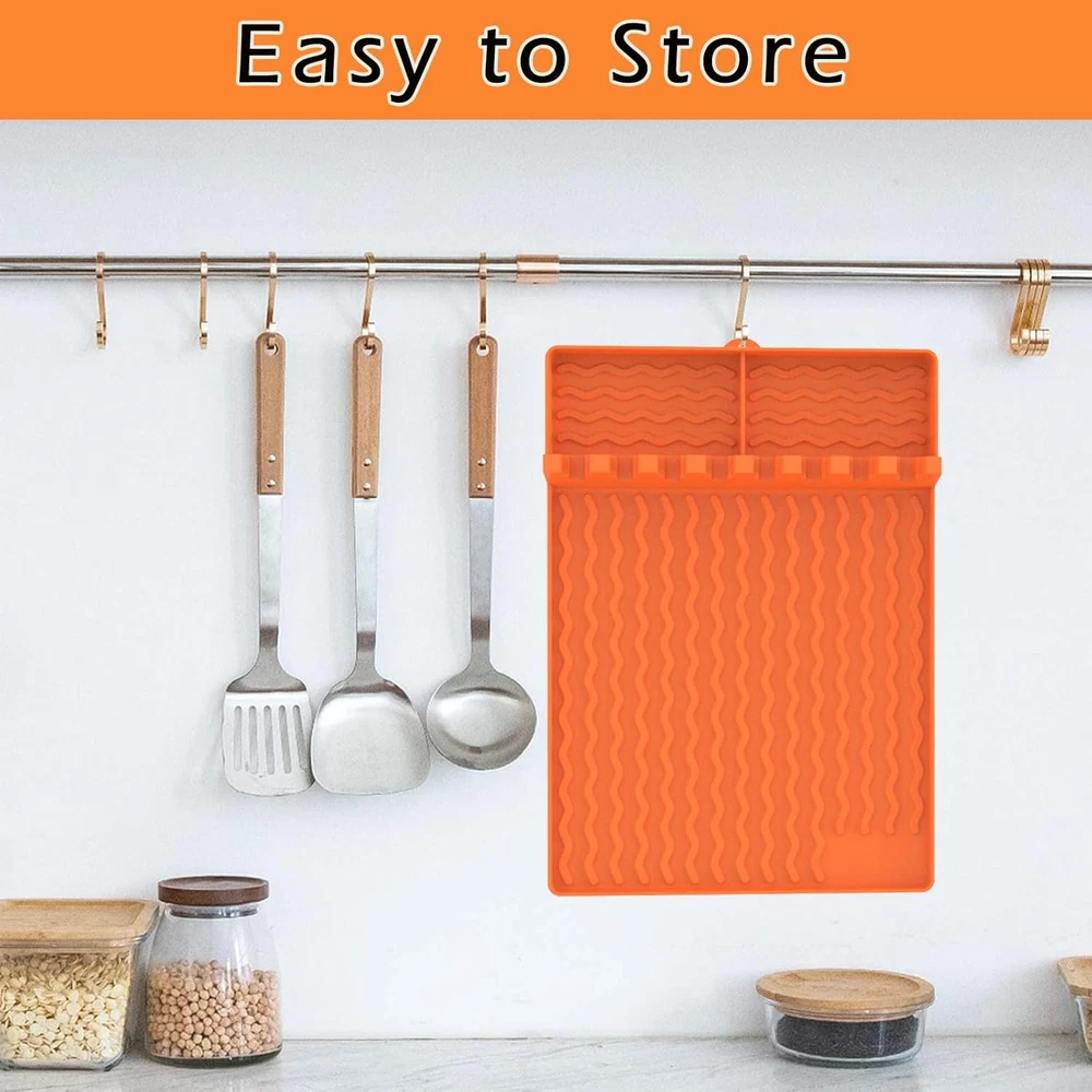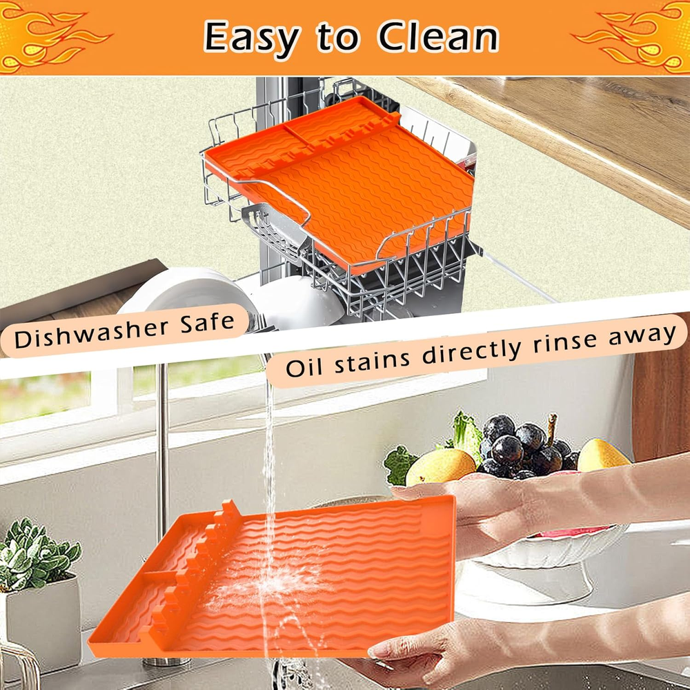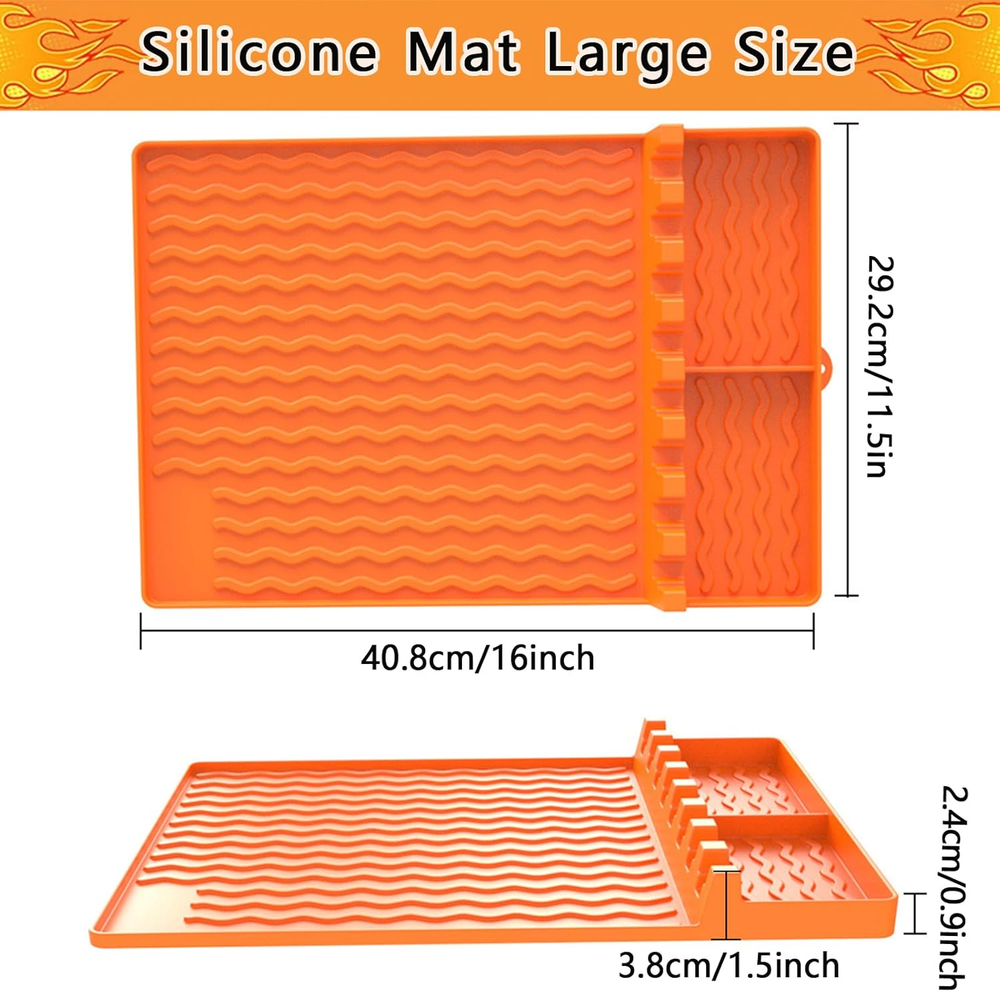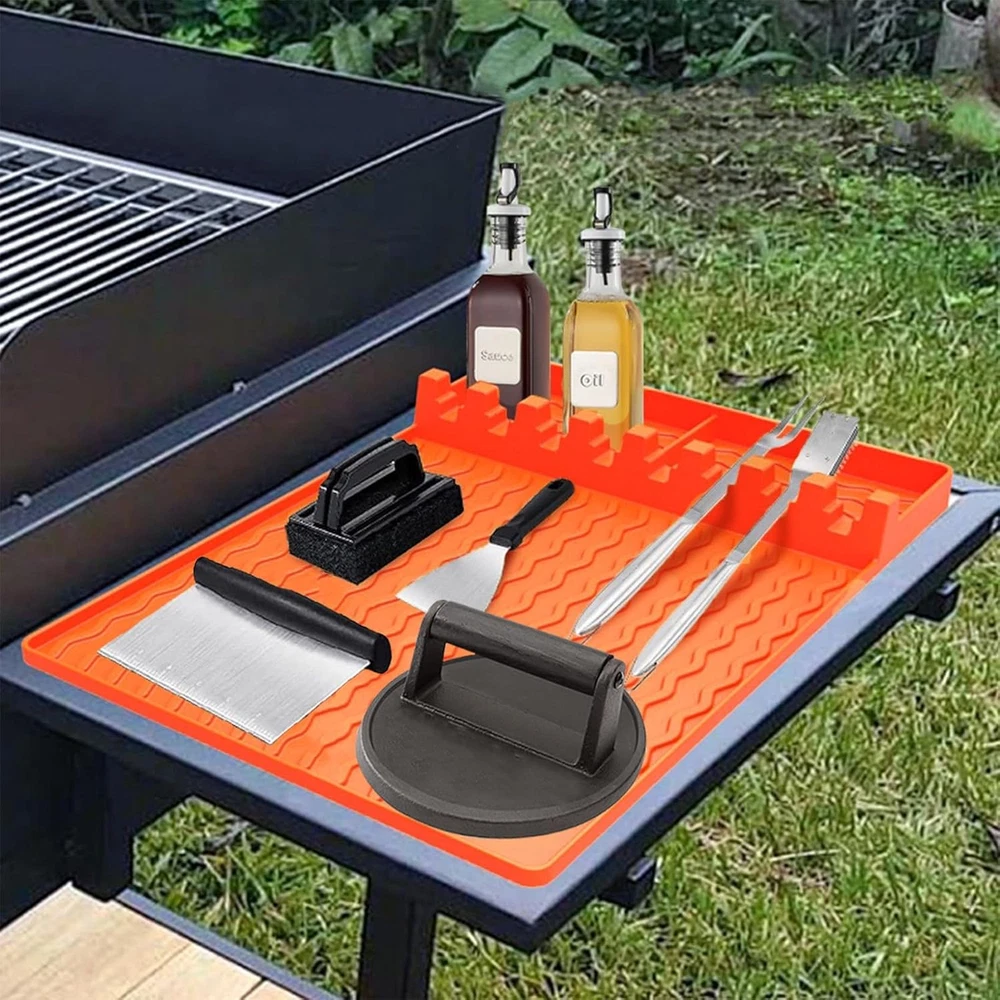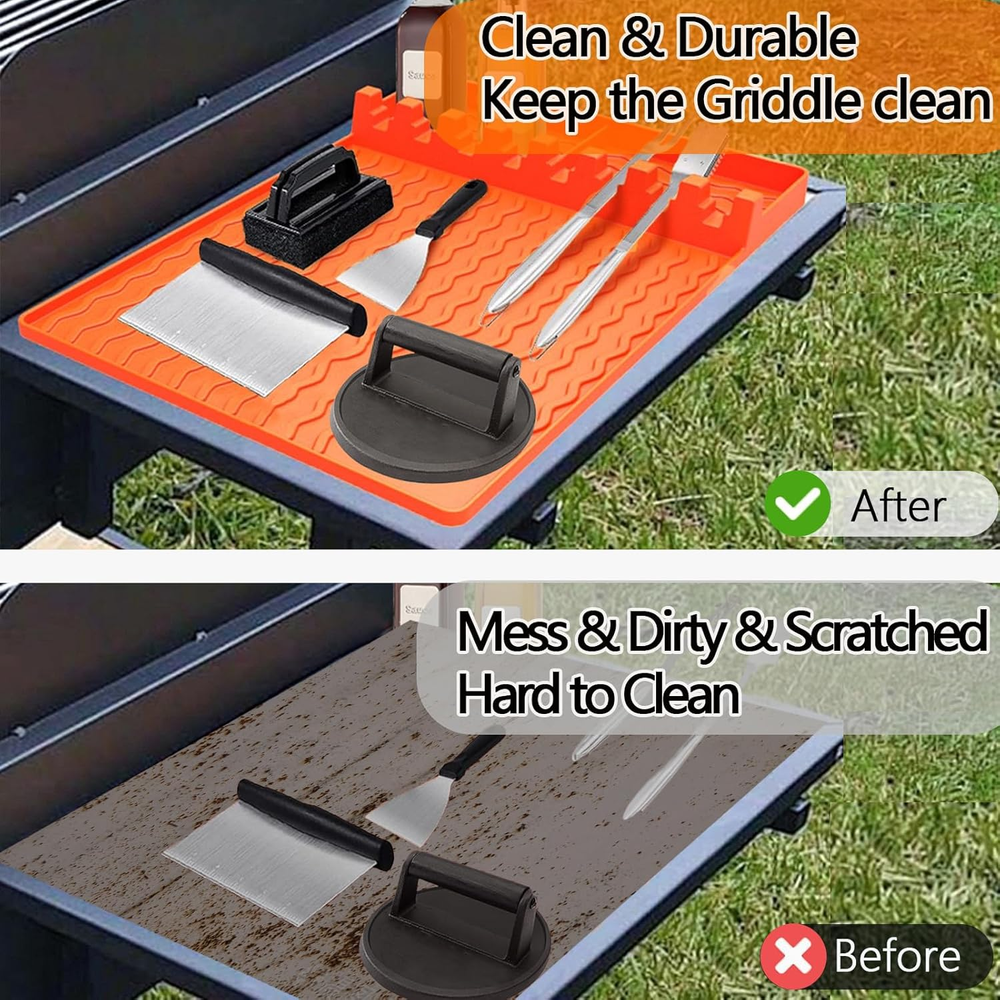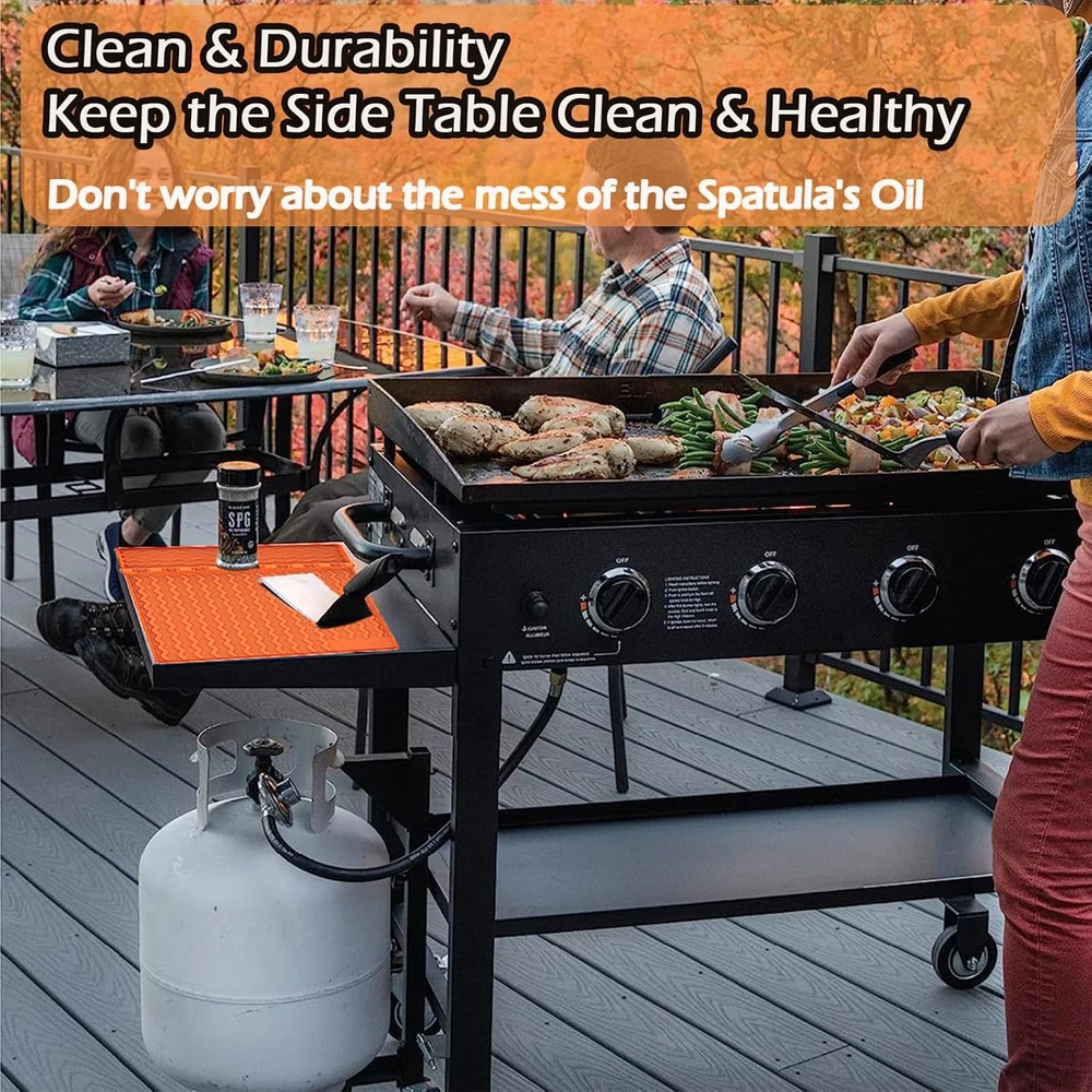 【Large Size Grilling Accessories Mat】 What you get is 1pc large size 16 x 11.5 inch silicone spatula mat with drip pad,This tool mat is durability and versatility.Blackstone side shelf mat can be used for grilling & BBQ Seasoning jars holder,BBQ Utensils holder,ladle spoon holder.perfect for outdoor and indoor kitchen,cooking and countertop to keep clean . 【Food-Grade Silicone Grill Accessories Mat】The Griddle Tools Mat is made of high quality Food-Grade silicone material,The grill mat is sturdy and reusable,Non-Slip and safe with drip pad for BBQ Cooking ,kitchen ,countertop ,and the grill accessories tool mat can withstand high temperatures up to 450℉. 【Multi-functional Silicone Mat】The Blackstone griddle accessories tool mat is suitable for a wide variety of BBQ Grills,Such as Griddle Accessories,Smoker Accessories,BBQ Accessories,Pellet Grill Accessories Tool Mat with side shelves.The Griddle Silicone Mat can be designed to hold a variety of Barbecue tools, spatulas, brushes,tongs etc Griddles accessories. 【Non-Slip & Heat Resistant】During the barbecue or cooking , silicone spatula mat can prevents the scratching the surface of the grill, and collect the remaining oil from the Spatula,keep side shelf cleaning and health and safety.the griddle accessories tool mat has heat-resistant properties.Not worry about high temperature issue 【Easy to Clean & Store】Silicone mat is very easy to clean by hand wash or by dishwasher. And easy to store. The silicone spatula mat can keep your kitchen stove ,countertop cleaning in cooking area.there is no more oil etc other food residues on side shelf or countertop cooking area. 【The ideal gift of choice】The Griddle accessories tools mat is an excellent gift choice for BBQ lovers, the silicone mat can be put in a variety of barbecue tools, and barbecue flavoring bottle, the silicone tool pad is very practical mat for barbecue and kitchen.the silicone mat is one of the most practical griddle accessories. 【Grilling Accessories】Blackstone griddle accessories for grilling ,grilling accessories,BBQ accessories,Grill accessories,grill mat,grill mats for outdoor grill,blackstone grill acessoreis,silicone mats for kitchen counter,blackstone silicone mat,silicone grill mat,silicone mat. Product Description Grilling Accessories for Blackstone Griddle Grilling Accessories & BBQ Accessories This Silicone tool mat can be used side table & side shelf; Silicone grill mat has helped with making clean up after grilling so much easier. Works perfectly with your grill , keeps mess of dirty cooking utensils from grill ; Making clean up easy . The silicone grill mat is a good fit , and cleans up easily in the dishwasher. you can use it every time you fire up the Blackstone. Love the nonslip and area to catch great and tools . Orange is bright and nice on your grill. Keeps the grill side trays clean. Everyone with a Blackstone should own these. Silicone Grill Mats for outdoor grill , Grill Tool Spatula Mat Griddle Accessories for grilling Easy to wash up after grilling , Spray it off or throw it in the dishwasher ; No griddle tools fit it other than tiny ones , and You will have one of these for each side of your Blackstone .Gives you plenty of space for your grilling tools , spices , bowls etc . you could certainly use for any other grill just be sure to measure . Cheap protection for a wonderful griddle These silicone mats are really convenient for just about anything cooking related . On the side shelves of your grill for spatulas or tongs , or on your kitchen counter-top for spaghetti sauce ladles , they make clean up so much easier. Mat has a feature to hold your utensils securely; This mat makes it to where I don't have to continuously wipe it down ; Large Silicone Tools Mat for your Griddle Large tool mat for outdoor grill or kitchen counter This particular mat is larger than the other branded mats and has a feature to hold your utensils securely Silicone Tool Mat Size is 16" x 11.5" ; This tools mat will works great for a sanitary lay down area for your utensils and cooking spices when grilling outdoors ;Silicone is heat resistant and easy to clean , bright color makes it easy to keep up with ; Rolls up for storage when you're down ; This is a very useful silicone grilling mat , Not only can you use it outdoors when you are grilling , but also you can put it to good use in your kitchen while cooking. This griddle accessories fits perfectly on the side of our grill and when your done flipping Your burgers , you just throw the spatula on the mat and it will save you from cleaning up that nasty grease that used to get all over your grill. Griddle accessories for outdoor grill and kitchen counter ,made clean up after grilling Silicone Grill mats for outdoor grill and kitchen counter The silicone mat has slots to lay your grilling tools and kitchen cooking utensils in , then simply hand wash or toss the mat in the dishwasher . The grill mat has two two smaller section , one grooved and the other not with serve as drip trays or you can use for your seasonings , etc . The Silicone grill mat for Blackstone is a lifesaver when it comes to cleanup.