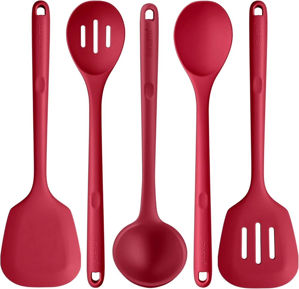 Material Silicone Color (4) Red Size large Item Weight 620 Grams About this item [High Heat Resistant Food Grade Silicone] U-Taste nonstick cooking utensils set is made of high heat resistant BPA-Free material. There is no melting, chipping, peeling or curling issues in cooking, flipping, frying, serving and mixing work. It's not like wooden utensil that will get moldy or some metal utensils that have sharp edges. Advanced silicone and improved design enhance the resistance to load and tear. This cooking gadgets with non scratch surface is safe to your non-stick cookware. [13.6 Inch Long Seamless Integrated Design] The dishwasher safe kitchen set with solid integrated design makes no crevices to catch food particles or dishwater. No breaking issue as there is no joint places. Its size is perfect for most mixing, stirring, serving, basting needs. The handle is long enough for most large cookware without being too big to use at the table. Long length keeps your hand far from the heat, yet can still fit in your drawer for easy storage and hang it for easy access. [Scratchproof Silicone Tip Safe with Non-Stick Cookware] Using this silicone utensils set to protect and not scratch the coating of your non-stick pots and pans. These kitchen tools come with a soft rubber tip. They are gentle on the stick-free surface to spare any damage to your fancy frypans or cookpots. If you are getting tired of the scratching sound by metal utensil, U-Taste silicone cooking and baking utensil will be a perfect choice. The silicone handle provides a nice soft grip as well. Material Silicone Color (4) Red Brand U-Taste Size large Item Weight 620 Grams