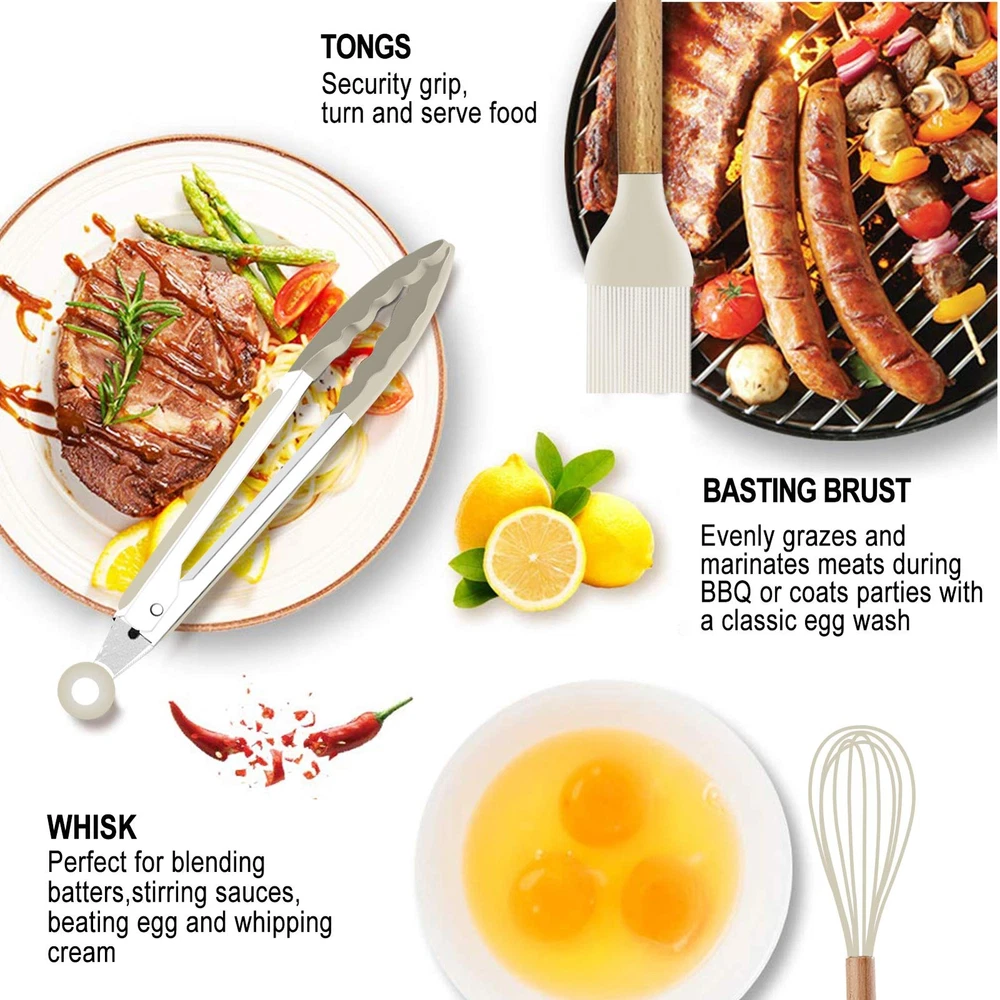 【19pcs Premium Kitchen Utensils Set】Silicone kitchen utensils set includes 12pcs cooking tools that will suit all your cooking and baking needs. Our silicone kitchen utensil set includes: Tong, Whisk, Basting Brush, Slotted Spoon, Slotted Turner, Pasta Server, Spoon, Spatula, Round Spatula, Solid Turner, Soup Ladle.Also come with the gift of 5pcs small Measuring Spoons of different sizes and 2pcs Silicone Mini Gloves all are in gold color. 【Heat-resistant & Non-stick & Non-Toxic】Our silicone kitchen utensils set use food grade silicone which are super heat resistant up to 464°F/240°C.The high heat tolerance of the silicone heads prevents the utensil from melting when exposed to heat. Kitchen utensils are also non-stick and non-toxic,easy to use and store. Only the basting brush silicone head and wooden handle are designed to be detachable, it can be put back at any time without affecting the use and easy to clean. 【Safe Cooking Utensils for Kitchen】Our kitchen tools are made of high quality thermoplastic silicone heads designed to protect the surface of precious non-stick cookware. silicone is safe to use for any type of food .The kitchen utensil set does not react with food or beverages, or produce any hazardous fumes. 【Solid Wooden Handle to Prevent Burns】This cooking utensils set combination of silicone head and wooden handle, the wooden cookware handle is ergonomically designed for comfortable grip, does not transfer heat to protect your hands and provide protection against rust. 【Easy Storage with Holder】Our silicone kitchen utensils set comes with a plastic holder for convenient storage organization. Each wooden handle has a practical hanging hole for wall hanging using hooks.