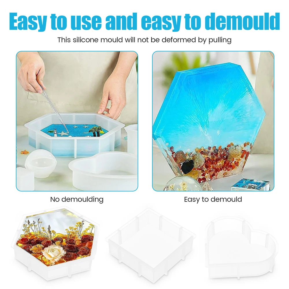 [---Welcome TO Our Store! Happy Shopping! Happy Life---] Highlight description: Set Contains: Each set contains 3 large molds, heart, square and hexagon, including 3 small molds, ball, cube and triangle High Quality Material: This silicone mold is made of food-grade silicone material, safe and high temperature resistant, and can be used with confidence Easy to Use: This silicone mold set is safe in material, easy to use and release, and will not deform easily Soft: Our silicone mold can withstand the temperature of -40° to 270°. The mold is soft and it can be pulled at will, not easy to deform, and can be reused Versatile: The set contains 6 different shapes of molds. You can make a variety of different shapes of products by using the imagination and creativity Detailed description: Description: This silicone mold consists of food-grade silicone and is safe and high temperature resistant. And it's easier to release. It is soft and can be pulled at will, not easy to deform, but also can be reused. You can use them to make many different shapes. Key Feature: Soft: Our silicone mold can withstand the temperature of -40° to 270°. And it is soft as well as can be pulled at will, not easy to deform, and can be reused. Easy Release: This silicone mold set is safe in materials, easy to use, easy to release, and does not deform. Specification: Product Name: Resin Molds Materials: Silicone Size: Hexagon - maximum 26 cm, side length 13 cm, height 5.1 cm; Heart shape -17 x 18 x 4.6 cm Square -15.5 x 15.5 x 5.1 cm Spherical - diameter 4.8 cm; Triangular body - height 4.8 cm; Cube - Side length 4 cm Number of molds: 6 Note: 1. There may be slight color differences between the product picture and the actual item. We will do our best to display the color as accurately as possible. 2. Please allow slight dimensional discrepancies due to manual measurement. Parts List: 6 x Resin Molds We accept Payoneer/Mastercard/VISA/Google Pay/American Express etc. Immediate payment is needed, so that we can finish your orders, then dispatch and post them in time. We really appreciate your business with us, and hope to keep it lasting. Orders will be processed and dispatched within 1-5 working daysafter payment received from Monday to Friday. Saturday and Sunday orders will be posted in the following Monday. when items are in peak period, the time will be prolonged according to certain situations, which may beyond our control, but we are always ready to help you track the delivery info. Returns: 1.Defective goods must be returned within 30 days from the delivery date. The buyer is responsible for the return shipping fee. We will not reimburse the return shipping fee unless when we have shipped the wrong item.