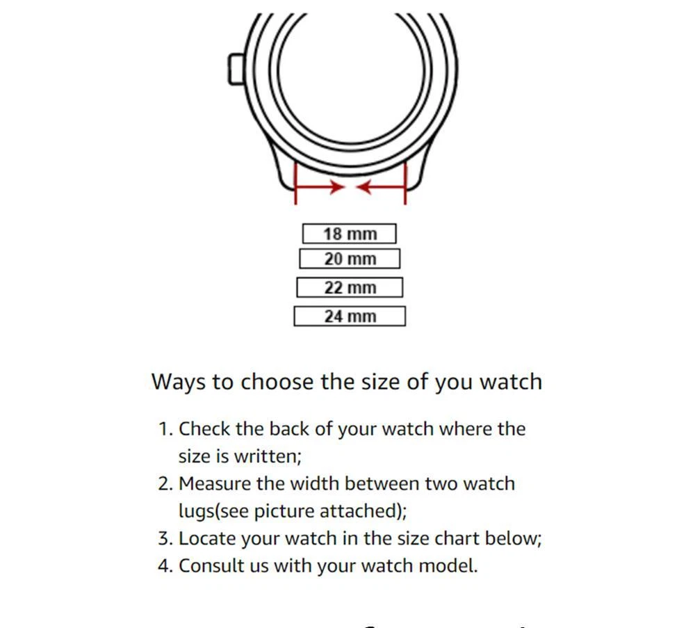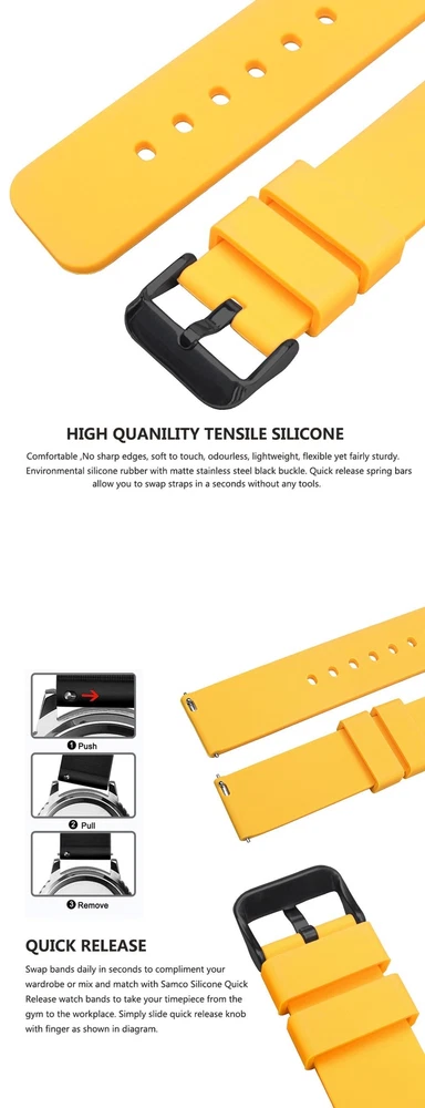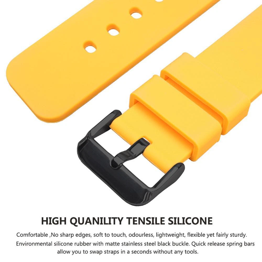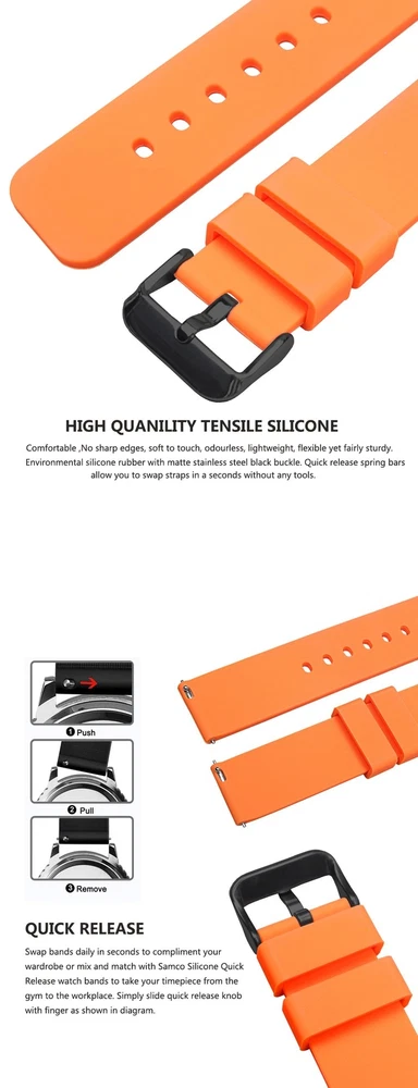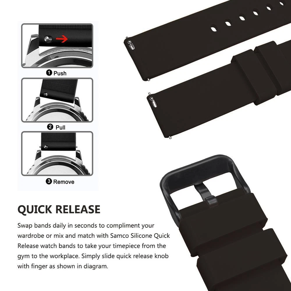 FREE SHIPPING 30 DAYS RETURN EASY PAYMENT Silicone Watch Bands 14-24mm Soft Quick Release Rubber Straps for Smartwatches BREATHABLE OUTSIDE SPORTS: Samco watch band is a stylish, soft and breathable watch accessory which can be used either in wet or hot weather. It is of good quality and reliable, and with its durable, dirt & wet resistant features, you can enjoy yourself with no concern while doing fitness, swimming, diving, or climbing. ALL SIZE AVALIABLE 12mm, 14mm, 16mm, 18mm, 19mm, 20mm, 21mm, 22mm, 24mm PERFECT FOR OUTSIDE SPORTS Textured back prevents slipping, improves comfort and airflow; Waterproof and washable (eliminate stink!); Perfect for fitness and active lifestyles SELECT COLOR AND SIZE Measure watch lug where band and spring bar meet the watch casing. It is important that your watch's lug width is the exact width of the band you select or spring bars will not fit correctly. SERVICE & BUYER PROTECTION - We hope you can finish your order payment as soon as possible , to make sure you can receive our high quality watch as soon as possible. - Custom/Import Taxes: Buyers are responsible for paying the duties, taxes or VAT (if any) in their country. The amount you paid excludes any custom tax. We usually declare as "watch(Gift)" when shipping to try to help you minimize any potential import taxes/VAT/GST. But we can't gurantee no tax charges, as it depend on your country's policy. - Items will be shipped as the payment being received.(Excluding Weekends and Public Holidays) - Full refund if parcel not received or returned. - Please contact our customer services executive before the item return. - The defective item could be returned within the warranty period AND with the original package. - Return items must not be used. - Buyer is responsible for all return shipping charges. Please view all photos along with reading this description. If there is anything I need to clarify, feel free to ask questions. so please keep checking my items for sale. Dear Customers, you will receive exactly the same item which you see on the pictures, not similar or other. This is a lovely item to own or to give as a special gift. For any questions please contact us !! Handling Time: 1-5 Business day. Returns I check myself each product and sell only the best quality products. In any case, if you are not satisfied with the product, first, please contact me and I will do everything to your satisfaction. In any case you have a 100% Guarantee and refund. I accepted within 30 days, In its original packaging and on condition the item is its original condition as received. buyer pay for shipping and all additional payments such as tax. My customers are very important to me! please, In case of any problem or question, please feel free to contact me and I will do everything I can to make you be satisfied! Thank you for shopping REVIEWS great and looks great! Excellent quality. Fast shipping. Will buy from again soon. THANKS!!! Delivery was fast. Excellent seller, great communication. I advise everyone