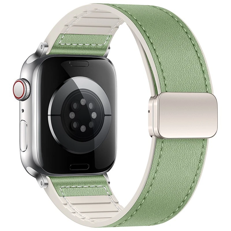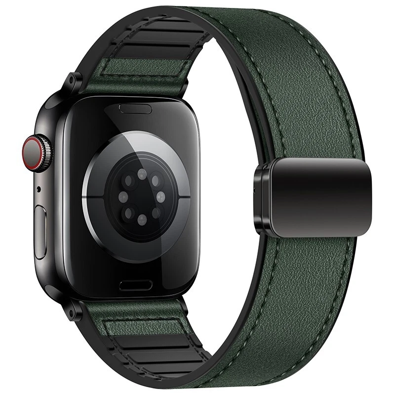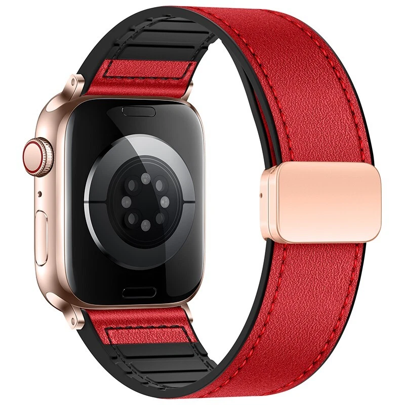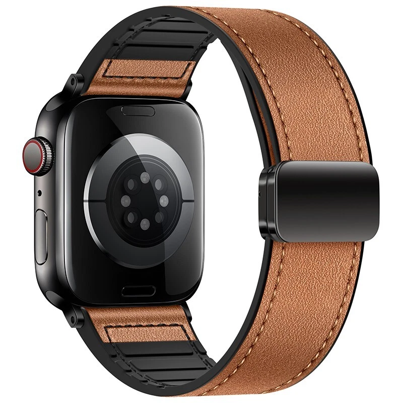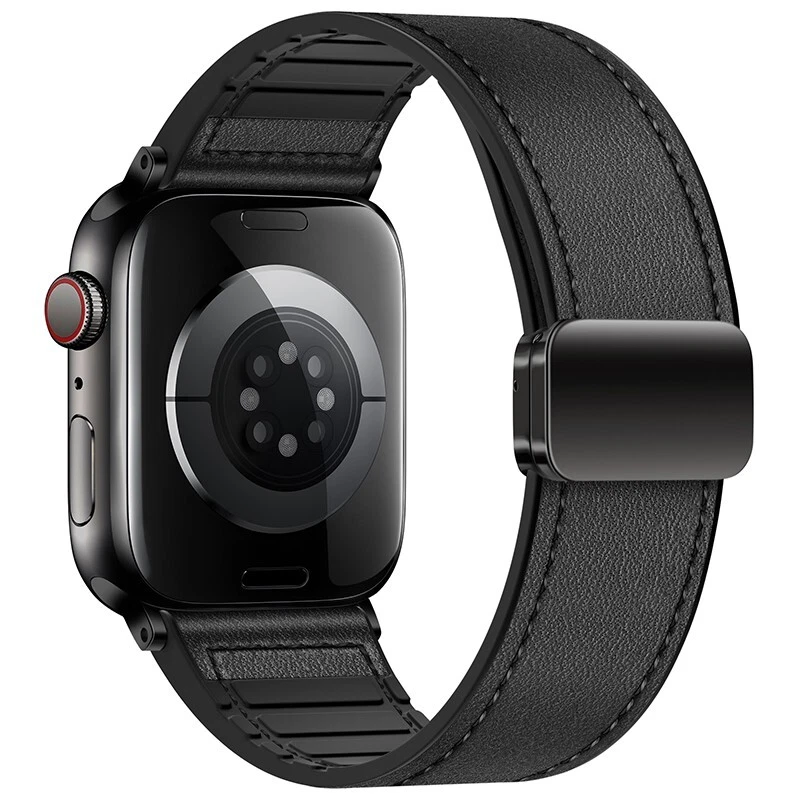Silicone leather strap for Apple Watch Series 10 9 8 7 6 SE 40/44/41/45/46/49mm Features: ● 100% brand new high quality. ● Fashion and sports in one. If you want to go to a party or go out on a Friday night or work out at the gym for an active lifestyle, just show off your Apple Watch. ● Made of high-quality silicone and leather, it is durable, stylish and breathable. ● Double magnetic buckle reinforced design for a firmer fit. ● The high-quality material is soft and comfortable, and it fits the wrist closely. ● As with all Apple Watch bands, you can pair this band with any Apple Watch case of the same size. ● Suitable for slim size: > 38/40/41/42mm Size: Fits 5.12"-7.28" (133mm-190mm) wrists > 44/45/46/49mm Size: Fits 5.7"-8.66" (145mm-220mm) wrists Compatible: > Available on Apple Watch Ultra / Ultra 2 > For Apple Watch Series 9 / Series 8 / Series 7 / Series 6 / Series 5 / Series 4 / Series 3 / Series 2 / Series 1 / > for Apple Watch Nike > for Apple Watch Hermes > for Apple Watch SE Package Contents: 1x PACK silicone leather strap !! !!! ( PS: The Apple Watch in picutures is Not Included )