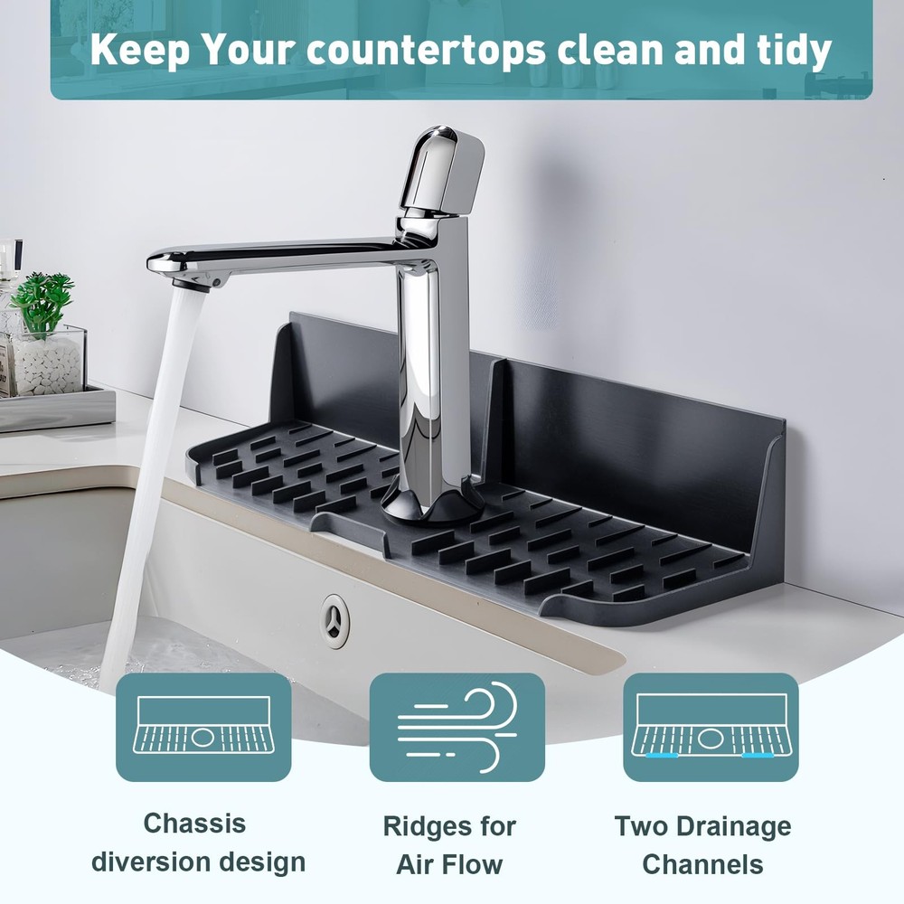 Practical organizer: Suitable for open front sink faucet pads, it can prevent water accumulation and splash on the countertop. The drip tray adopts a 5 ° inclined design, which can effectively collect water and soap droplets on the faucet handle and guide them to the sink. Keep the surface dry and clean. Faster Drainage & More Leak-Proof: Size: 5.7" x 17" x 4", single-hole faucet. Unlike others, we've increased the size, thickness, and weight of our product. The latest 5° slope design and Waterproof panel make it drain faster more leak-proof, drying faster. This means no water accumulation next to the sink that needs cleaning, and no water marks left around the faucet. Give your kitchen a labor-saving upgrade! MULTIFUNCTION: It's not only a faucet drying mat, it also a sponge holder for kitchen sink, dish soap tray, dish drying mat. For kitchen: put sponge, dish soap, detergent, brush, and bottle on it. For bathroom: put facial cleanser, razor, toothbrush cup on it. Used as a small organizer mat, drain pad. It is a super practical kitchen & bathroom gadgets. KEEP YOUR COUNTERTOP DR:Silicone faucets pad new designed for faucet splash with the draining, upgrading your kitchen sink & bathroom countertop in an effort-saving way! This means never gets soggy, or any water spots by the faucet and sink. You don't need to worry about the water staying on the mat or counter. DECORATION FOR KITCHEN: Using these Silicone Faucet Splash Catchers with their black luxurious, timeless color and seamlessly blends into your home to create perfect Sink Accessories, add a touch of luxury in your kitchen will give your house an amazing makeover and elevate your home decor.