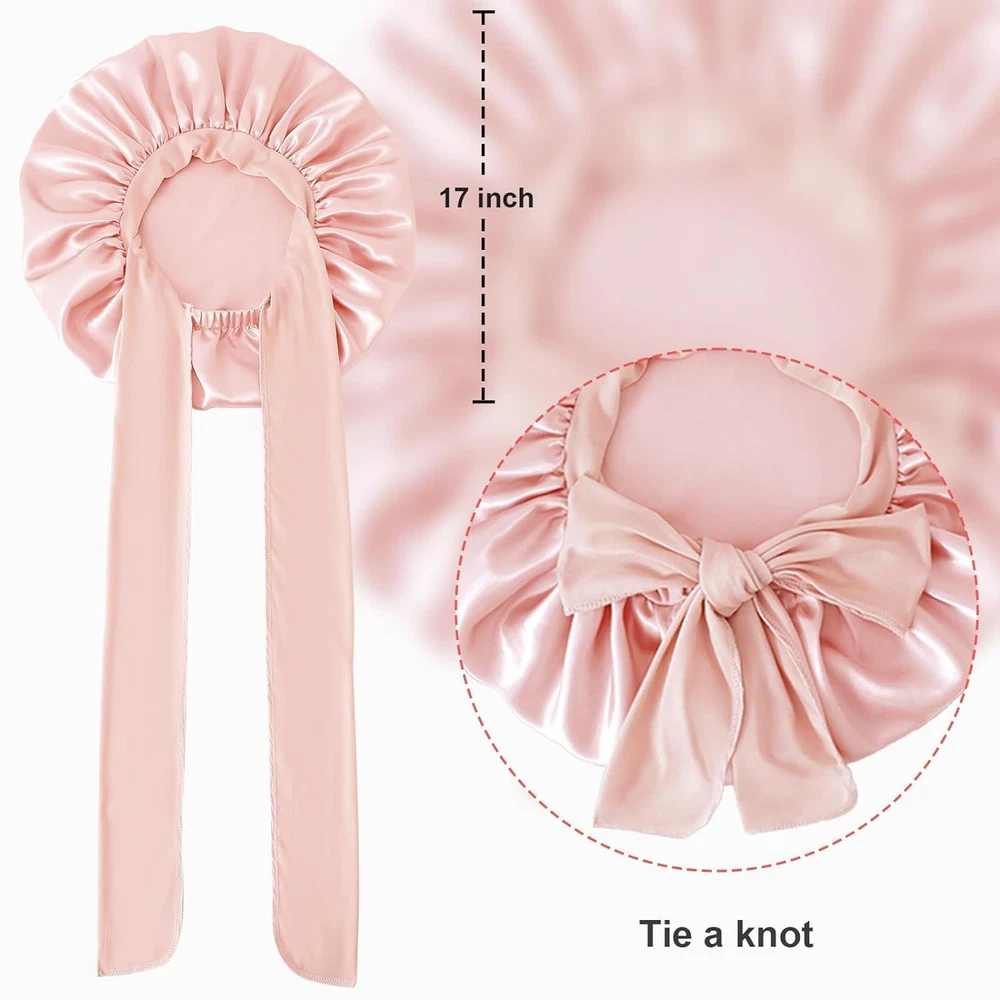 Pink Bonnet Satin Silk Hair Bonnet With Tie Band for Sleeping Large Bonnets Hair Wrap with Adjustable Straps Hair Sleep Caps for Women Curly Braid Hair [Size]: The pink bonnet size is adjustable. Under normal conditions, the diameter is 15.7 inches, suitable for people with a head circumference 19-24 inches. [Double layer material]: The satin bonnet is designed with double-layer fabric can wrap the hair well, and after using the hair mask, it will not stain the sheets when sleeping. [Silk material]: The soft silk bonnet material is used to fit the skin, there will be no inappropriate places, and the texture is soft enough to make it comfortable to use anyway. [Applications]: This adjustable bonnet can be used to wrap the hair while sleeping so that it will not be messy, and it can also protect the hair from getting wet when taking a bath. [Multifunctional]: This sleep bonnet Can also be worn during makeup, bathing, housework