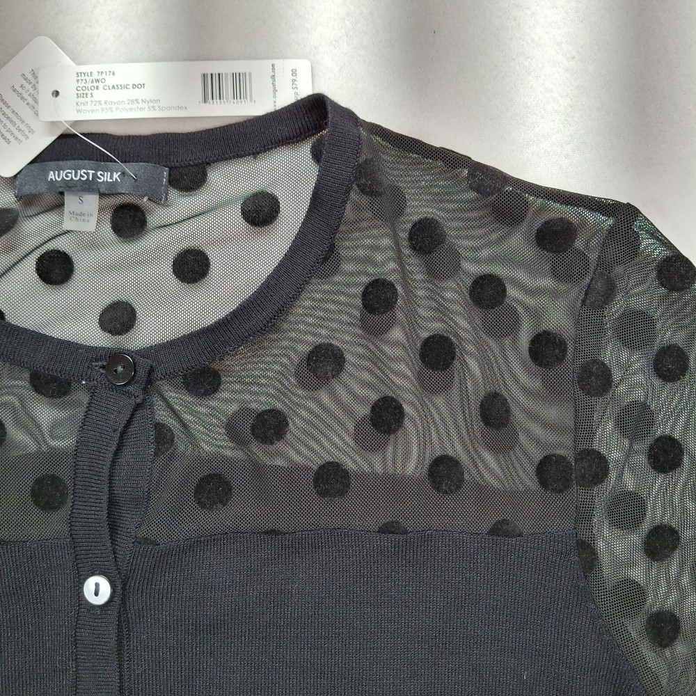 August Silk Cardigan Sweater Women Small Black Button Front Sheer Polka Dot pit to pit 17.5" shoulder to hem 22"