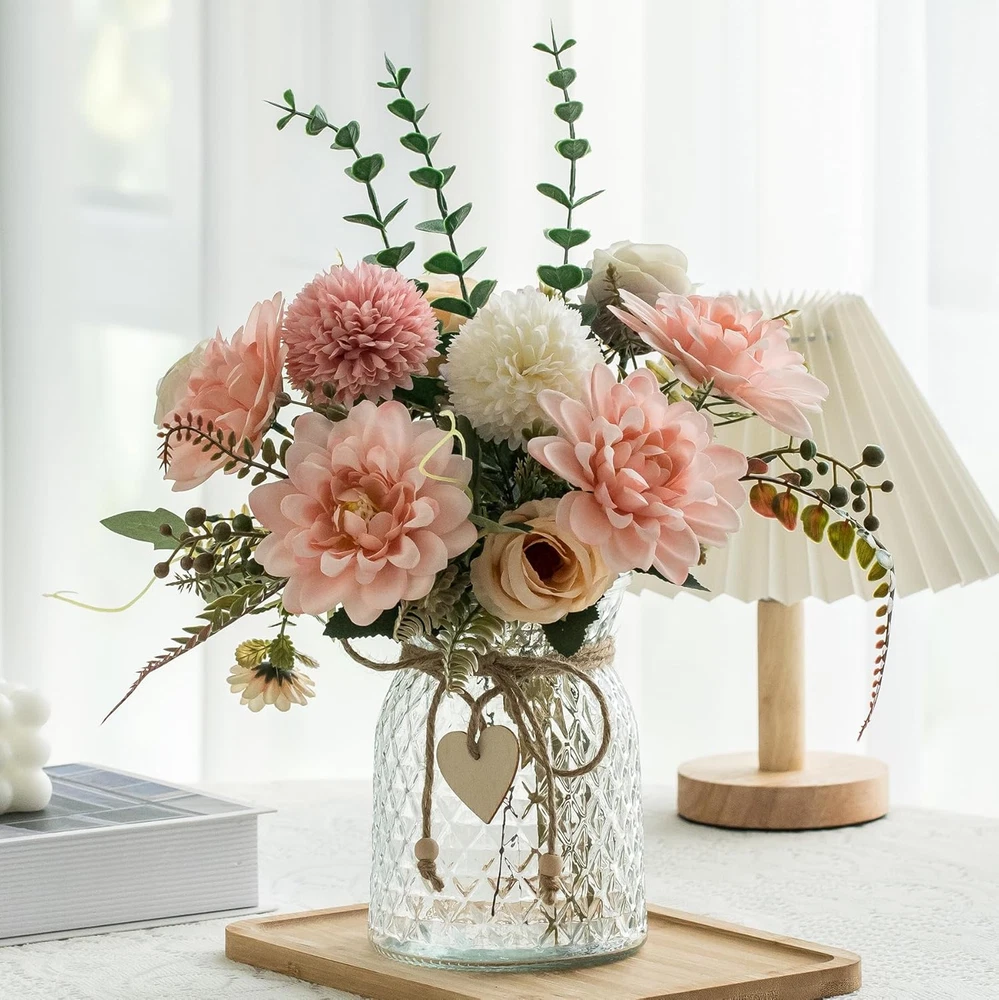 ✿Artificial flowers with vase include: Flower arrangement with vase include dahlia eucalyptus Champagne roses and Pink White Hydrangea Flower flowers fake plants and matching one grass vase. The glass vase with heart-shaped and spherical pendants and hemp rope. ✿High quality materials: dahlia and Peony are made of high quality silk material.artificial plants are made of high quality plastic, The stems made of soft plastic with steel wire inside that you may 360 degrees bend or prune to flexible adjust to make flower arrangements décor.so that the flower arrangement looks more natural. ✿Decorate your home: Fake flowers with vase suitable for home decor ,coffee table decor,table centerpieces for dining room,centerpiece table decorations,office decor,kitchen table decor,farmhouse decor,bathroom decor,bedroom decor,room décor ✿Suitable Size : Total artificial flowers bouquet height 15 inches, the vase is 6.2 inches high, and the diameter is 4.7 inches. Bouquet and the size of the vase is perfect collocation, It is also an ideal holiday gift, such as Christmas, Thanksgiving, New Year's, Mother's Day,and house warming gifts new home etc.(Size may be 1-3cm inaccuracy due to hand measure. ✿Warm tip: When shipped, each bouquet are putting close, customers can adjust it to the most natural state. You can adjust it according to your requirements after receiving them.We believe it will become more beautiful through your arrangement. Product Description Fake flowers create romantic beauty that enables you to enjoy poetic homelife in your dining table, living room, bedroom with these silk flowers. our Aubcee are creating the most realistic faux floral yet and hope it can make your every moment special !! Our Aubcee artificial flowers is trying to develop some beauty of life, Fake flowers can be use to decorate wedding, rooms, countyards, and any place you want to decorate. They can add some romantic elements into your life and colorful your life. Glass Vase Special Details The whole vase has a retro style, which forms a perfect match with the Flower. The vase is made of high quality clear glass. The body of the vase has a three-dimensional mesh pattern. Table centerpieces for home decoration for office party shelf decoration. Glass vase with handmade wooden heart and wooden beads, hanging from the vase with twine as decoration. The vase has a base diameter of 4.5 inches and a vase height of 6.1 inches. Size may be 0.5inch inaccuracy due to hand measure.Please confirm the size of the product description before purchase When shipped, each bouquet are putting close, customers can adjust it to the most natural state.
