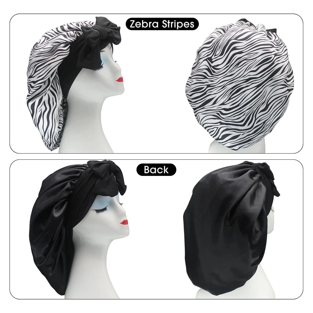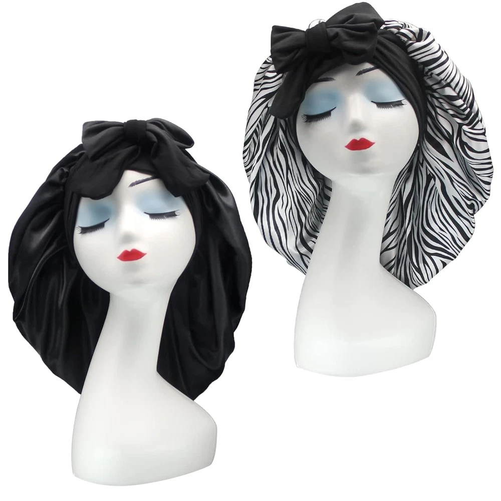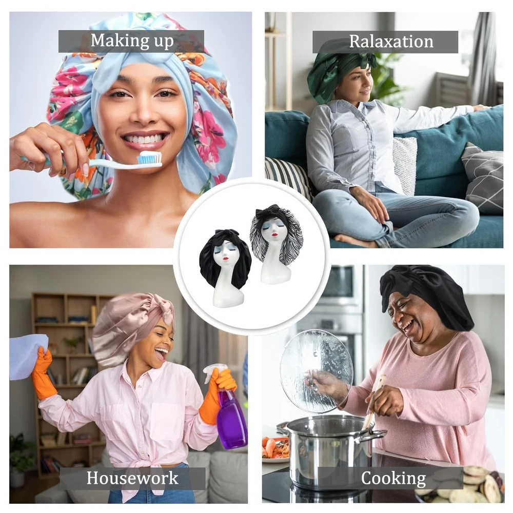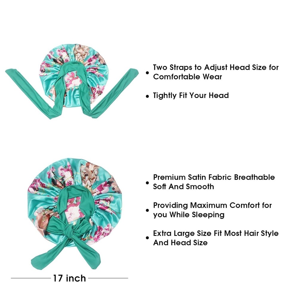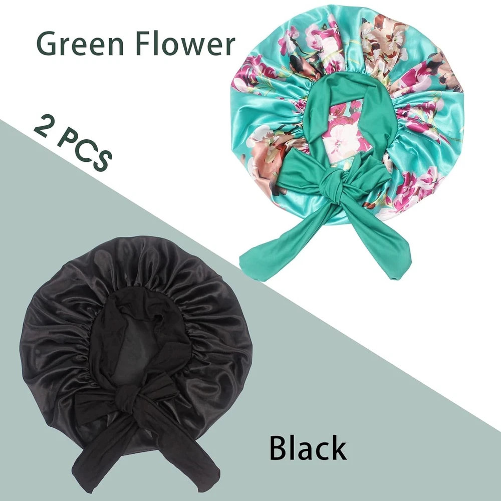【Satin Bonnet with Stretchy Tie Band】- This silk satin hat has a soft elastic long strap, you can make tie and make bonnet firmly on head, it protects your hair well. He makes you feel comfortable. Sleeps all night and doesn't slide off your head while sleeping. Not too tight and breathable. Washable and no fade. 【Comfortable Fit】- Our shower and bath caps are designed with a concealed adjustable flexiband to ensure they are comfortable for all head sizes. They also feature an adjustable bow for added comfort and an enhanced fit, making them perfect for all hair lengths and types. You can also make a nice bow on the forehead or side using the soft wide band to make you unique and beautiful. 【Premium Fabric】- Our reusable shower caps are made from an innovative premium performance fabric which is latex-free, breathable, durable and made to last. The soft silky material adheres to the skin and has a soft texture, ideal for everyday use. 【Stylish and wide Use】- The elastic silk head scarf will keep your beautiful appearance at work, sports, parties and outdoor dinners. Suitable for many occasions, face washing, skin care, hairdressing, sleeping, housework, cooking, makeup, fitness, running, etc. 【Perfect Gift】- You can send these beautiful and practical sleep hats to your wife, mother, sister, girlfriend on birthday, Mother's Day, Thanksgiving Day, Anniversary, Christmas, New Year, etc. Set Includes : 17" 2 Pack Shower Caps (Black+Green Flower),