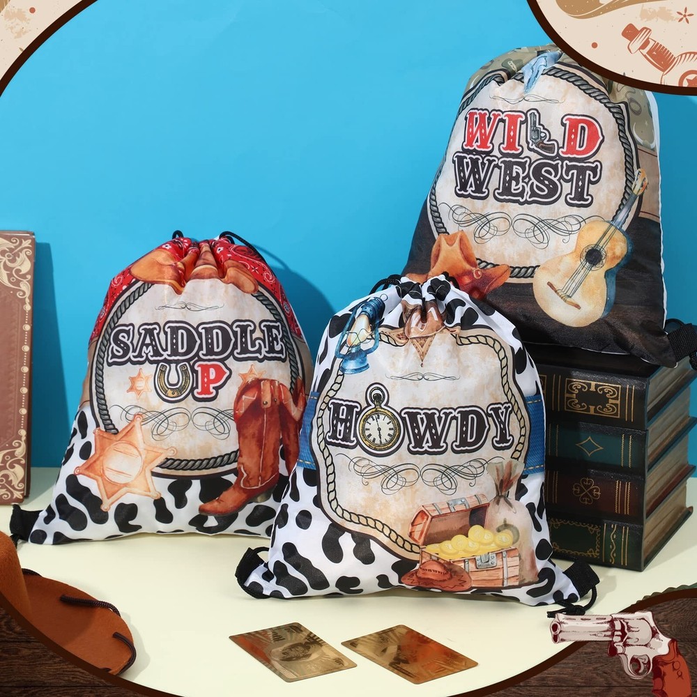 Silkfly 12 Pcs Wild Western Cowboy Party Drawstring Backpack Bag Beach Sports Cinch Bag for Cowgirl Birthday Supplies Product Details Number of Items: 12 Brand: Silkfly MPN: HAA-Silkfly-447 UPC: Does not apply EAN: Does not apply Package Dimensions: 14.49 x 2.48 x 2.4 inches Item Weight: 9.9 ounces Country of Origin: China Item model number: HAA-Silkfly-447 Department: unisex-adult Manufacturer: Silkfly Age Range Description: Adult Number Of Items: 12 Units: 12 Count Package Includes: you will get 12 pieces of western cowboy party drawstring backpacks, designed in 6 cool styles, which are enough to meet your daily wearing or sharing needs, as well as served as party decorations Lightweight and Reliable Material: the cowboy drawstring bags are made of quality polyester material, reliable, sturdy and durable, hard to break or deform, and easy to clean without fading easily, lightweight and will not cause much burden to you, reusable and long lasting for a long time Portable Size: each string bag backpack is measured approx. 12 x 10 inches/ 30 x 25 cm and can hold most of the items you need for a west cowboy party, these bags are foldable and easy to store for easy portability; The proper capacity is ideal for holding gifts, candies, desserts, snacks, dolls, and more, besides, you can also use it to store daily necessities, such as books, water bottles, clothes, shoes, and so on Classical Cowboy Theme Elements: these drawstring party favor bags are designed with many classical western cowboy elements, such as cowboy hats, boots, wheels, cow skulls, and so on, full of cowboy style, making your cowboy themed party more delightful and memorable Western Cowboy Party Decorations: these cowboy theme draw string bags can be widely applied as gift bags for many occasions, including birthday parties, holidays, Western cowboy parties, cowgirl parties, family gatherings, friends reunions and so on, and they also can be applied for traveling, hiking, summer camping, and other outdoor activities