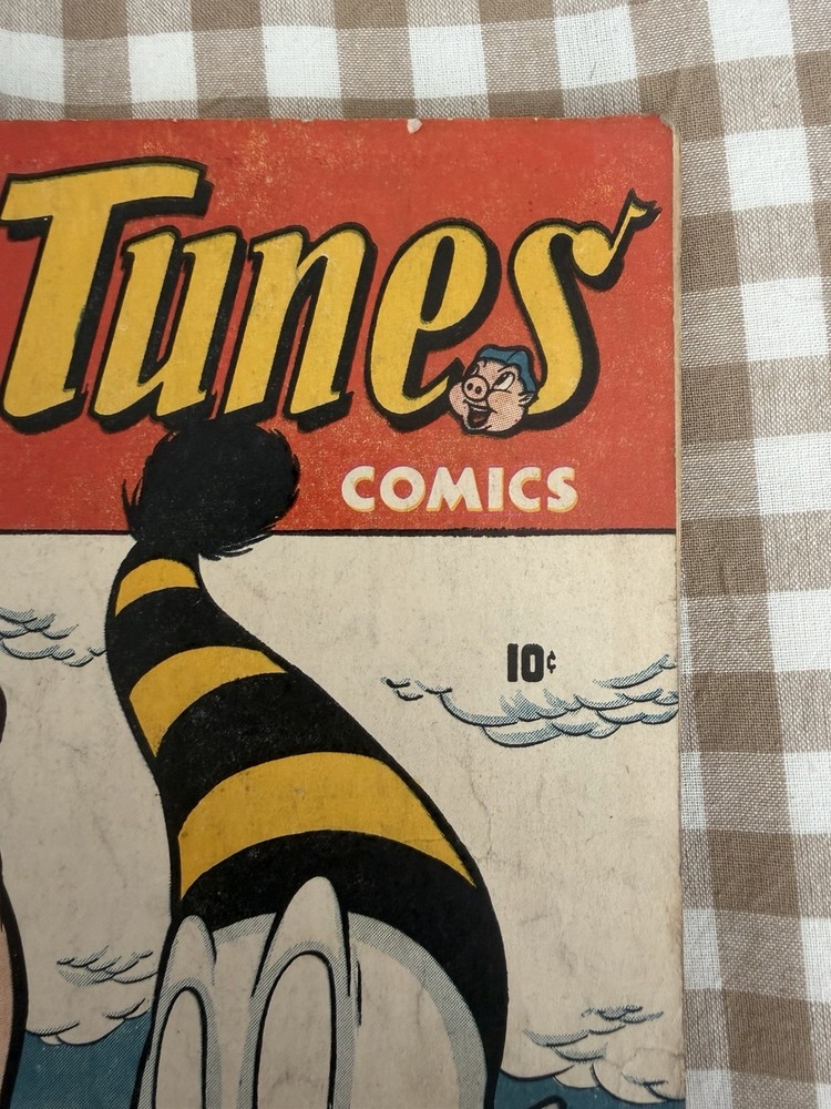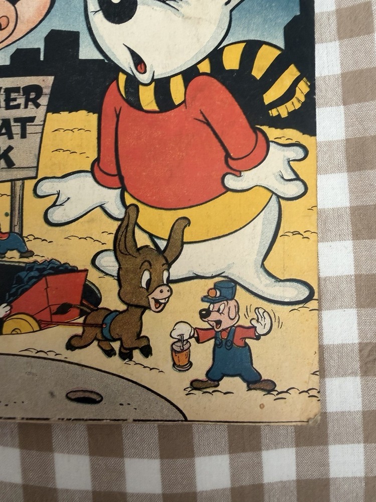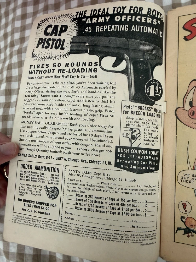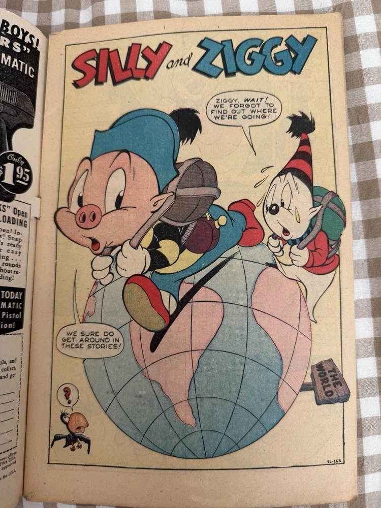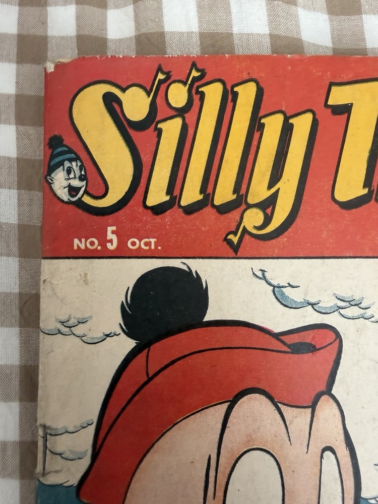 Silly Tunes Comics #5 – October 1946 Atlas News Company (Pre-Marvel Comics) Golden Age Funny Animal Comic Original 1946 issue featuring Silly and Ziggy. Classic post-WWII Atlas funny-animal artwork and era-correct advertising. Condition: This book is complete and ungraded. Moderate wear consistent with age, including spine wear, edge and corner wear, surface creasing, and general toning. No known restoration. Staples are present and pages are intact. Please review all photos carefully — they are part of the description and show the exact book you will receive. Details: • Publisher: Atlas News Company (predecessor to Marvel Comics) • Issue: #5 • Cover Date: October 1946 • Cover Price: 10¢ • Genre: Golden Age Funny Animal / Humor • Complete with original interior pages and vintage advertisements Sold as-is due to age. From a smoke-free environment. Will be packed carefully with backing board, protective sleeve, and rigid mailer.