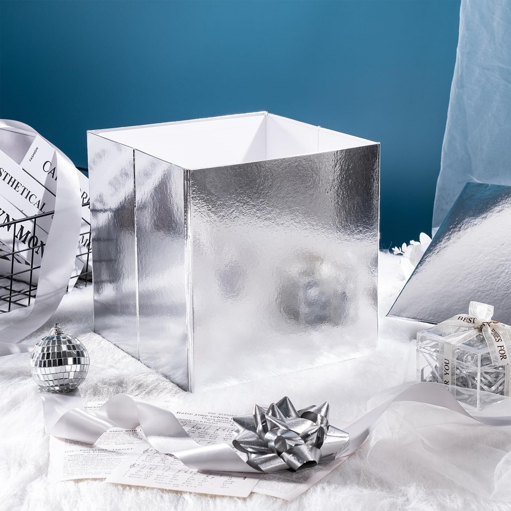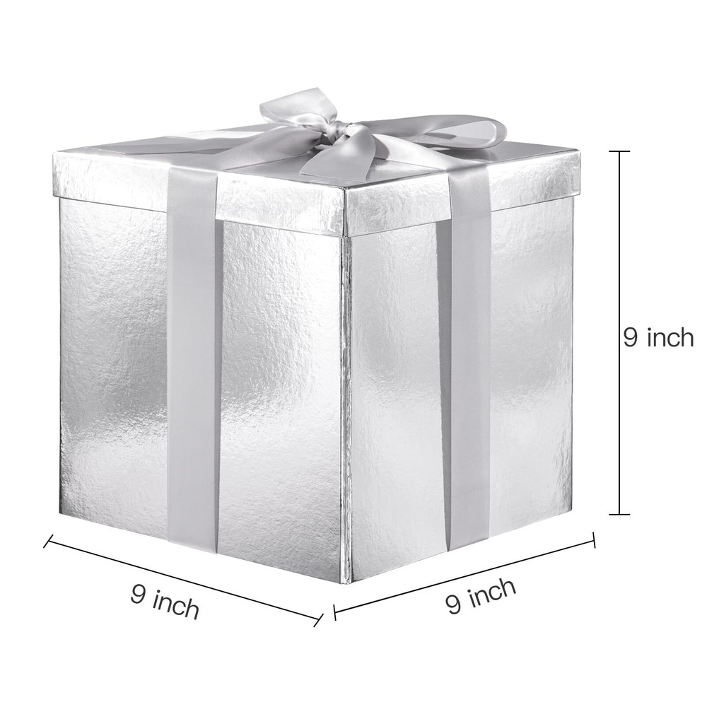 Silver 9x9x9" Medium Birthday Gift Box with Metallic Lid, Ribbon & Collapsible Design