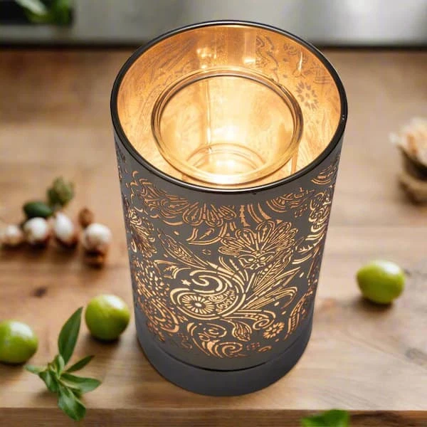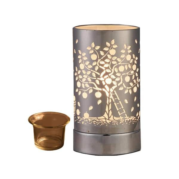3 in 1 Silver Apple Tree Touch Lamp, Essential Oil Diffuser and Wax Warmer; Four levels of touch sensor variable lighting to choose, Includes optional scented oil and wax glass container, one 20watts 9G bulb, 120 V. ETL certified. Made of Stainless Steel and Glass. Size: 3.75 in. x 3.75 in. x 7 in. With 1 extra bulb.