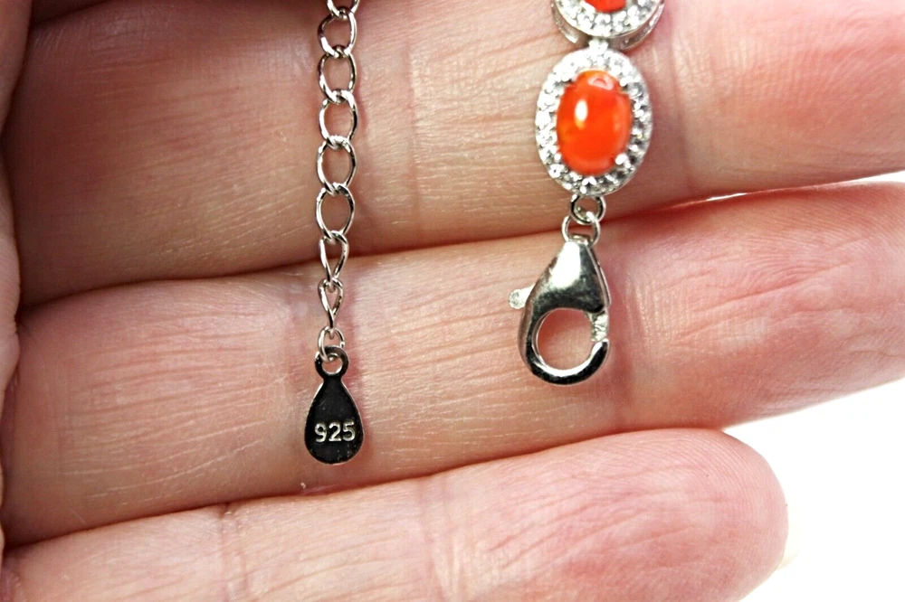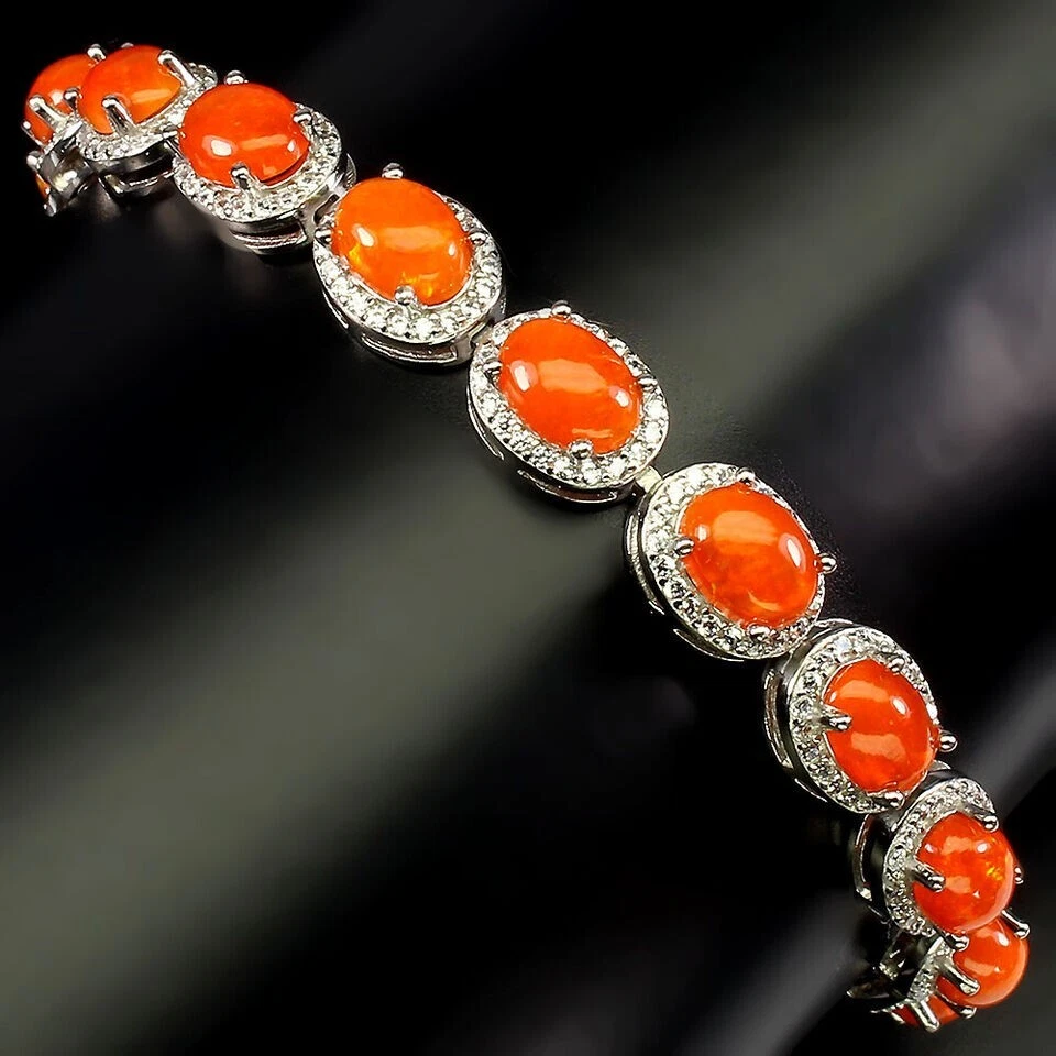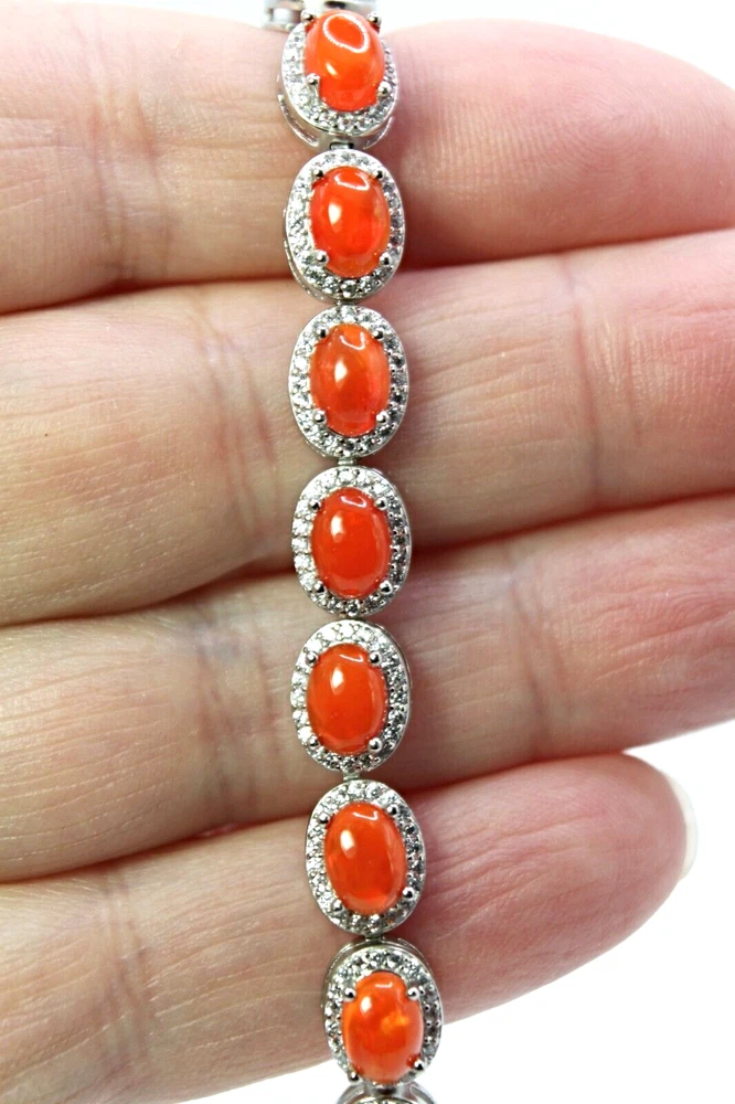 Solid sterling silver 925 stamped white gold coated bracelet featuring genuine natural mined oval cabochon orange fire opal gemstones each measuring 7mm x 5mm each individaully set within a border of 1mm x 1mm bright white round cut faceted lab created zircon stones. The bracelet measures 16.5 to 21.5cm 6 1/2 inches but can be fastened up to 8 1/2 inches using the integral extender chain. Total weight 14g / 9.48 carats GIFT BOXED Thanks for looking and please take time to view my other listings #18063