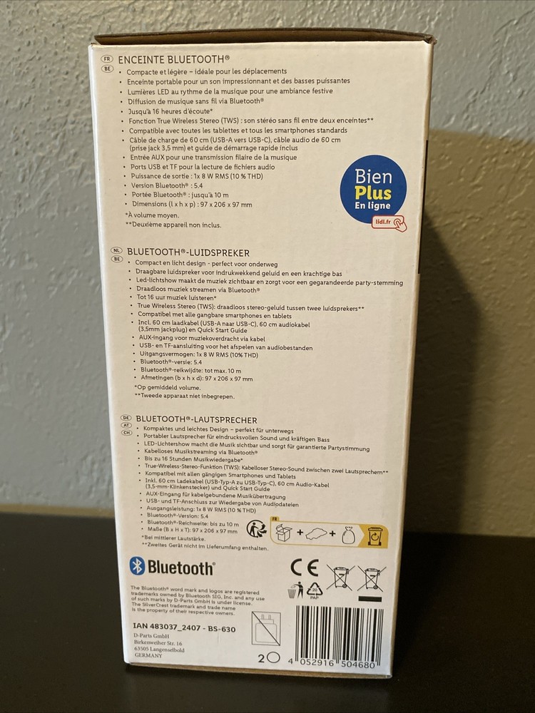 The SILVERCREST Basic Bluetooth Speaker is a portable and compact cylindrical speaker with a built-in microphone. It features LED lights for added ambiance and a 16-hour playtime on a single charge. This speaker is powered by a rechargeable battery and can be paired with other devices for a seamless audio experience. With its sleek design and lightweight construction, it is perfect for travel, outdoor use, parties, and at-home enjoyment. The speaker also comes in a stylish black color and has a wireless range of up to 33 feet.