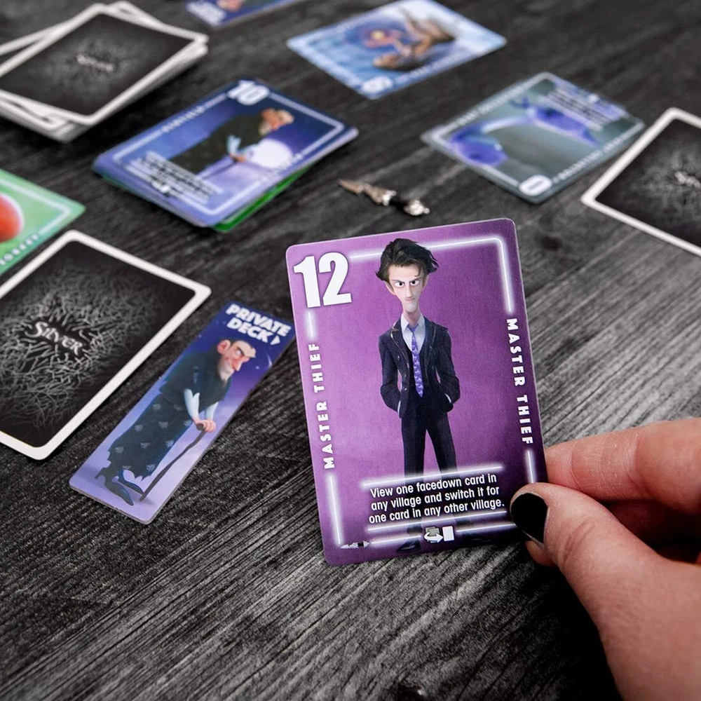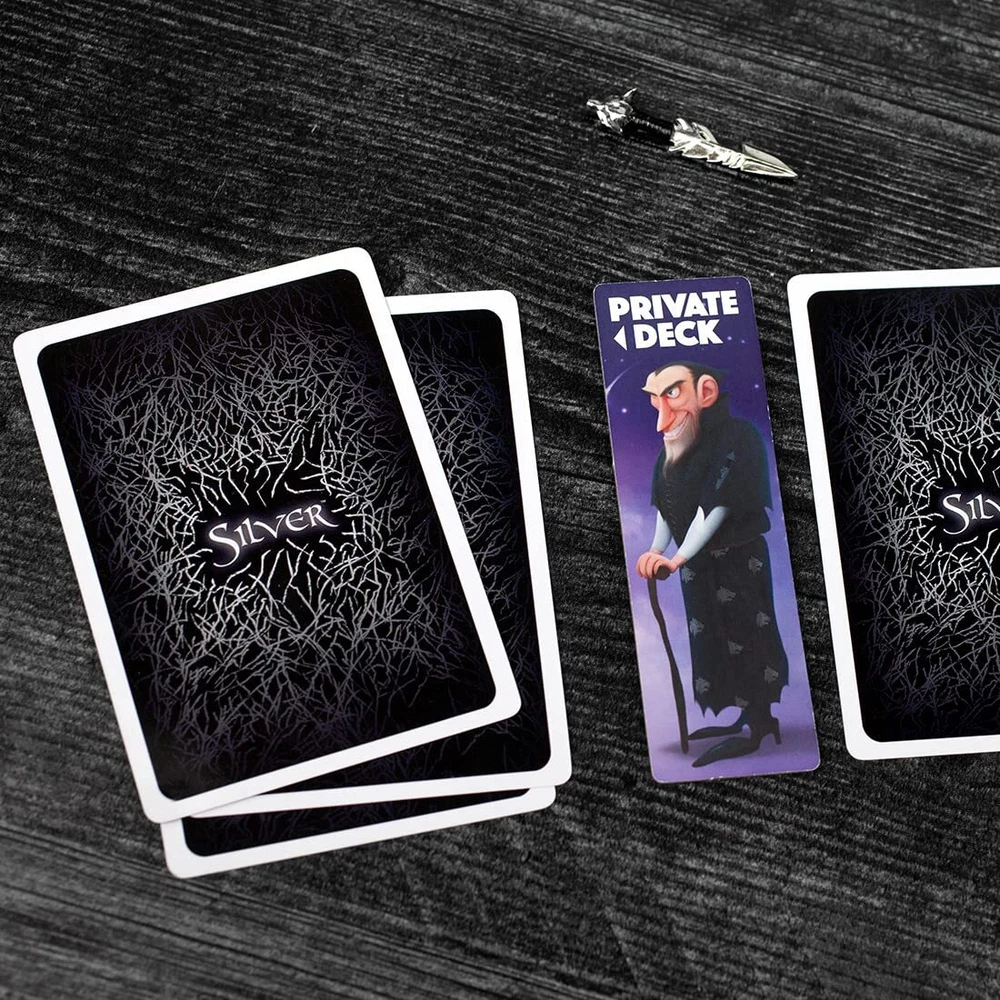 Introducing Silver Dagger: the thrilling fourth installment in the Silver Series! Immerse yourself in these quick and engaging card games with an exciting twist of memory and werewolves! Silver Dagger brings you 14 fresh roles and abilities that will inject strategic twists into your gameplay. Keep an eye on the #4 Zombie cards, which present a particular challenge by making it tricky to get rid of them. Zombies can't be placed atop the discard pile, and they must be faceup to pass them to the previous player. But fear not, helpful roles like the Debt Collector, deducting points from your opponents based on their card count, and the game-changing Halfling, with the power to halve your entire score, offer strategic advantages. Just like in other Silver games, your goal is to for a vote when you believe you possess the fewest werewolves lurking in your village. But beware! Your opponents have last chance to save themselves or disrupt your plans. Elevate your gaming experience with Silver Dagger, a perfect addition to the Silver Series! Easy to learn, quick game play and perfect for families! Must have for card game fans, complete with strategy, memory elements, and twists! Strategic gameplay through unique abilities and acquire the Silver Dagger secret for success Thrilling werewolf hunt in a fast, and fun card game! Mix and Match for fun replayability! Discover the versatility of the Silver series by combining games.