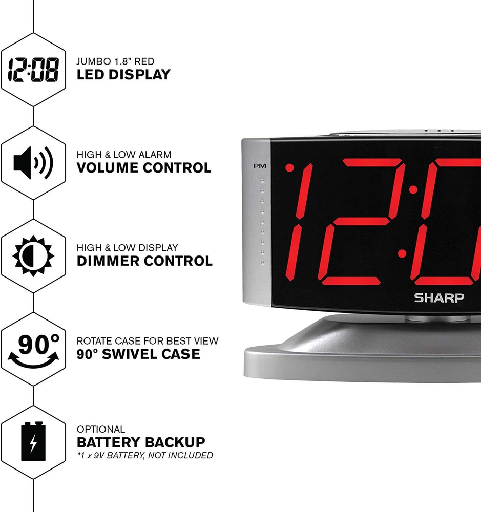 EXTREMELY SIMPLE TO OPERATE - The cool clock has been designed with absolute simplicity in mind! Easy for boys, girls, toddler, kids, teens, seniors and the elderly. LOUD ALARM AND SNOOZE - The bedside alarm clock comes with one of the loudest alarms available which can be set at Low or High in volume. There is also a 9 minute snooze that can be continually pressed until the alarm itself is switched off JUMBO ILLUMINATED LED DIGITS WITH HIGH/LOW BRIGHTNESS - The red numbers on the clock are very clear with extra bright quality, easy to see! If desired, there is a high/low option to set the brightness to your own personal comfort level. AC 120V ELECTRIC POWERED, WITH BATTERY BACK UP - To power the clock, just plug the power cord into a standard US 120V outlet (do not use with 240V) and you are good to go. Use one 9V battery for back up in case of a power outage. During battery back up the screen goes blank but alarm and time settings are retained and the alarm will still sound. Product Description The bedside alarm clock comes with one of the loudest alarms available which can be set at Low or High in volume. There is also a 9 minute snooze that can be continually pressed until the alarm itself is switched off. The red numbers on the clock face are very clear with extra bright quality, easy to see! If desired, there is a high/low option to set the brightness to your own personal comfort level. During battery back up the screen goes blank but alarm and time settings are retained and the alarm will still sound. To power the clock, just plug the power cord into a standard US 120V outlet (do not use with 240V - see instructions) and you are good to go. Use one 9V battery for back up in case of a power outage.