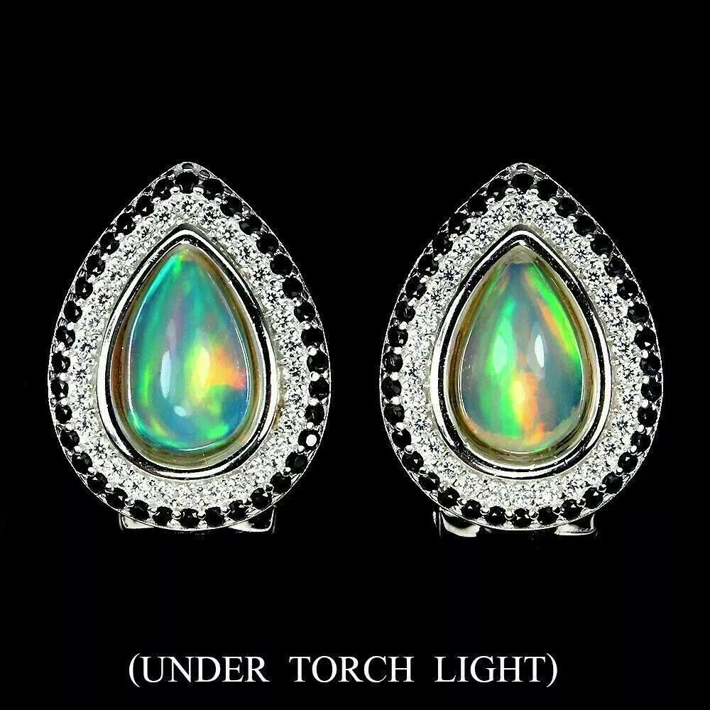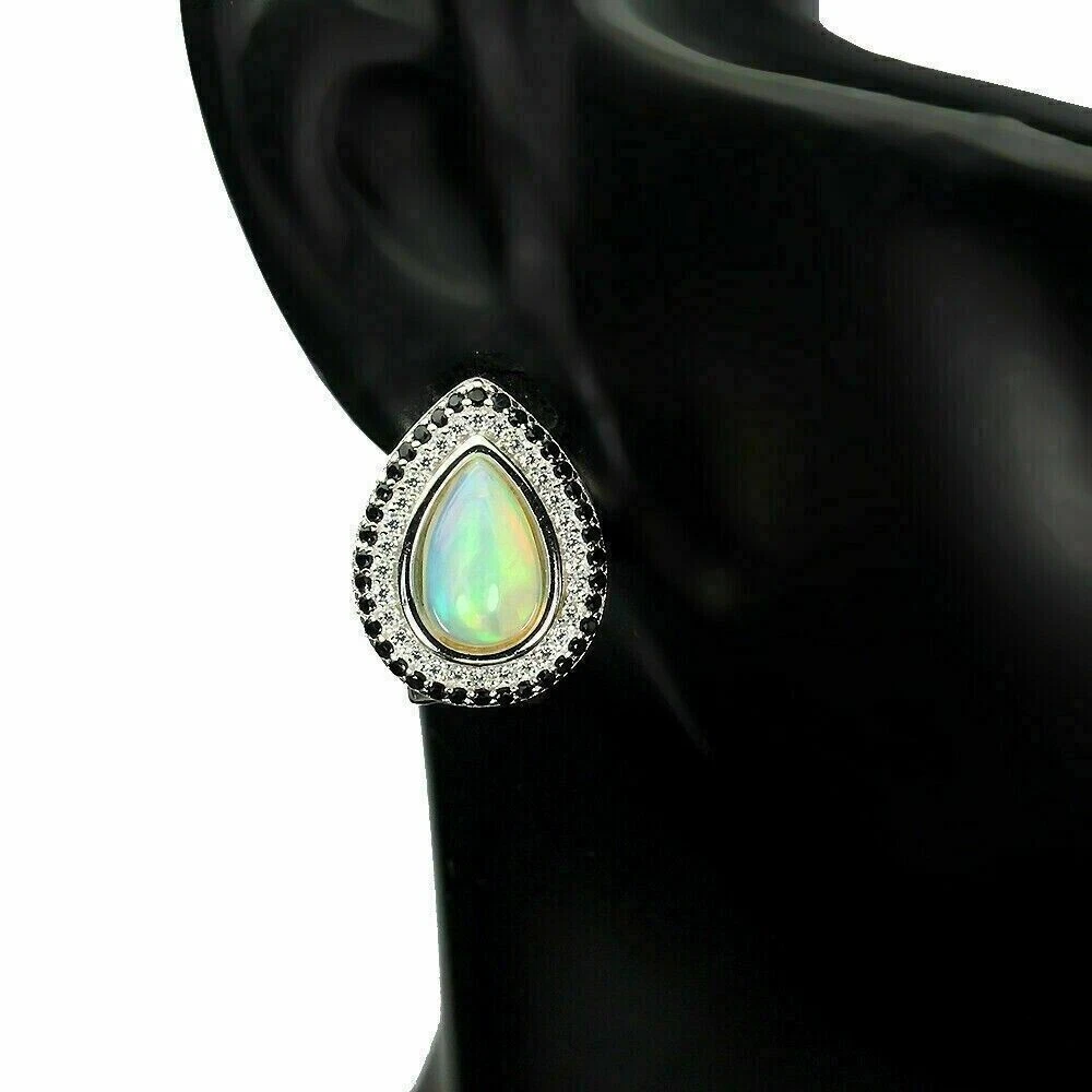 Solid sterling silver 925 stamped white gold coated stud earrings featuring a central pear cabochon genuine natural mined white opal gemstone with rainbow colours measuring 9 mm x 6mm surrounded by a row of 1mm x 1mm bright white round cut faceted lab created zircon stones which are then surrounded by a row of 1mm x 1mm genuine natural mined black spinel gemstones each measuring 1mm x1mm. The earrings measure 16mm x 12mm and have an english lock fastening. GIFT BOXED Thanks for looking and please take time to view my other listings #16216 / 16217