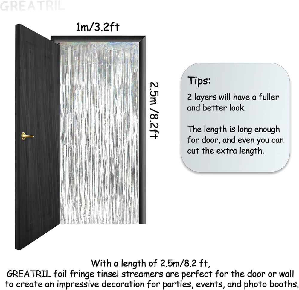 Store New Arrivals Add to Favorite View Feedback Contact Fast deliveries to the customer's home Quality customer service John Make the customers happy! Silver Foil Fringe Tinsel Backdrop - Metallic Tinsel Streamers Curtains for 2026 Nye/Prom/Dancing Ball/Christmas/Bachelorette Party Decorations - Pack of 2 Description Pack of 2, Greatril 3.2 ft x 8.2 ft Silver metallic tinsel Foil fringe curtain. Wide application: This Silver Streamer foil Curtain is used for birthdays party, prom, cocktail, graduations, weddings, ceremony, Christmas, bridal show, etc. Sparkle and bling will definitely create a Shiny nice atmosphere for your party. Durability: GREATRIL Foil fringe streamers are sturdy and flexible PET, making them resistant to breaking or tearing. Thickness 0.4mm: GREATRIL Foil fringe curtains are thicker and heavier, which means they are less likely to wrinkle or crease, making them durable and long-lasting. Easy to Use: Tear off the back of the adhesive tape, then paste this fringe curtain on the top of the wall, window, table or anywhere you like to light up your party. It’s your choice, hang each individual tinsel fringe curtain in different locations or double layers for a fuller effect. Silver tinsel party backdrop for Christmas decorations. silver sequin tinsel curtain for party decorations. Silver photo backdrop for prom dancing ball decoration. Product description NYE party Sliver Party Decor Silver backdrop perfect for birthdays party, NYE party, prom, and anniversary celebrations. 1 Silver Party 2 Birthdays Party 3 New Years Party 4 Snowflake Party Silver Party Decoration Silver Tinsel Curtain Party Backdrop You can use it at the following parties: Dancing ball decorations; Graduate themed party decorations; Prom decorations; Birthdays themed party decorations; Christmas themed party decorations; New years eve party decorations; Bachelorette party decorations; Snow themed party decorations; Winter party decorations. When you hung in a doorway or hang a few of them side-by-side on your wall to create a shimmering streamer curtain. The video showcases the product in use. The video guides you through product setup. The video compares multiple products. The video shows the product being unpacked. silver party backdrop Merchant Video Sliver Foil Curtain Party Photo booth Backdrop Silver Christmas Backdrop You can use it at the following parties: new years party; snow themed party; winter party; space themed party; alien themed party; christmas party. Birthdays Party Backdrop Sparkle and bling will definitely create a Shiny nice atmosphere for your party. Enjoy this beautiful moment with your family. More Colors Add to Cart Customer Reviews 4.6 out of 5 stars 8,514 4.6 out of 5 stars 8,514 4.6 out of 5 stars 8,514 4.6 out of 5 stars 8,514 4.6 out of 5 stars 8,514 4.6 out of 5 stars 8,514 4.6 out of 5 stars 8,514 Price $11.99 $ 11 . 99 $9.99 $ 9 . 99 $8.99 $ 8 . 99 $12.67 $ 12 . 67 $9.99 $ 9 . 99 $9.99 $ 9 . 99 $9.49 $ 9 . 49 Color Silver Gold Black Silver Red Pink Purple Material foil foil foil foil foil foil foil Occasion party party party party party party party Size 3.2 ft x 6.5 ft 3.2 ft x 8.3 ft 3.2 ft x 8.3 ft 3.2 ft x 6.5 ft 3.2 ft x 8.3 ft 3.2 ft x 8.3 ft 3.2 ft x 8.3 ft Quantity 2 Packs 2 Packs 2 Packs 2 Packs 2 Packs 2 Packs 2 Packs Item model number GTFC Color Silver Product Dimensions 98.43 x 39.37 x 0.04 inches Item Weight 0.16 Kilograms Size 3.2 x 8.2 foot Product Care Instructions hanging gently ABOUT US We offer the best prices around on high quality products. Our E-store includes media such as books, movies, music and games while offering electronics, toys, sporting apparel, clothing, tools, general home, garden items and more. SHIPPING We are always working hard to ensure your package arrives as soon as possible. Please understand that some factors like weather, high postal traffic, and the performance of shipping companies are outside of our control. We offer free shipping to the lower 48 states and ship within 2 business days of payment, usually sooner. We do not accept P.O. Boxes. Please provide a physical address. For shipping outside of the continental USA, we only use eBay's Global Shipping Program. The item is shipped to KY and then sent to the rest of the world. International customers are responsible for all duties and taxes. Continue to 'check out' to calculate costs for shipping the item to your country. Messages regarding eBay's Global Shipping Program MUST be directed at eBay EXCLUSIVELY. RETURNS We offer a 30-Day Return Policy on items in which you are not completely satisfied with. You have the option of a full-refund or an exchange of the item. No returns are available on items shipped outside of the USA PAYMENT We accept PayPal. CONTACT US This page content is yet to come Please ad us to your favorite seller and visit again later Thank You CUSTOMER SATISFACTION We try our very best to make sure every customer is completely satisfied. If there's a problem, message us! We're happy to help. WE ACCEPT