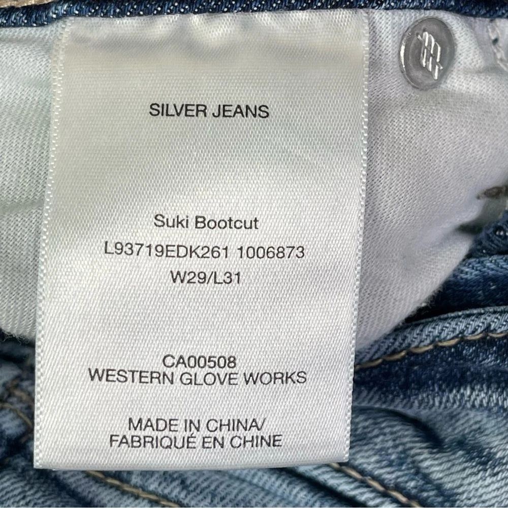 Vintage: No Fabric Type: Denim Country/Region of Manufacture: China Notas del vendedor: “In excellent, pre-owned condition with no flaws to note.” Rise: Mid (8.5-10.5 in) Estado del artículo: Usado Department: Women Type: Jeans Waist Size: 29 in Season: Fall, Spring, Summer, Winter Features: Stretch Brand: Silver Jeans Theme: 90s, Bohemian, Festival, Grunge Color: Blue Inseam: 29.5 in Accents: Logo Material: Cotton Blend Personalize: No Size Type: Regular Closure: Zip Style: Bootcut Model: Silver Jeans Suki Size: 29 Fabric Wash: Medium Garment Care: Machine Washable Fit: Regular Pattern: Solid Pocket Type: 5-Pocket Design Handmade: No
