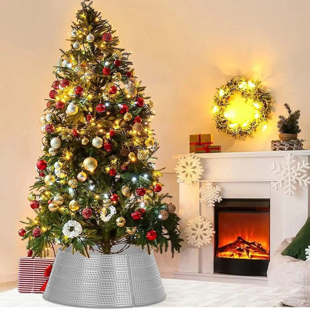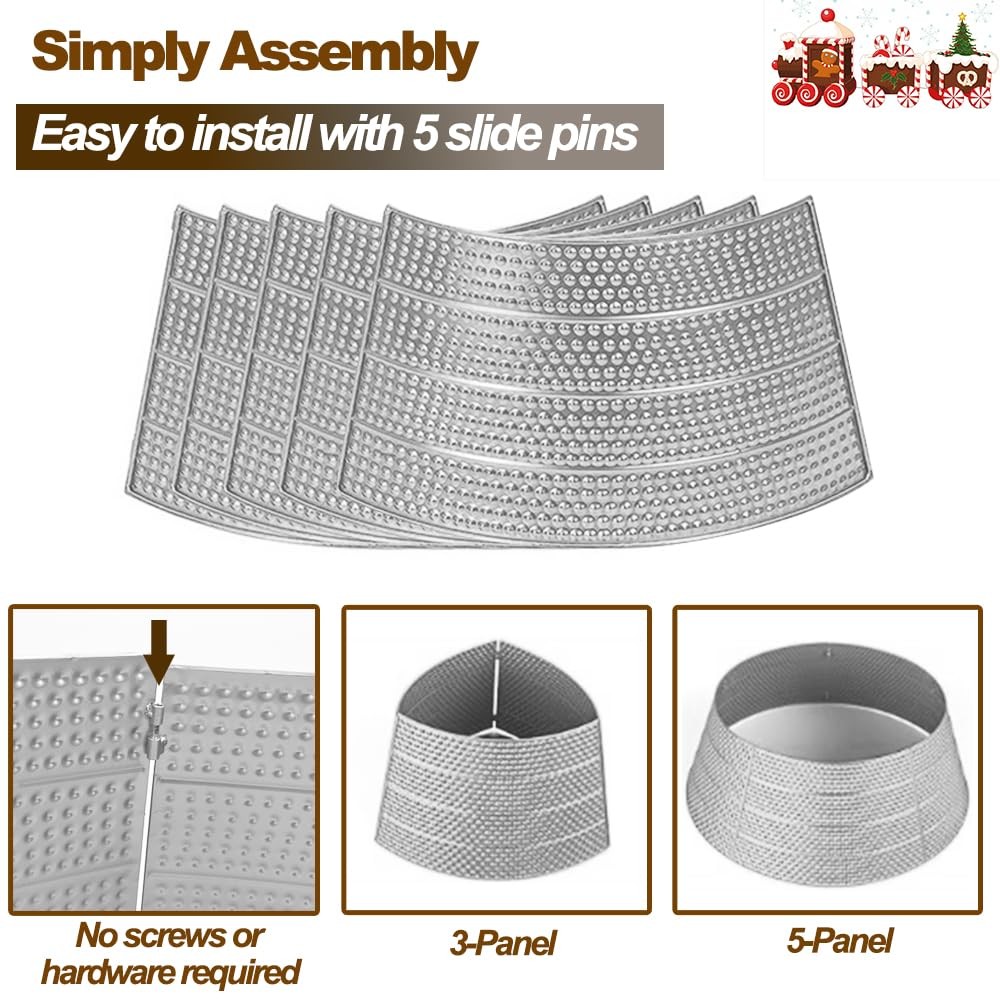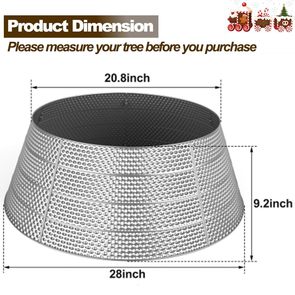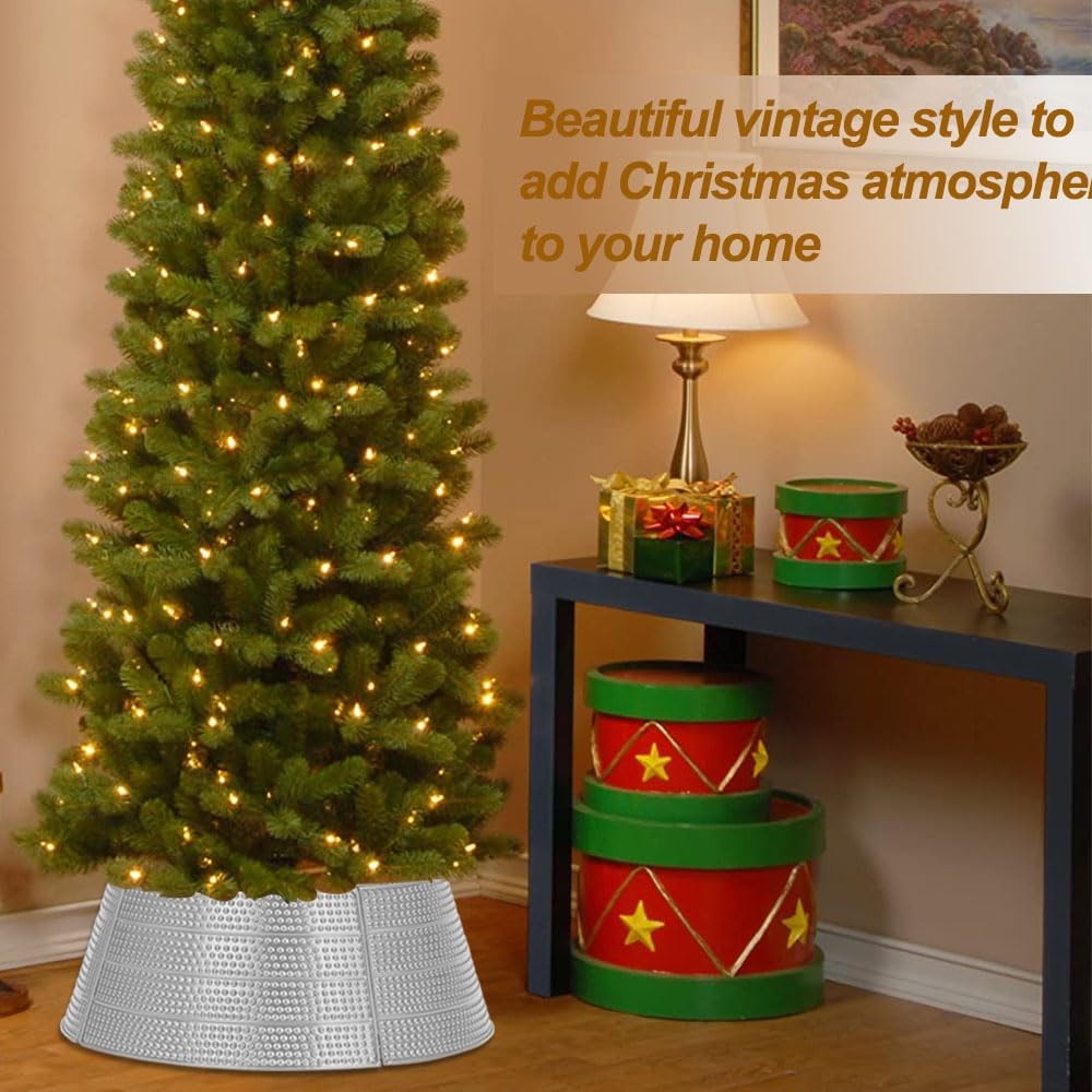 Elegant Finish:Elevate your Christmas decor with our metal tree collar, handcrafted tree collar features a stunning Silver/ golden finish with Silver/ Gold Bubble texture, perfect for a festive look. Christmas tree collar Dimensions: Height: 9.2”. Top Diameter: 20.8”. Base Diameter: 28”. Weight: 6 lbs.Fits most Christmas tree stands. Whether you have a slim, pencil, or large artificial tree, our collar complements it beautifully. Easy Assembly and Storage: This christmas tree collar featuring a unique design with 5 panels.The easy-to-assemble pin feature allows you to build the Christmas tree collar quickly and easily. No need latches or tools, installs in just 2 minutes. Versatility Meets Style:christmas tree collar designed to keep curious pets from chewing or drinking tree water, ensuring a safe and merry holiday for all. It does't require washing or wrinkle removal like traditional fabric tree skirts, making it easy to care for. Christmas Tree Decoration: Round decor seamlessly conceals the base of artificial trees, offering a clean and polished look. Perfect for your traditional Christmas Tree skirt, It's shiny design and the combination of Christmas elements make it a must-have decoration for the holiday season.