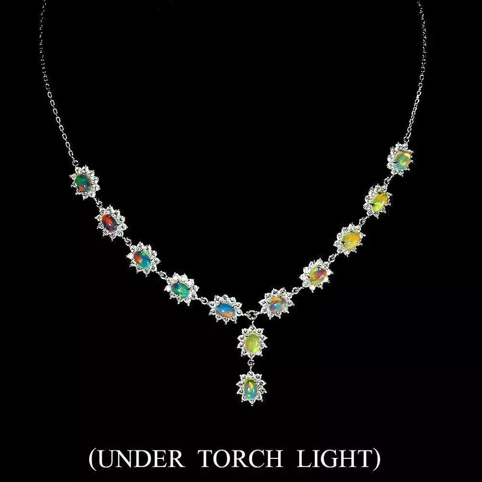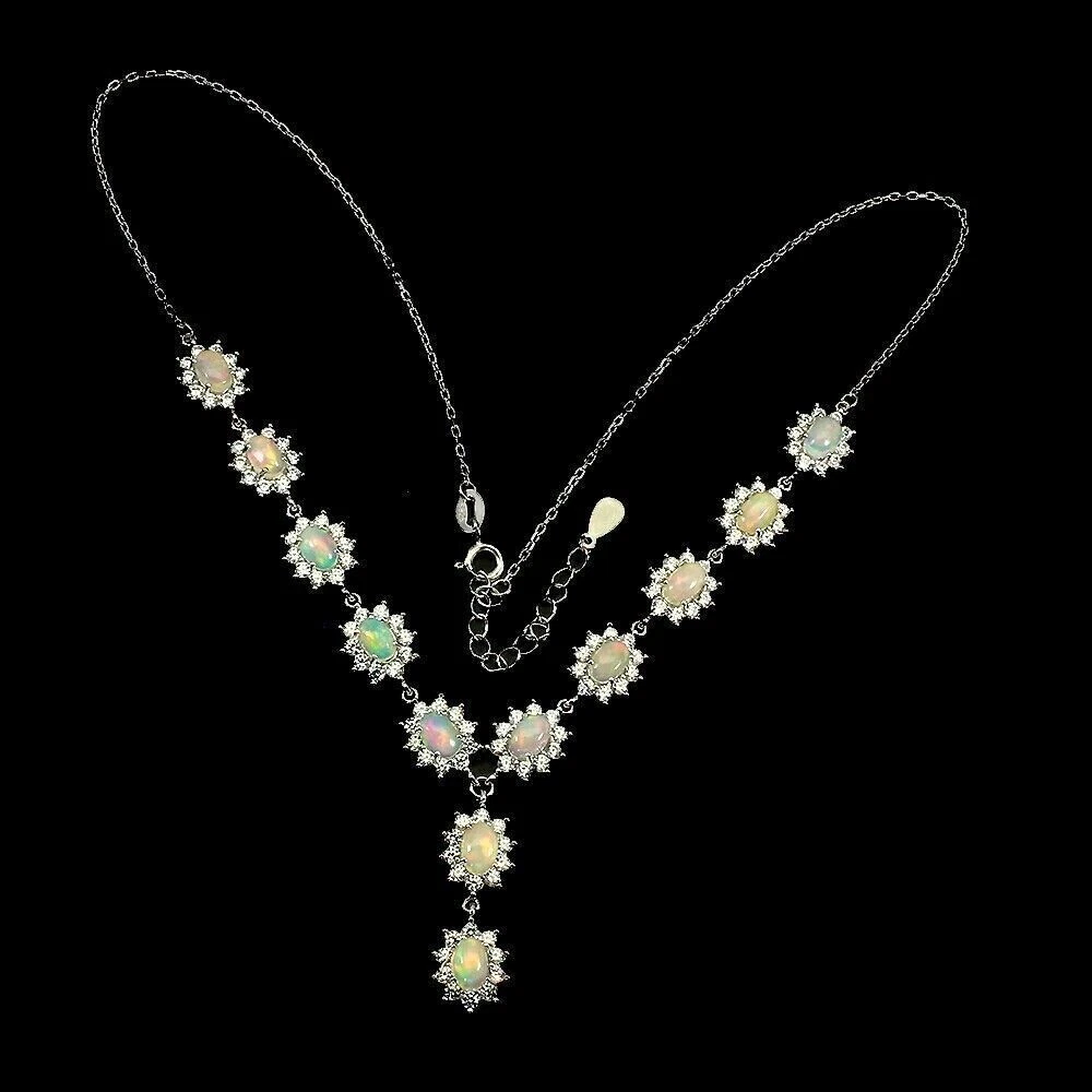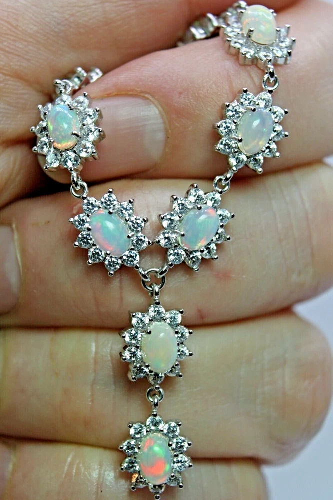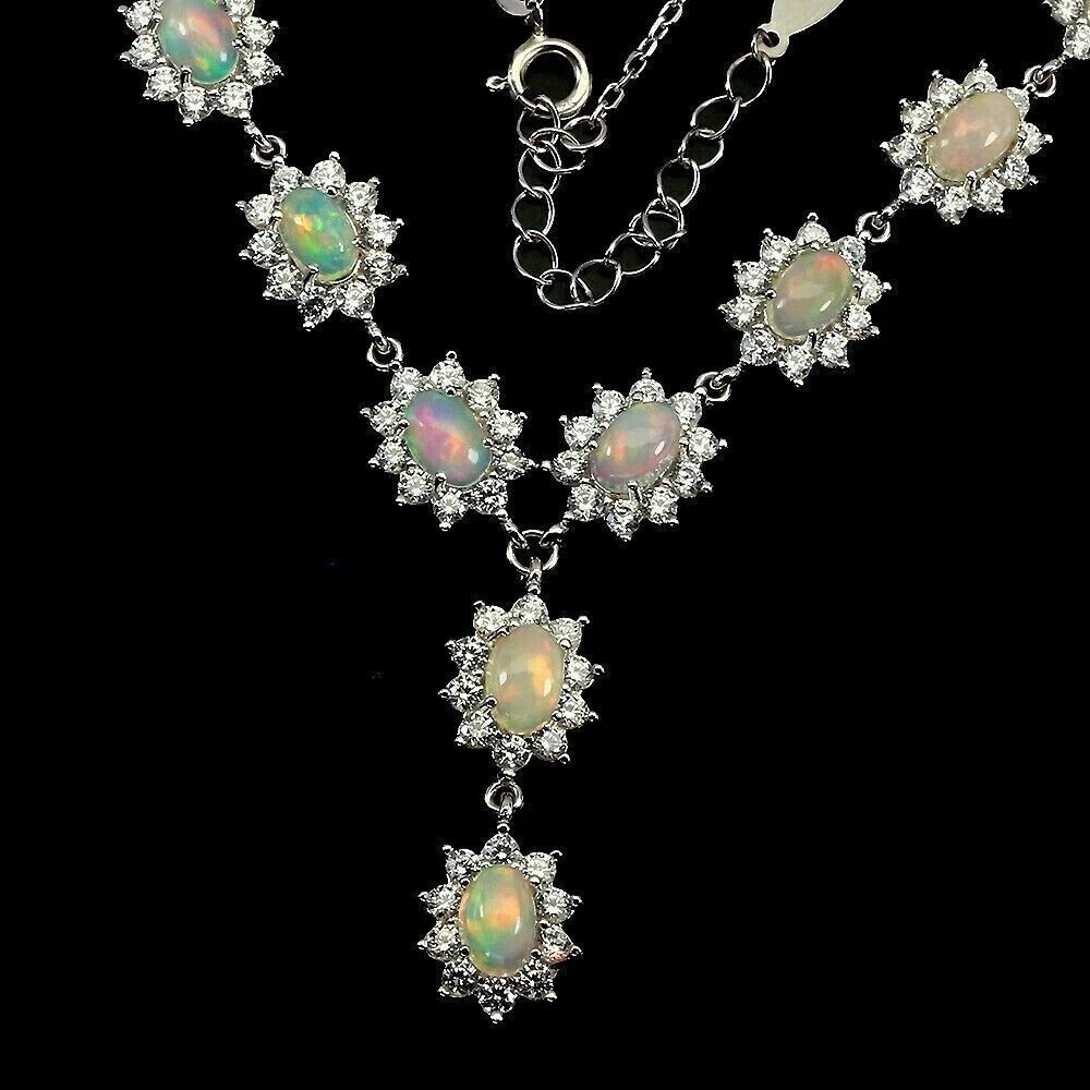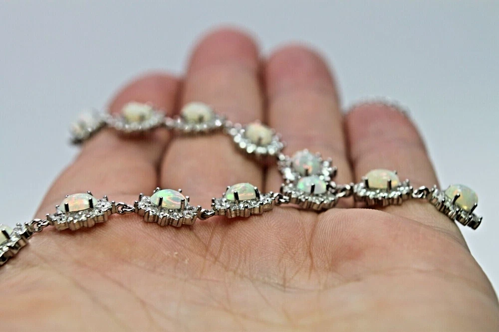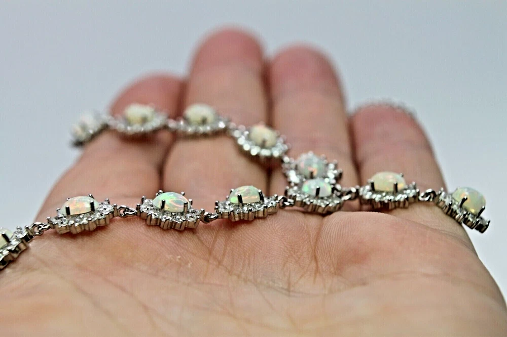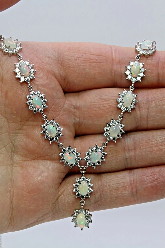 Solid sterling silver 925 stamped white gold coated necklace in a stylish design featuring oval cabochon genuine natural mined opal gemstones which are white with rainbow fire colour flashes each measuring 6mm x 4mm each individually set within a border of bright white round cut faceted lab created zircon stones each measuring 2mm x 2mm with the back of the necklace being a silver chain design. The necklace measures 39 to 44cm 15 1/2 to 17 1/4 inch using the integral extender chain . Weight 14g GIFT BOXED Thanks for looking and please take time to view my other listings #16654