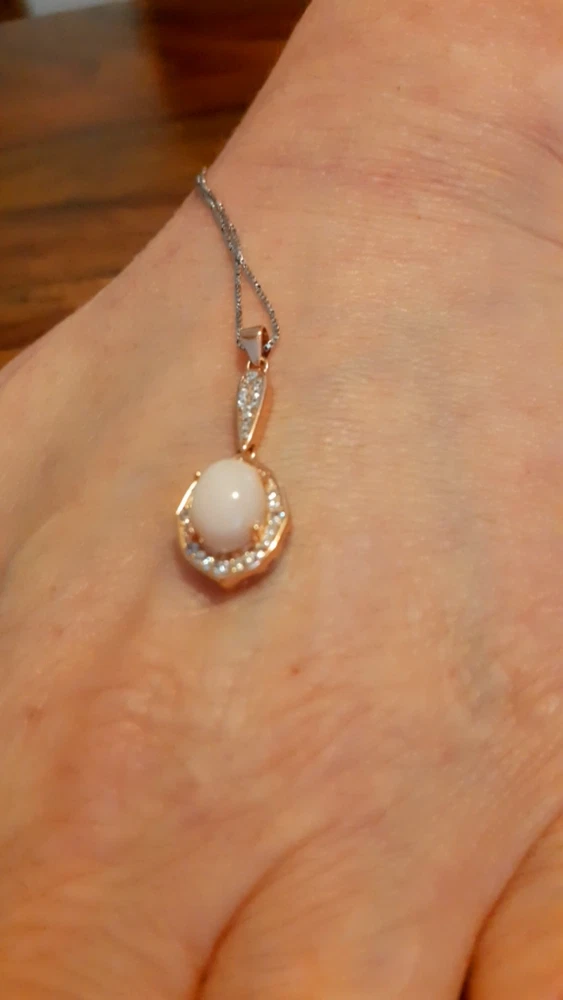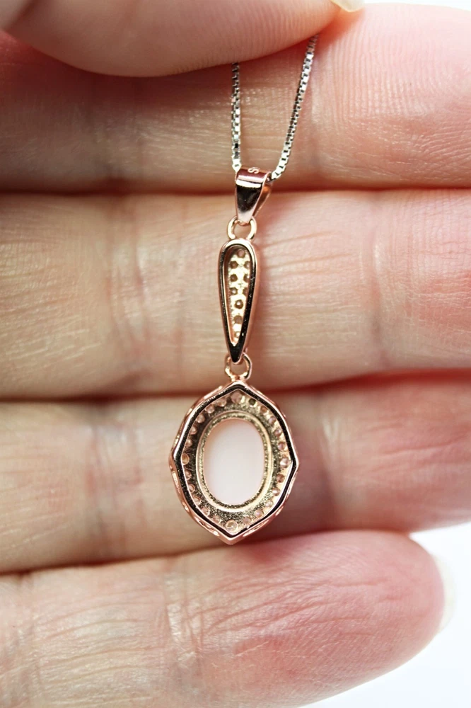 Solid sterling silver 925 stamped rose pink gold coated pendant featuring a genuine natural mined oval cut faceted pink opal gemstone measuring 9mm x 7mm set within a border of 1mm x 1mm bright white round cut faceted lab created zircon stones which continue along the bale measuring up to 1.5mm x 1.5mm. The pendant measures 33mm x 11mm including bale and comes complete with a free matching 45.7cm 18 inch rose pink gold coated chain. GIFT BOXED Thanks for looking and please take time to view my other listings #17615