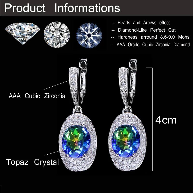 Silver Plated Oval Rainbow Fire Light Blue Crystal Huggie Drop Dangle Earrings Specifications : Condition: New Material: Cubic Zirconia Earring Size : 4 cm Features: 1. CZ Stone Material - Top Level Cubic Zirconia. Excellent Cut Simulated Diamond. Enjoy the Dazzling Sparkle from Cubic Zirconia Dangle Drop Earrings. 2. These Unique Dangling Drop Earrings are Suitable for Almost all of Sensitive Ears. These are the Top Cubic Zirconia Women Earrings for Daily Wear. 3. Suitable for Various Occasions: Ideal for Wedding, Prom, Pageant, Parties, Homecoming, Black Tie Formal Affairs, Holidays , Valentine's Day, Mother's Day, Christmas, Anniversary, Graduation, Birthday and Special Occasions. 4. a Perfect Jewelry Gift for Women , Bride , Bridesmaid , Mother ,Wife , Lover , Fiancee , Girl Friend . Package Includes: 1 Pair of Earrings Payment Delivery details Terms of sales & Feedbacks About us & Contact us Our commitment Payment 1. We only ship item to your Ebay verified address . Please Make sure all address are the same 2.Please leave note in ebay when making the payment if you have any special request (colors/size). Delivery details We only send items to the registered eBay address.Items will be shipped within 2 business days from the date payment is received (not include public holiday and weekend) . As per eBay regulations, import duties, taxes, and customs charges are the buyer's responsibility. Please check with your country's customs office to determine what these additional costs may be prior to bidding or buying. Terms of sales & Feedbacks After-Sale Please contact us to request a return/replace/refund authorization .It will be best if you use ebay message to contact me. 1, Return and replacement request is available only the requests within 30 days after parcel received. 2, Returning the item as the same condition as received. Situation and solution Defectives ---Please contact us and provide a photo of the defective part. After situation confirmed,we will offer you refund/return/replacement according to the situation Not as Described ---Please contact us and provide a photo of the wrong part. After situation confirmed,we will offer you refund/return/replacement according to the situation Not Received ---Please undersatnding shipping on the way was out of our control ,because of the busy shipping season,holidays,bad weather or force majeure etc. It may be delay for days. But if it took too much time and not deliveried, Please message me, I will offer you solution for it. Feedbacks 1. If you are satisfied with our service, please leave us a + Good feedback and rate the details of the transaction (DSR) with a. . When you rate the shipping time part please take international transit into consideration.] Your recognition will make us more confident to develop business and serve you better. 2. Please contact us first if you have any problem with the items,we will solve it in time ! 3. Please do not leave Neutral or Negative Feedback before you contact us, Thanks For Your Business ! About us & Contact us Working time: Chinese time(Eastern eight zones):Monday to Friday ,9:00 am to 6:00 pm. We do not work on chinese legal holiday. Message reply: We will reply all messages within 24 hours of business time. Please contact us via ebay message, it was the best way for both you and us to solve problems. Any questions or anything you need, please feel free to contact us. Our commitment 1.Wholesale price will be offered to you if you need in bulk ! 2.About Size